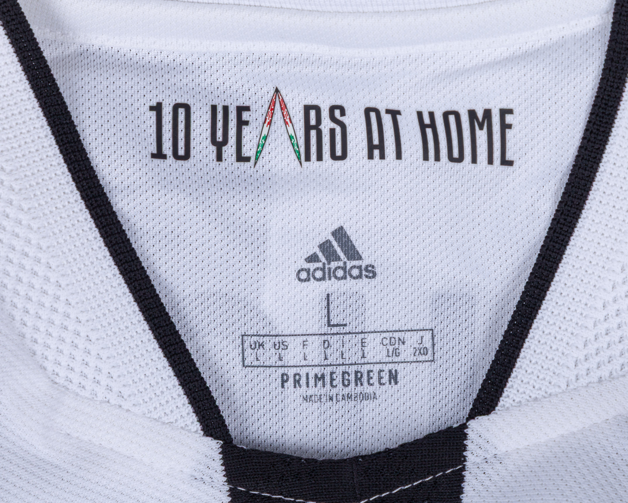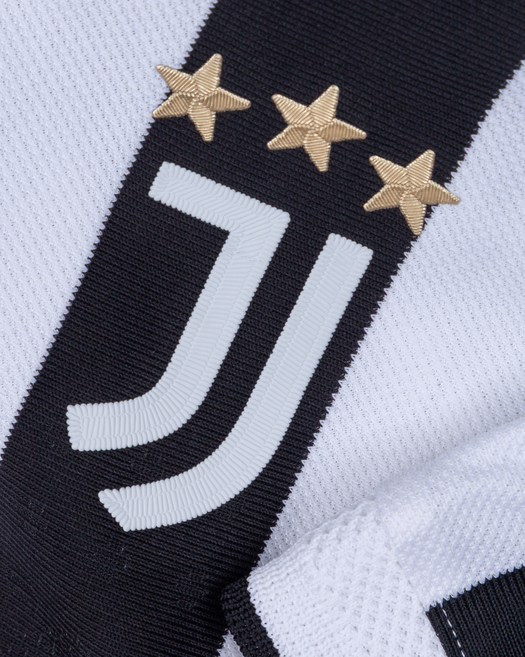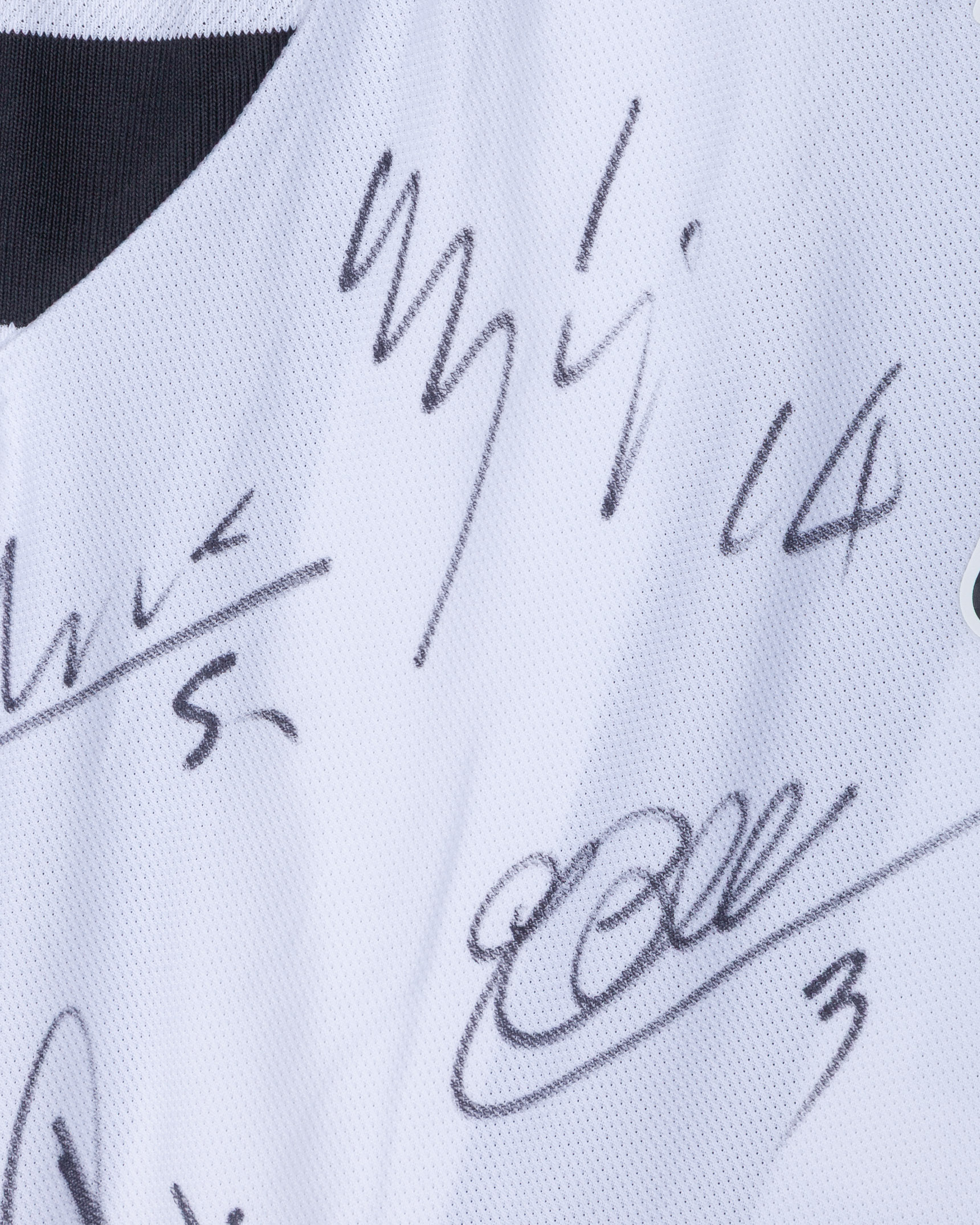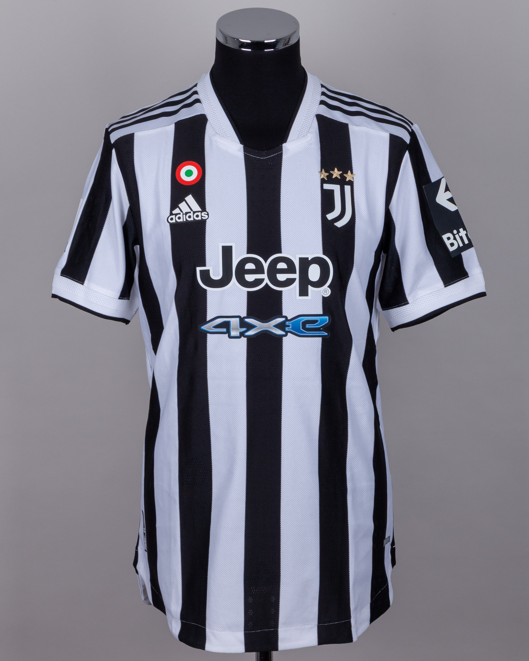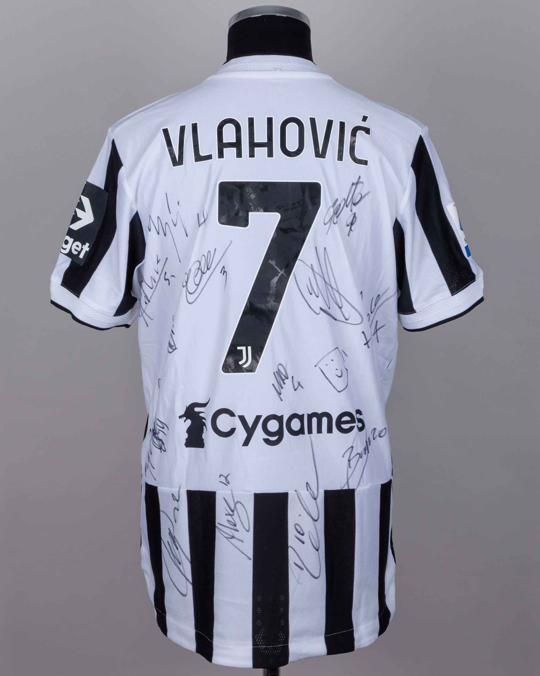 Dusan Vlahovic white and back No.7 Juventus autographed short-sleeved shirt, 2020-21, Adidas, L, with v-neck style collar and printed badge, the reverse lettered VLAHOVIC, the right sleeve with Serie A flash, with approximately fifteen autographs