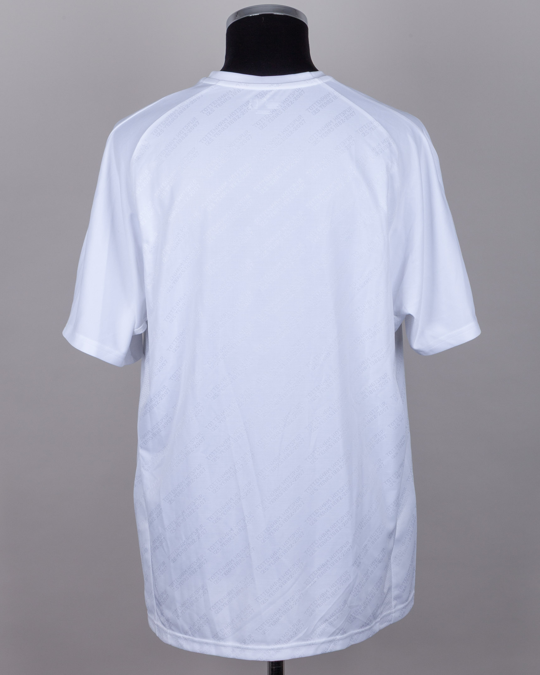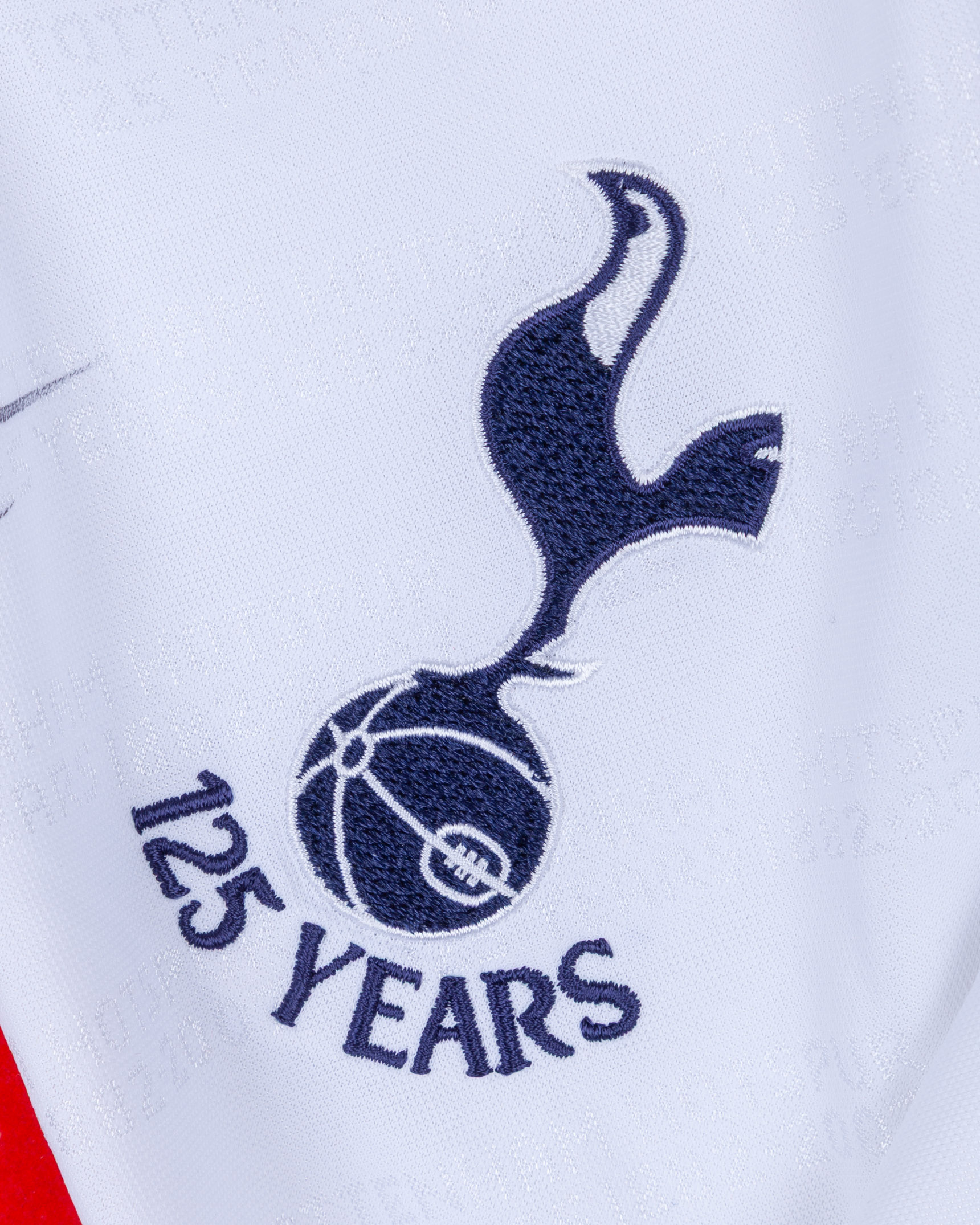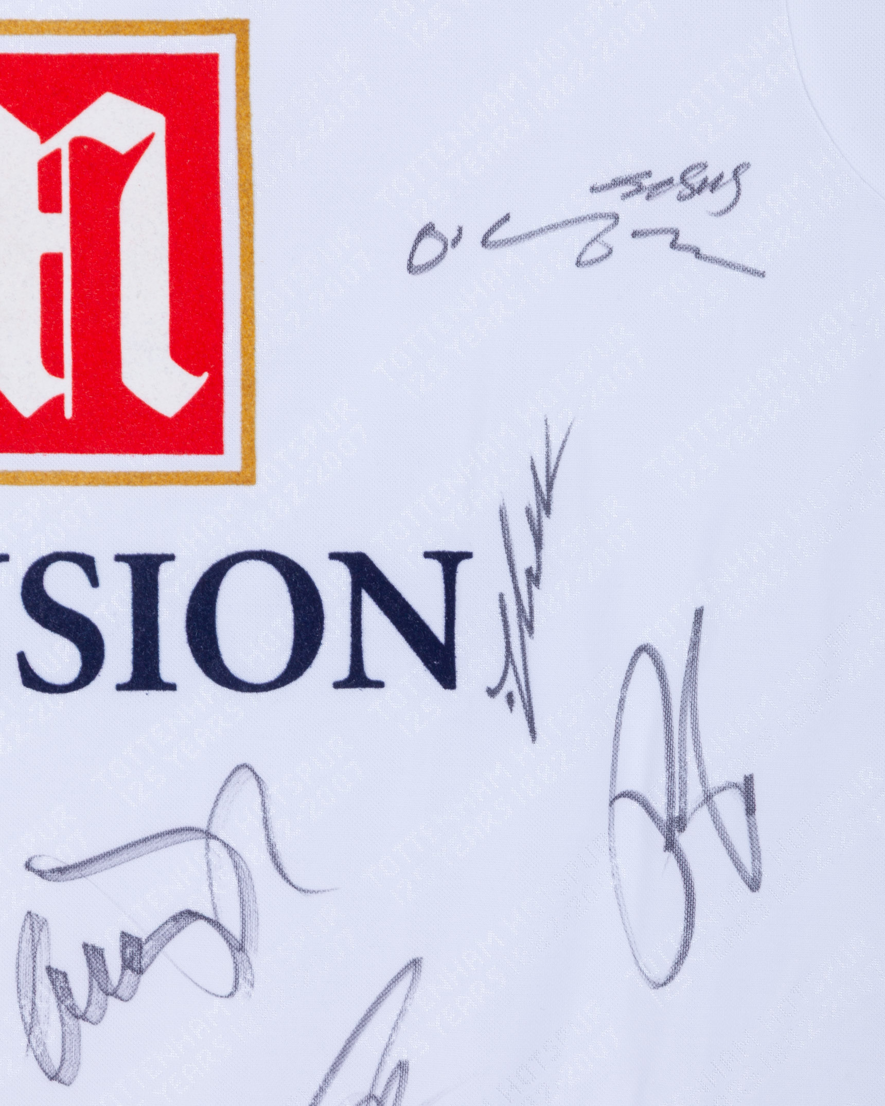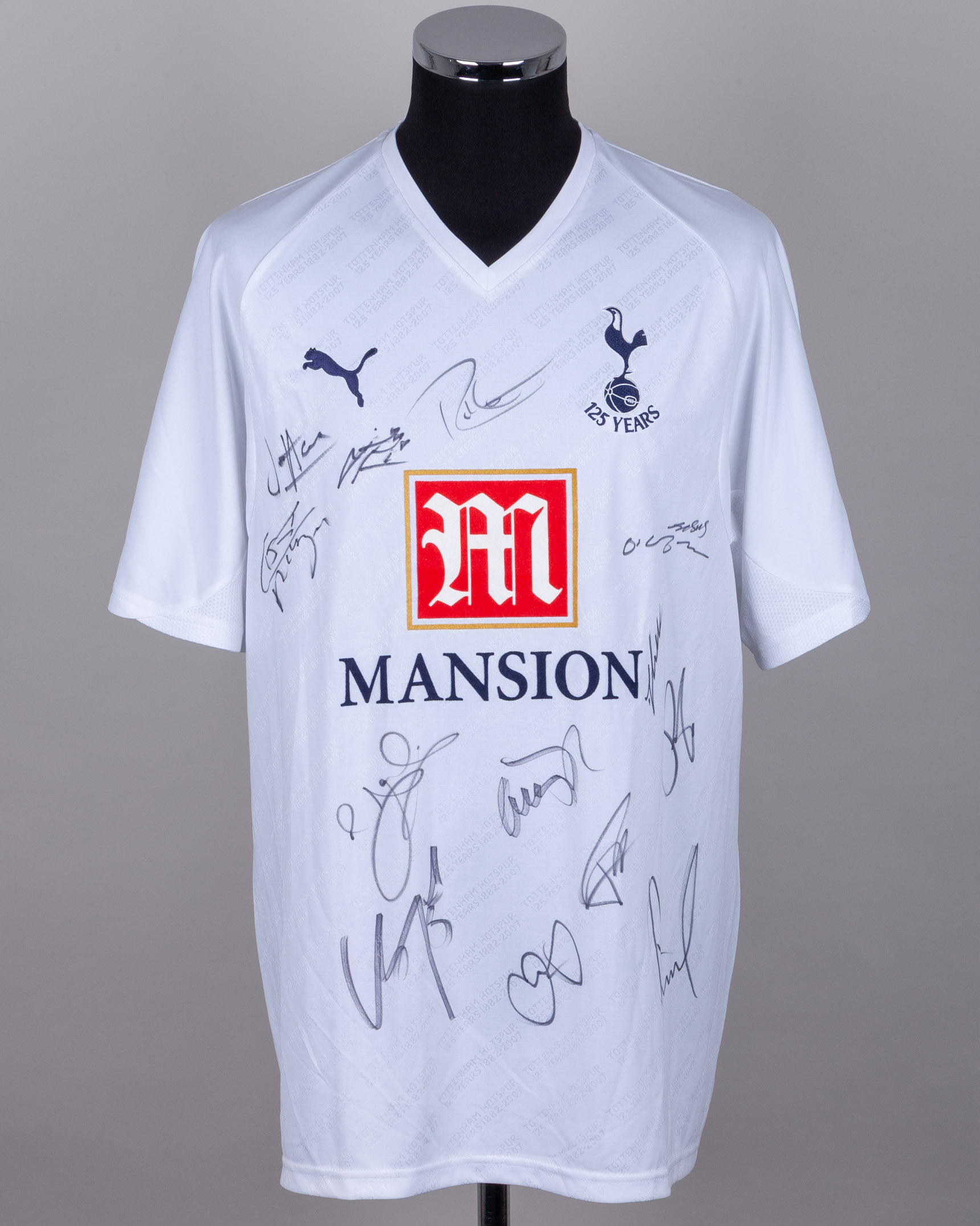 White Tottenham Hotspur autographed short-sleeved shirt, Puma, XL, with v-neck collar and embroidered badge inscibed 125 YEARS, with approximately thirteen autographs