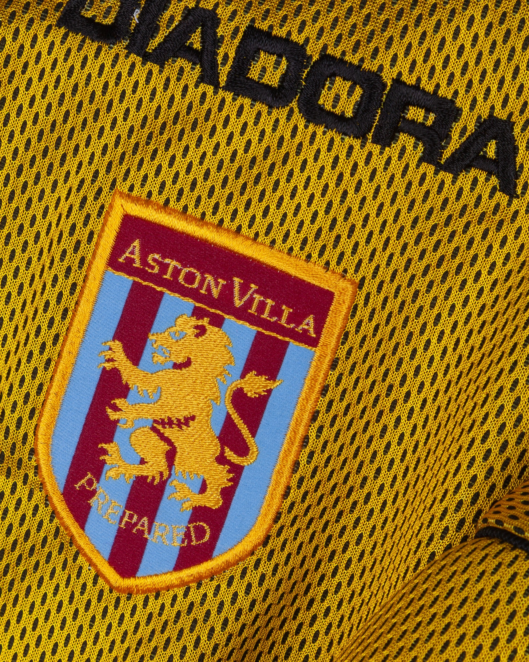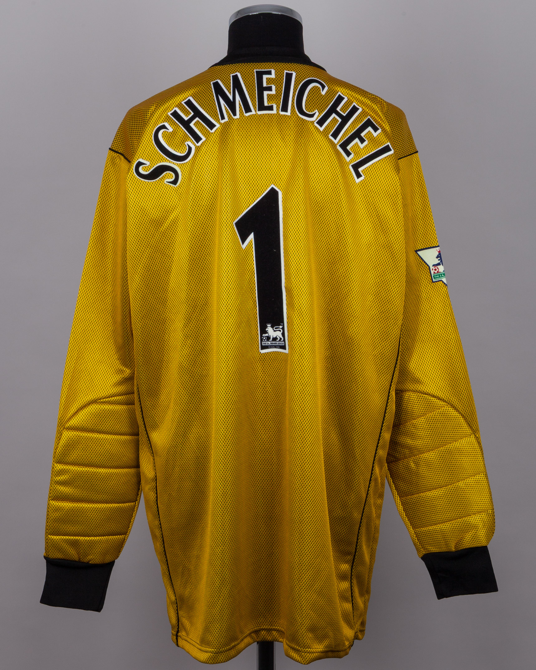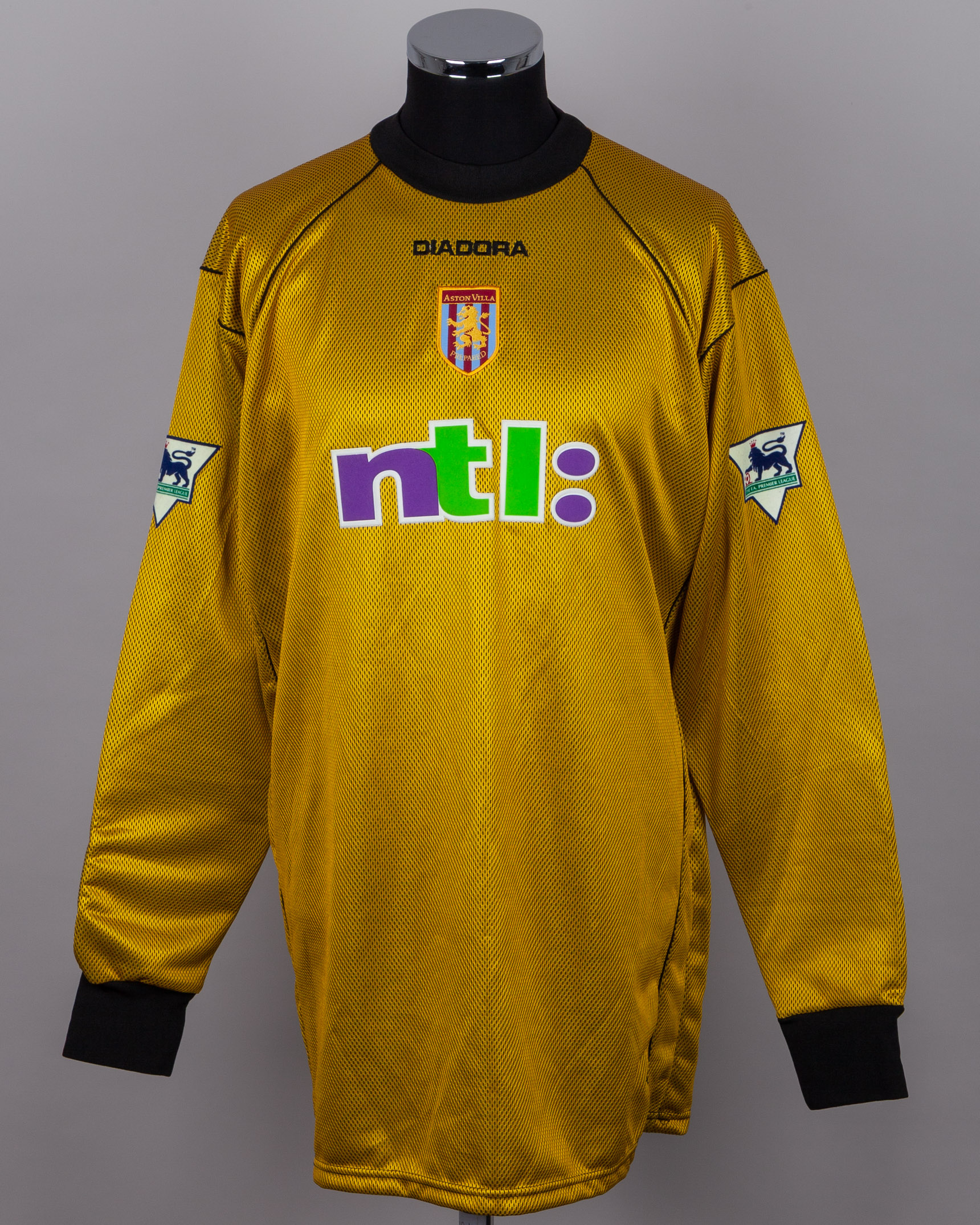 Peter Schmeichel yellow and black No.1 Aston Villa goalkeeper shirt, 2001-02, Diadora, 50/52, with crew-neck collar and embroidered badge inscribed ASTON VILLA PREPARED, the reverse lettered SCHMEICHEL, the sleeves with The F.A. Premier League flashes