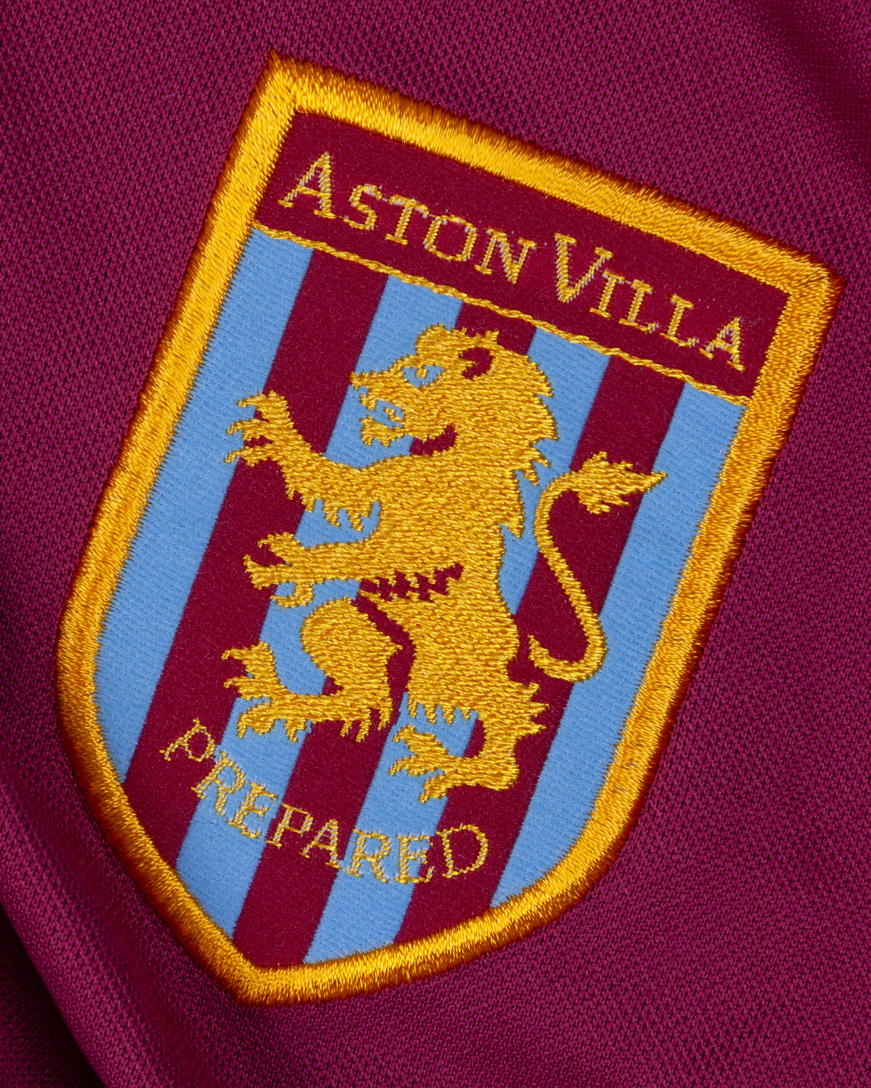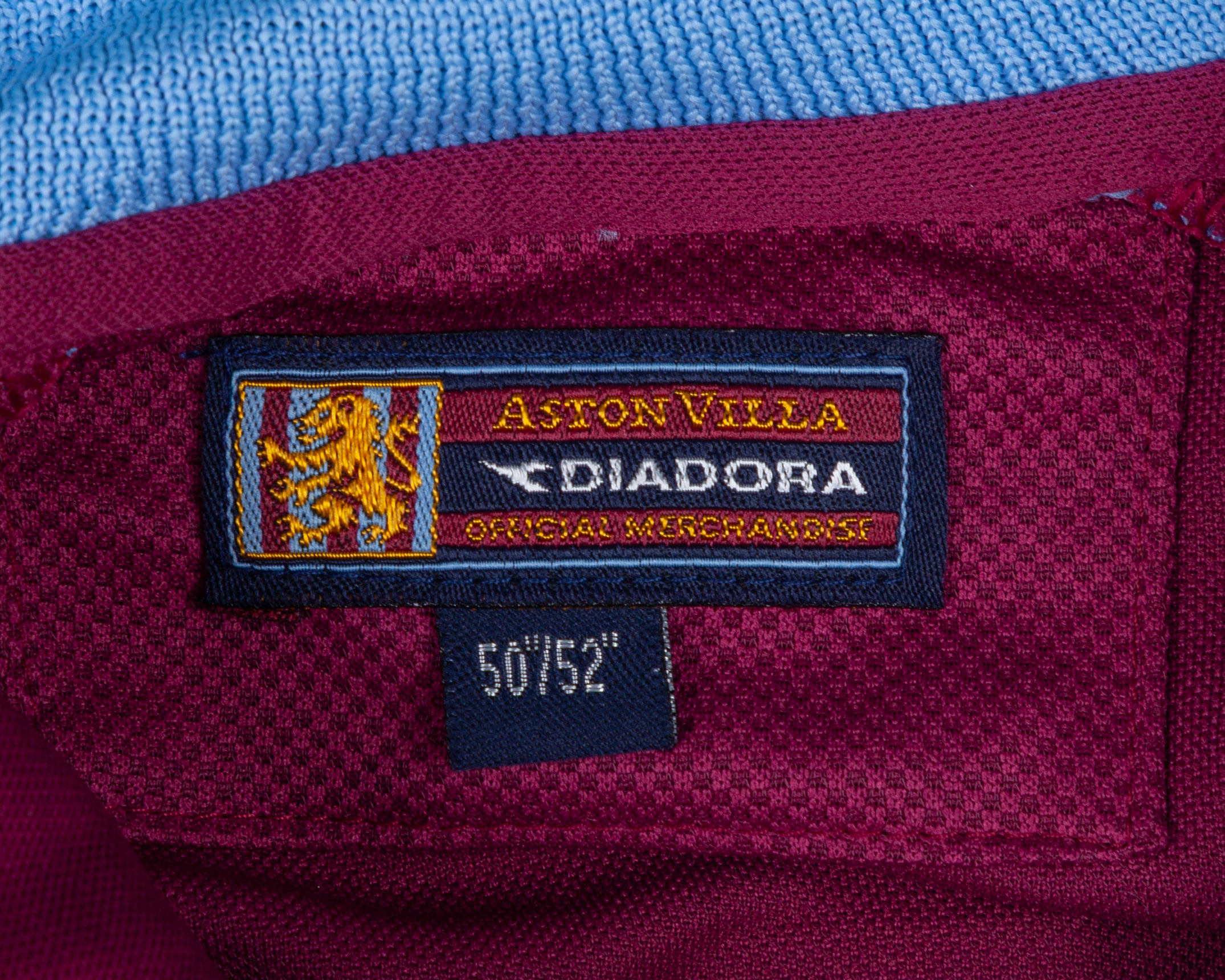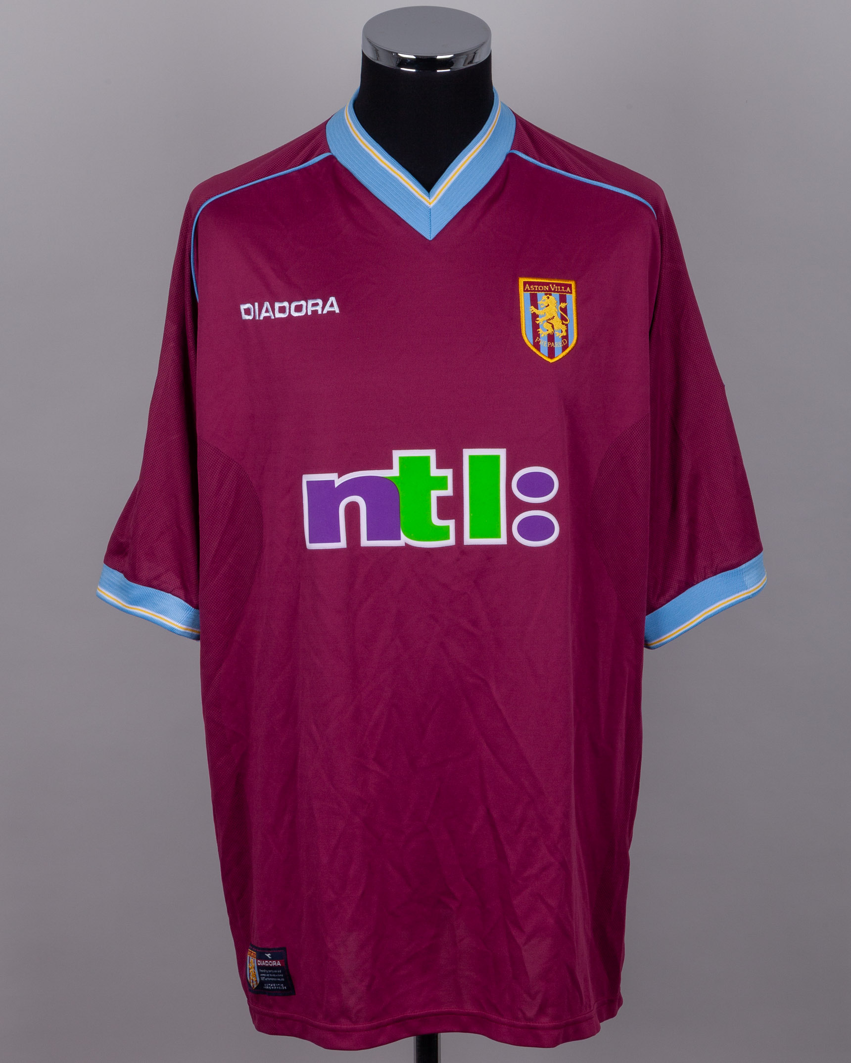 Dion Dublin claret No.9 Aston Villa short-sleeved shirt, 2001-02, Diadora, 50"/52", with v-neck collar and embroidered cloth badge inscribed ASTON VILLA PREPARED, the reverse lettered DUBLIN, the sleeves with The F.A. Premier League flashes