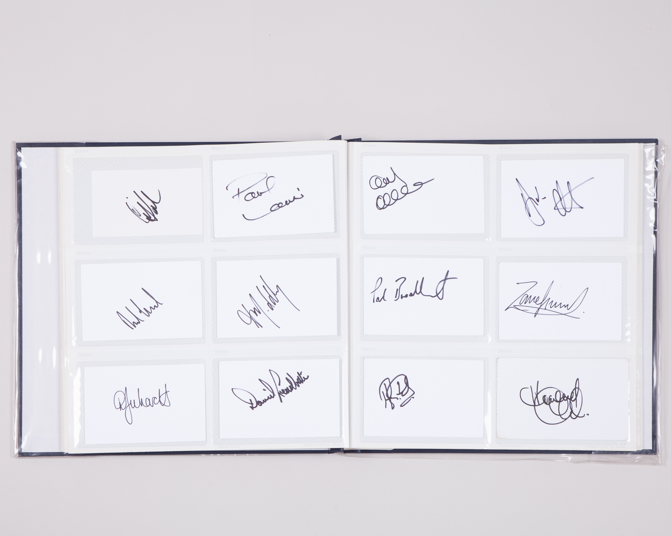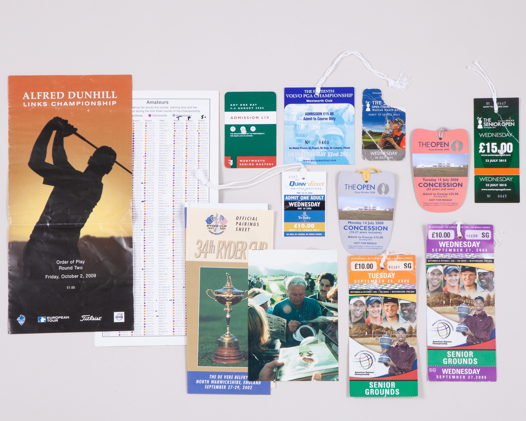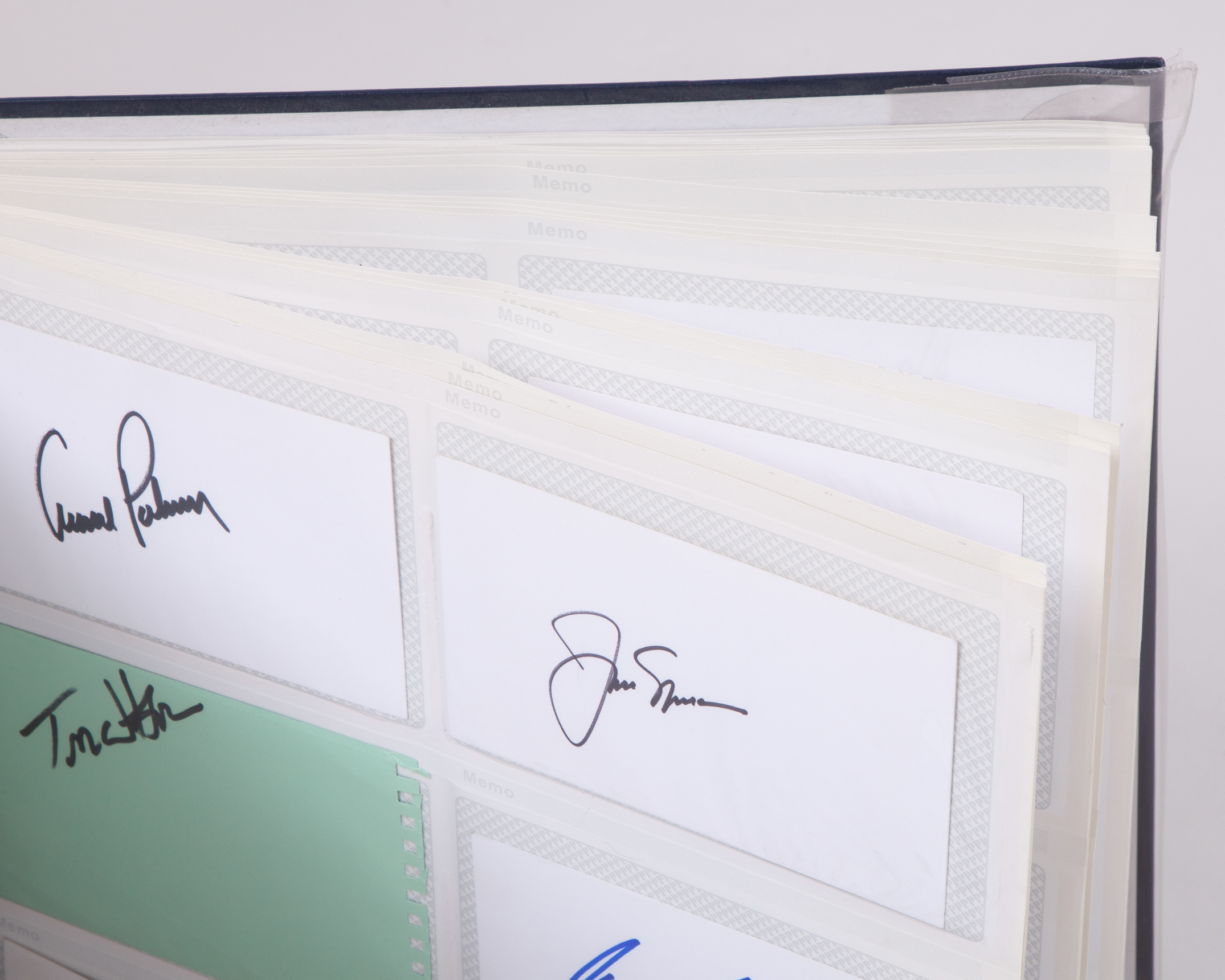 A large folder of golf autographs on card, including Tiger Woods, Nick Faldo and Arnold Palmer