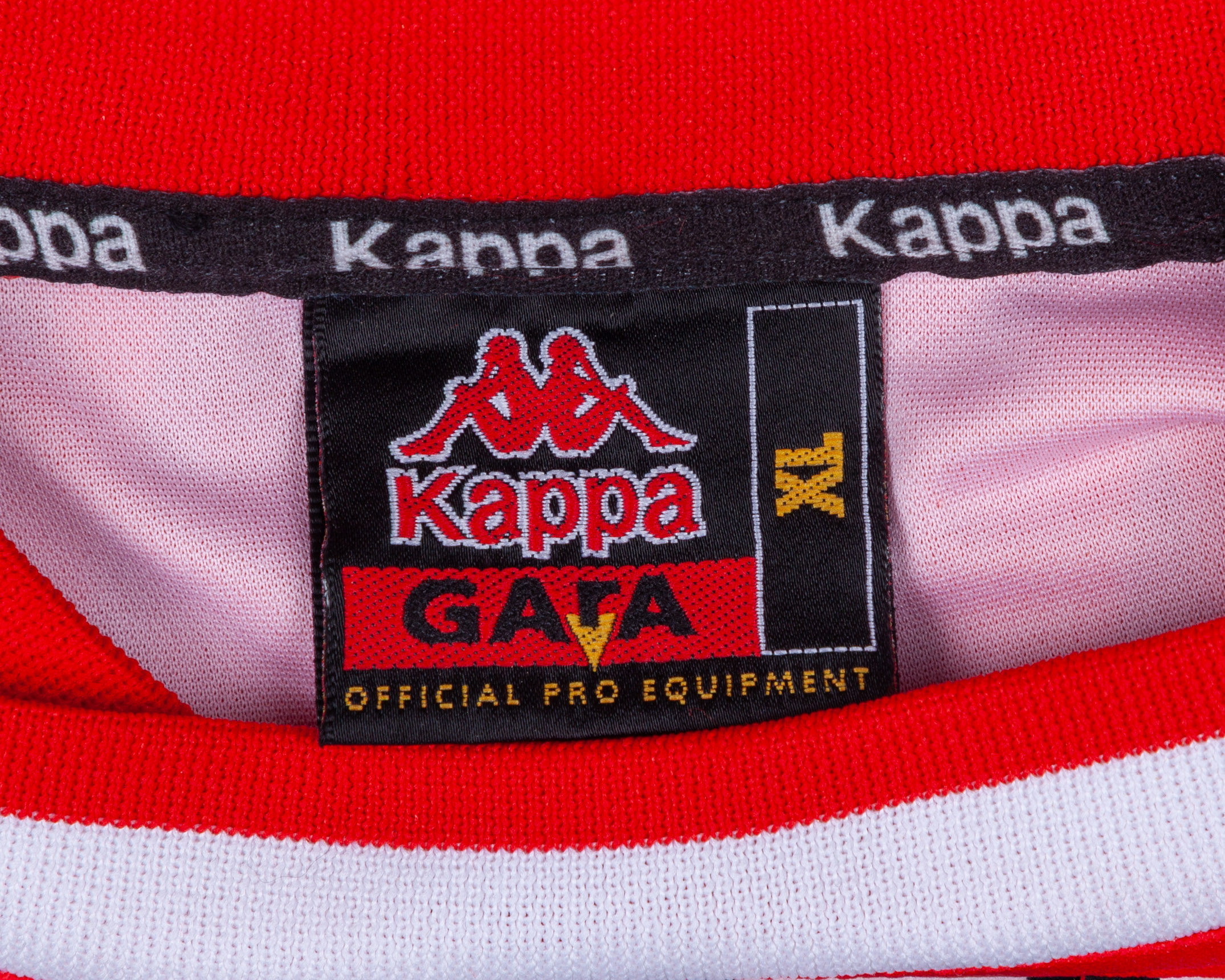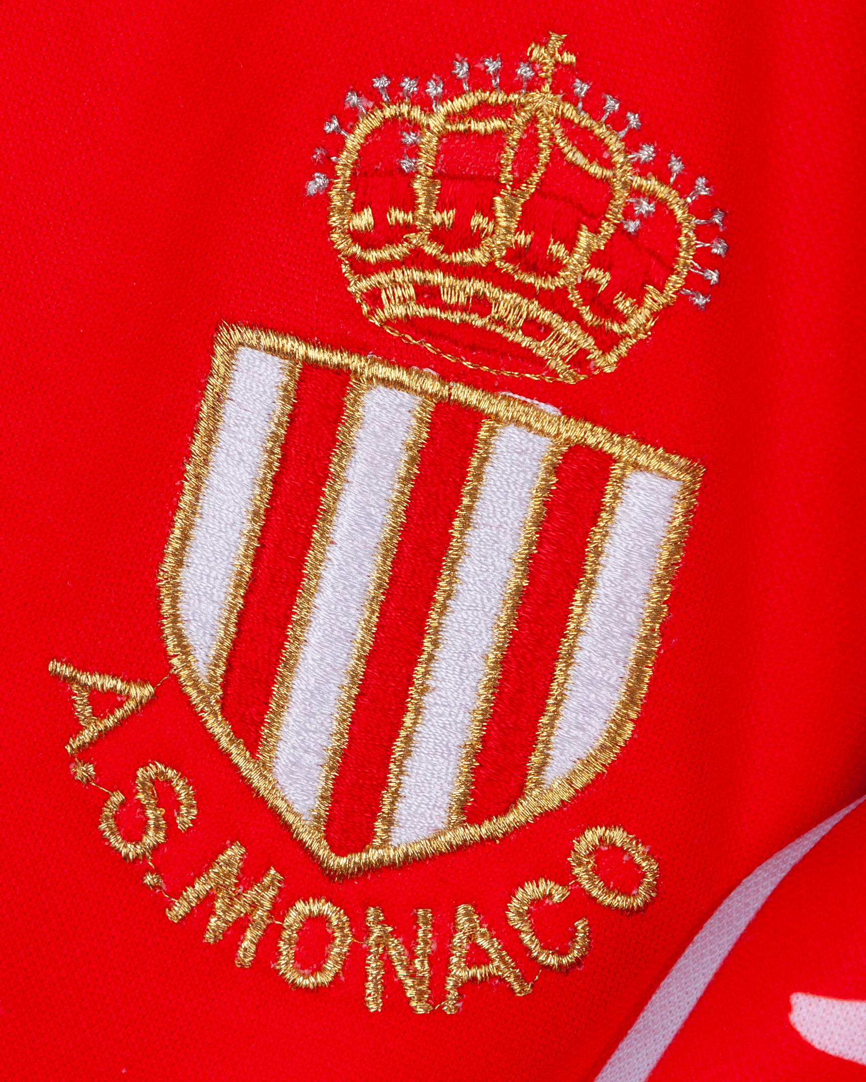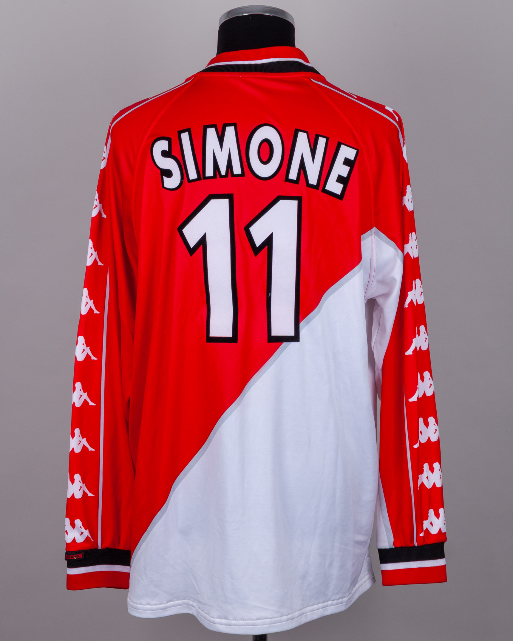 Marco Simone red and white No.11 Monaco v. Nancy long-sleeved shirt, 2000, Kappa, XL, with crew-neck collar and embroidered badge inscribed A.S. MONACO, the reverse lettered SIMONE