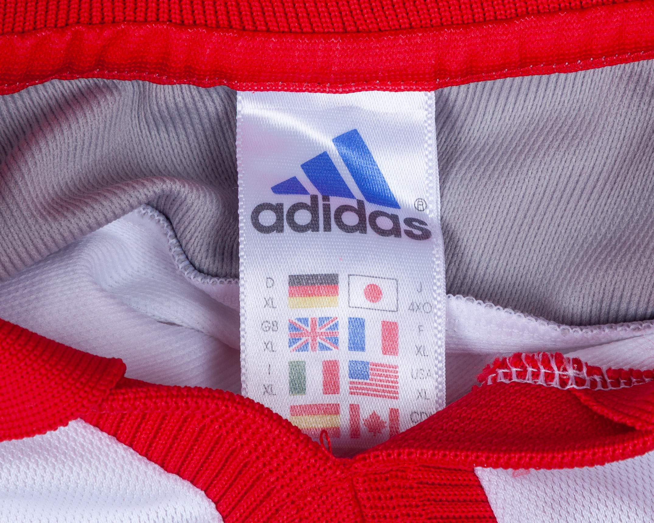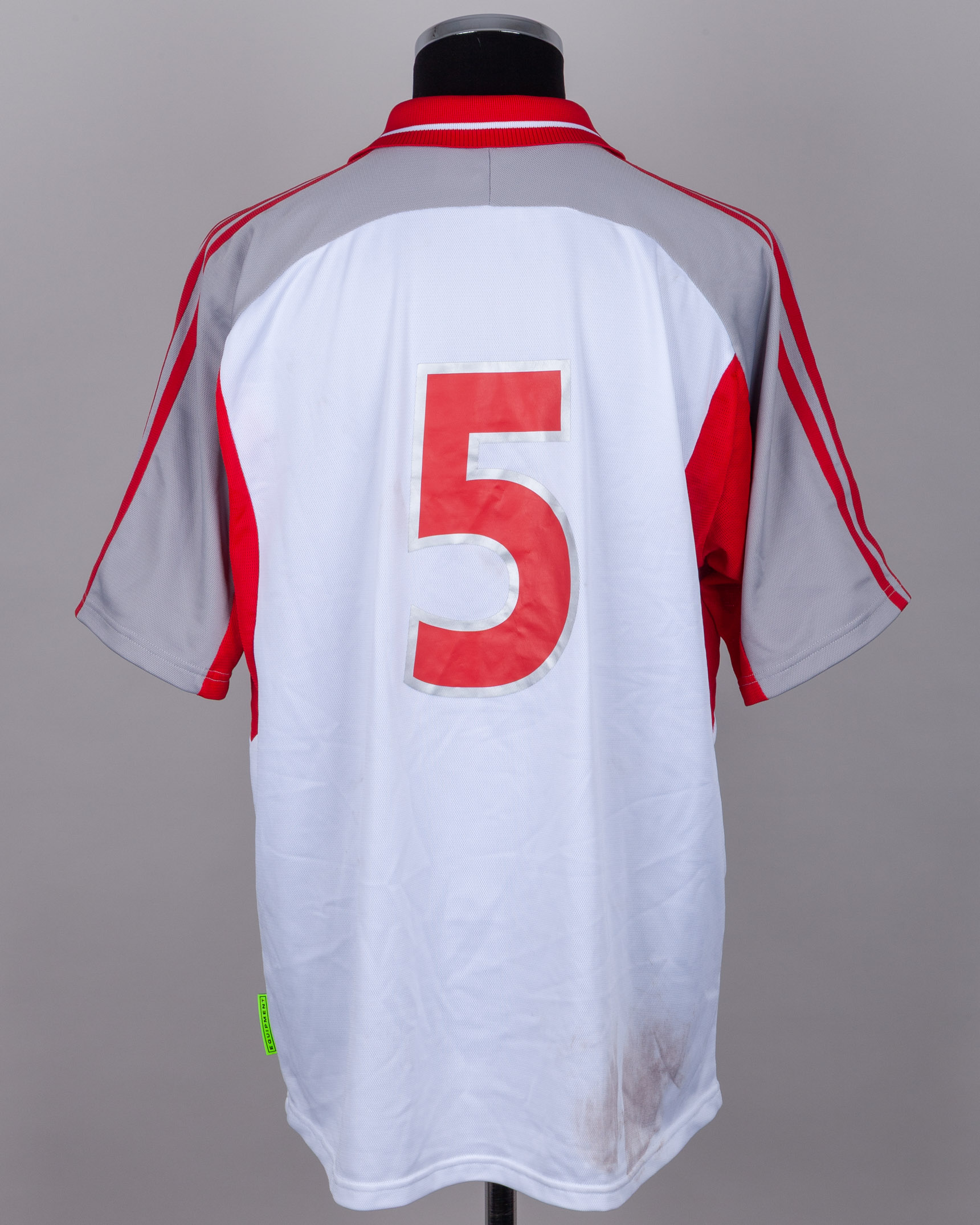 Fehmi Alpay Ozalan white, red and grey No.5 Turkey short-sleeved shirt, 2000-02, Adidas, XL, with v-neck collar and embroidered cloth badge, with some staining