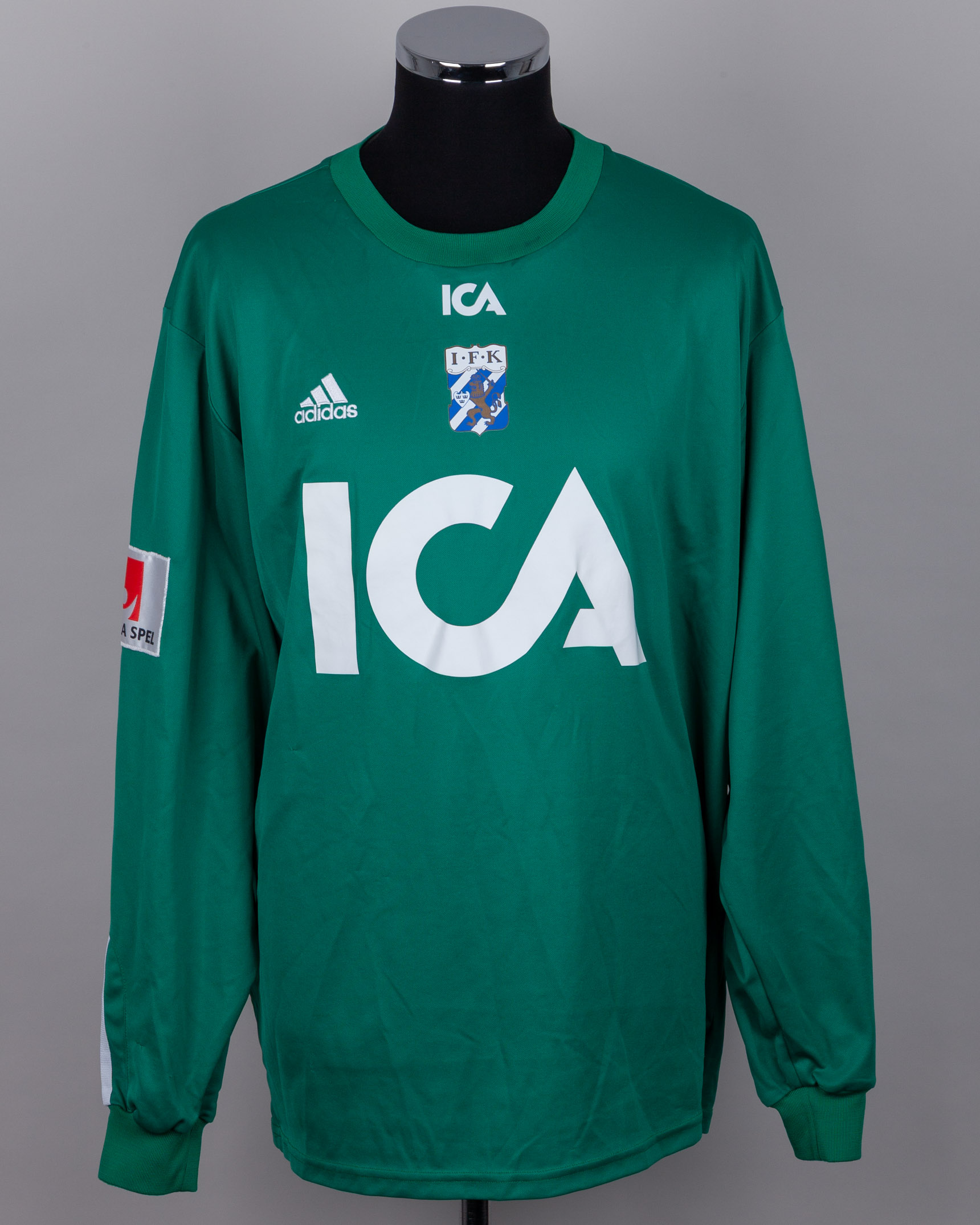 Green No.1 IFK Gothernburg goalkeeper shirt, Adidas, with crew-neck collar and printed badge, the right sleeve with Svenska Spel flash