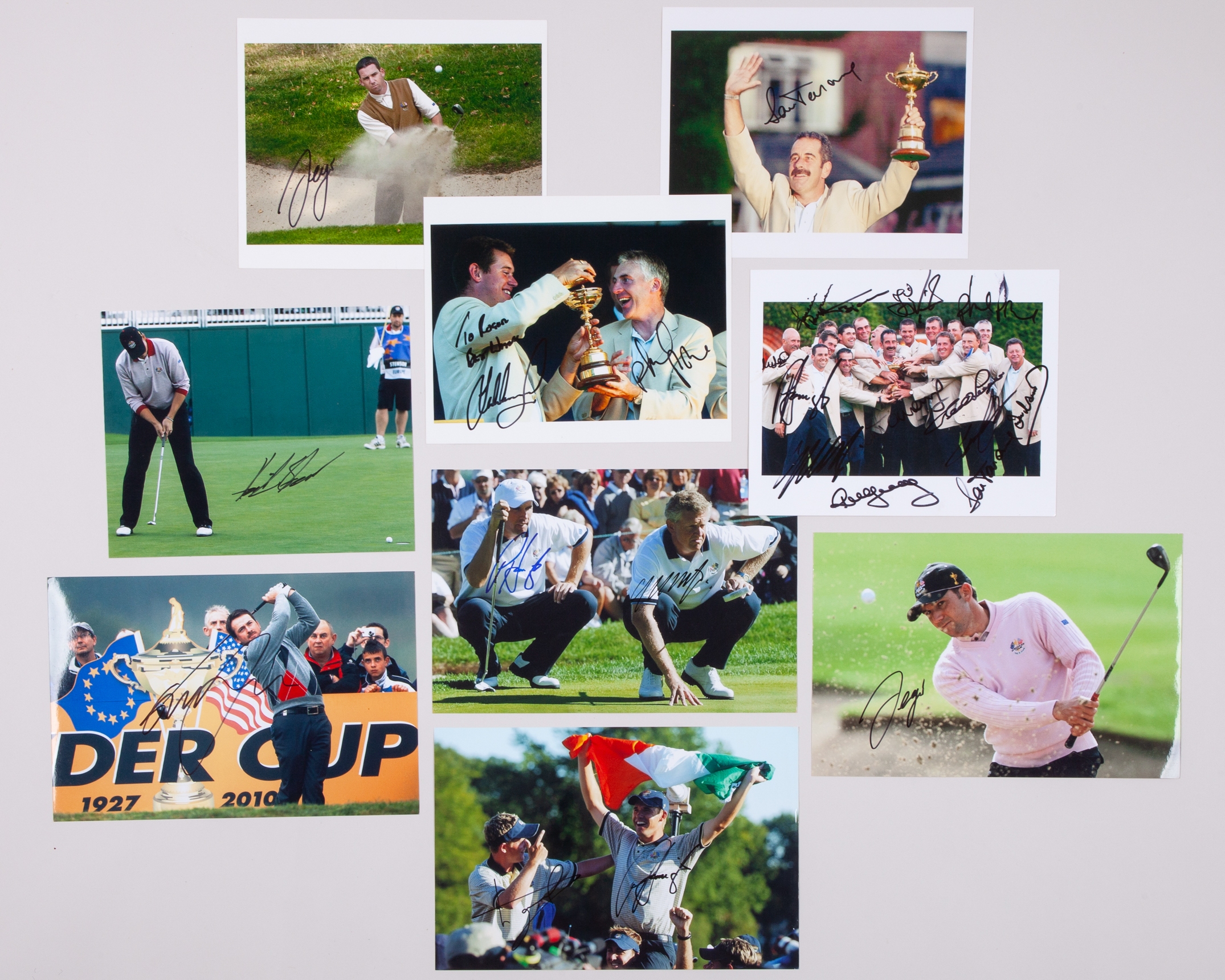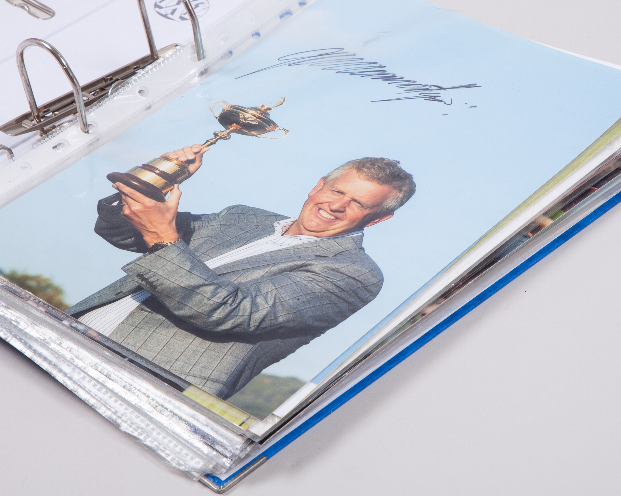 A folder of forty-one autographed golf colour pictures, including Colin Montgomerie, Jose Mario Olazabal and Sergio Garcia