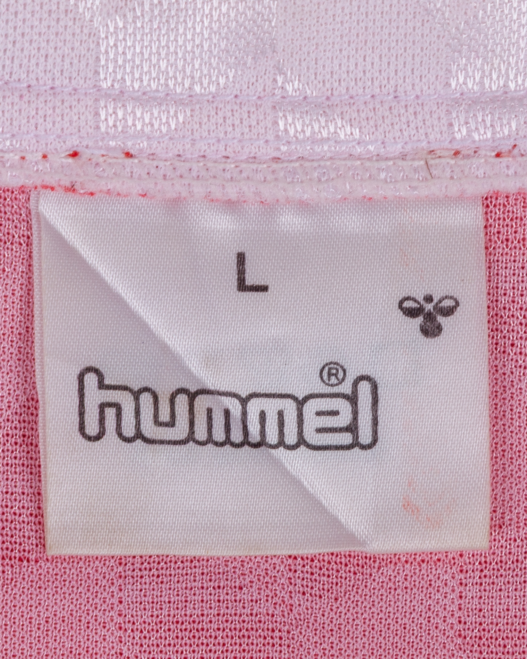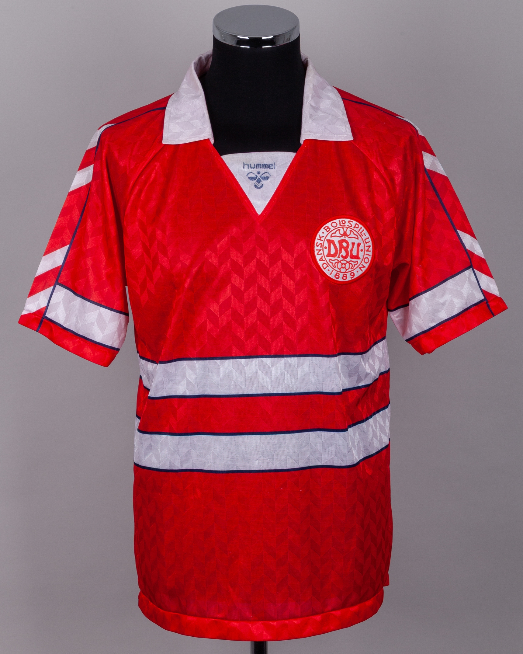 Red and white No.12 Denmark short-sleeved shirt, 1988, Hummel, L, with v-neck collar and embroidered cloth badge