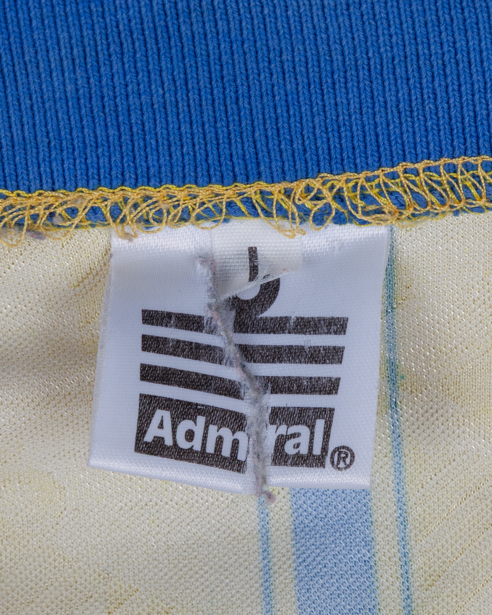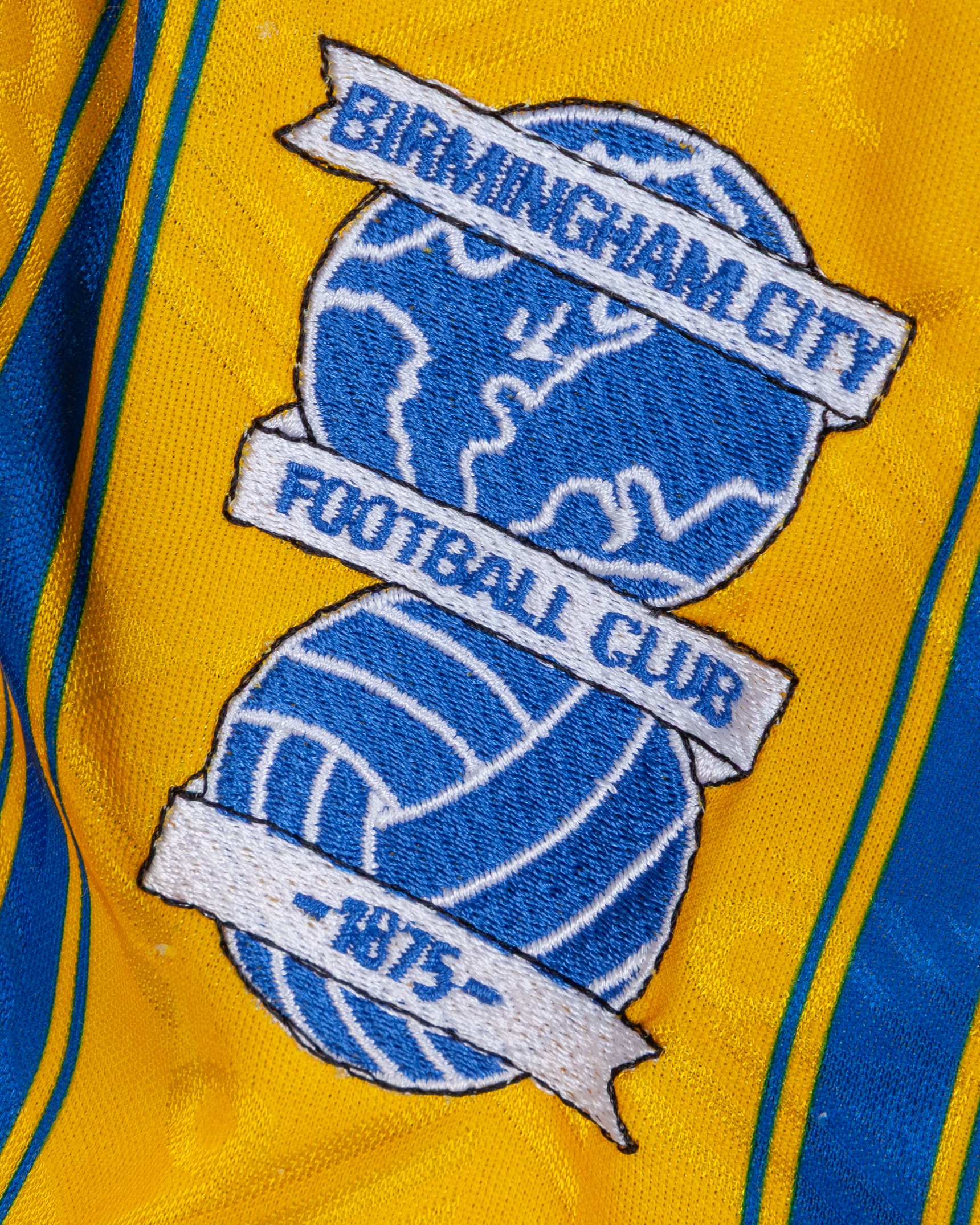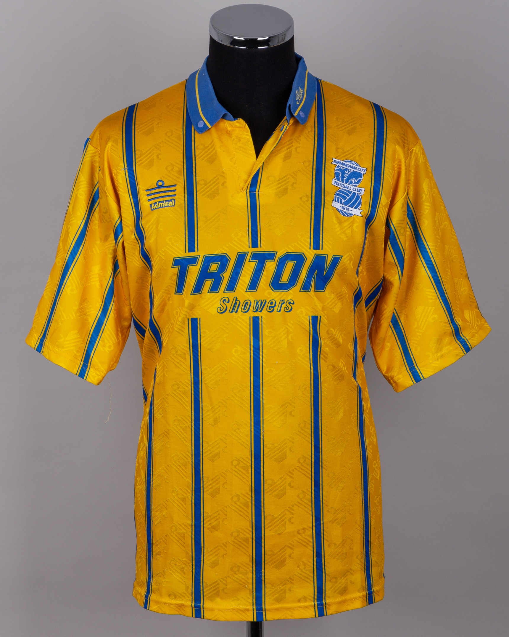 Yellow and blue No.8 Birmingham City short-sleeved shirt, 1993-94, Admiral, L, with button-up collar and embroidered badge inscribed BIRMINGHAM CITY FOOTBALL CLUB 1875