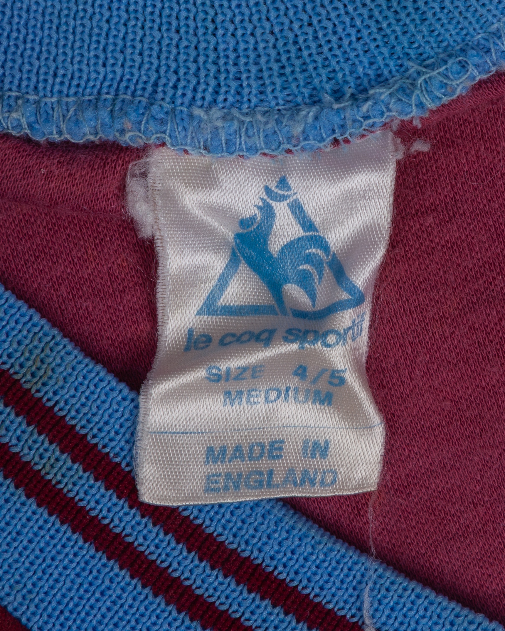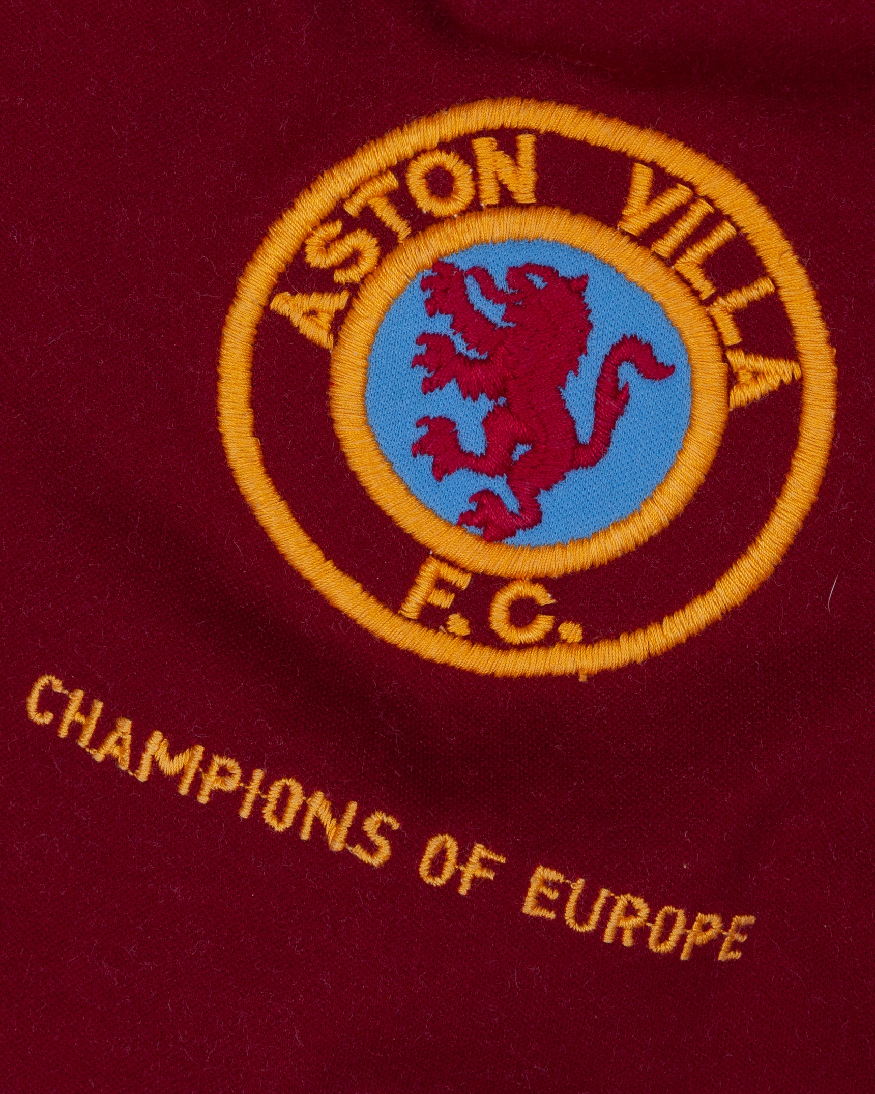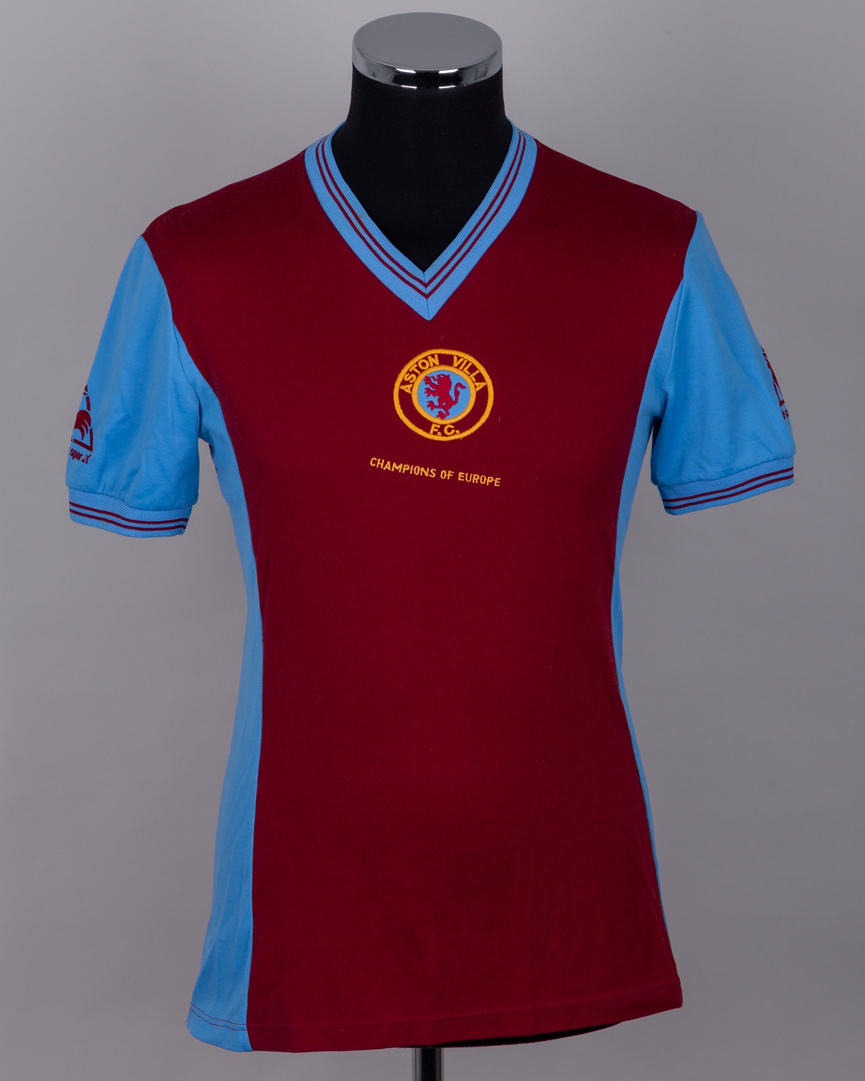 Tony Morley claret and blue No.10 Aston Villa match worn short-sleeved shirt, 1982-83, Le Coq Sportif, medium, with v-neck collar and embroidered badge inscribed ASTON VILLA F.C. CHAMPIONS OF EUROPE, staining to front and back