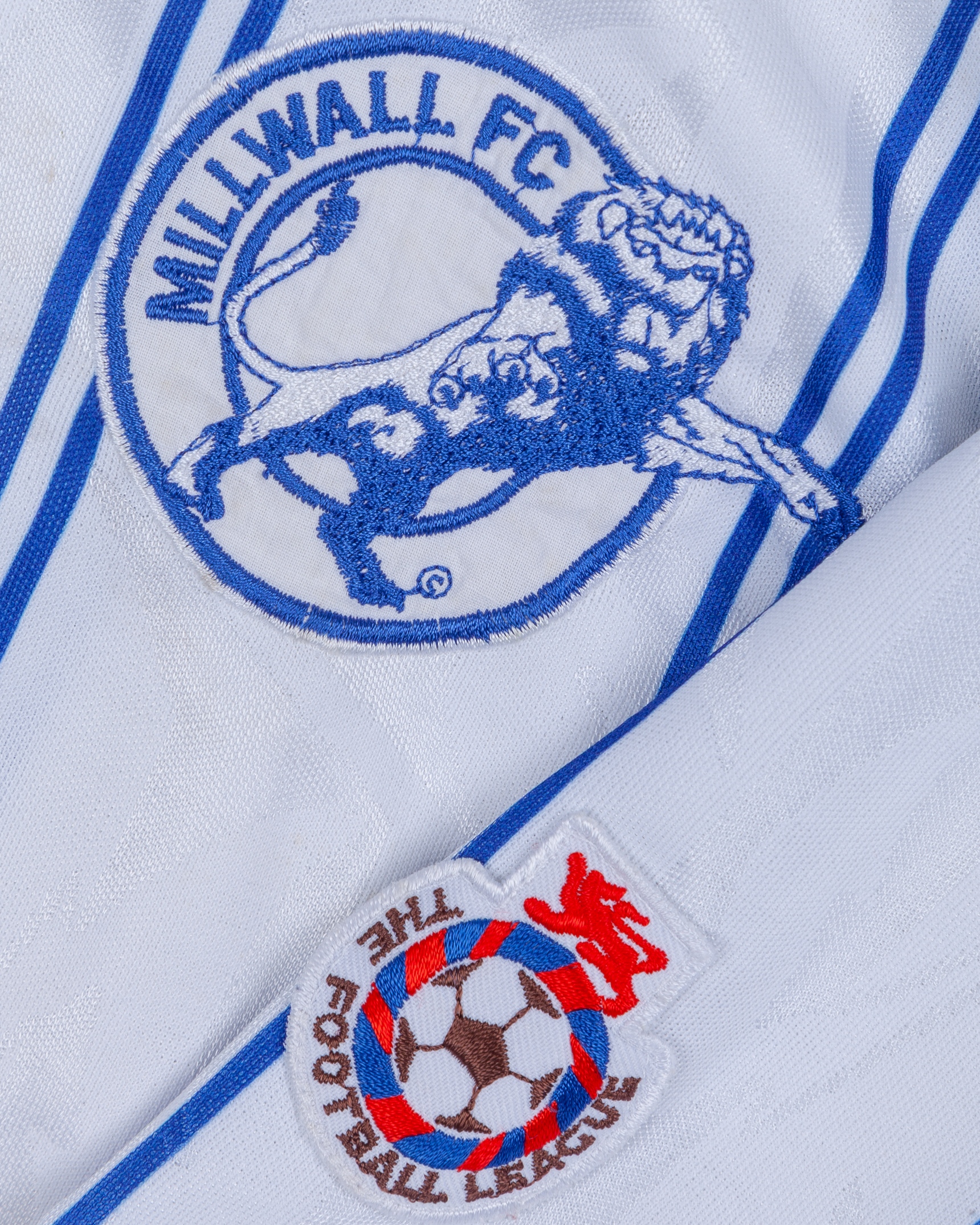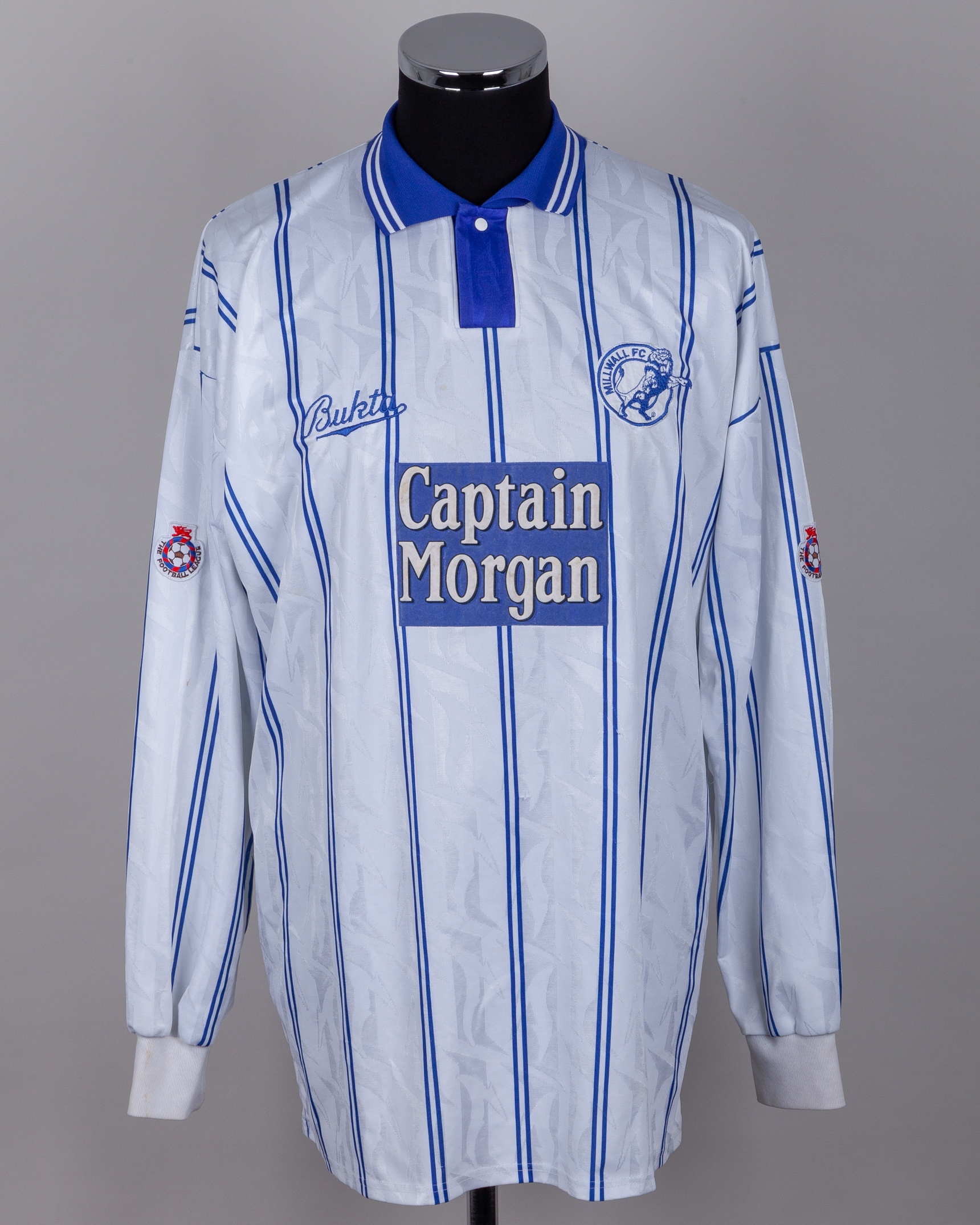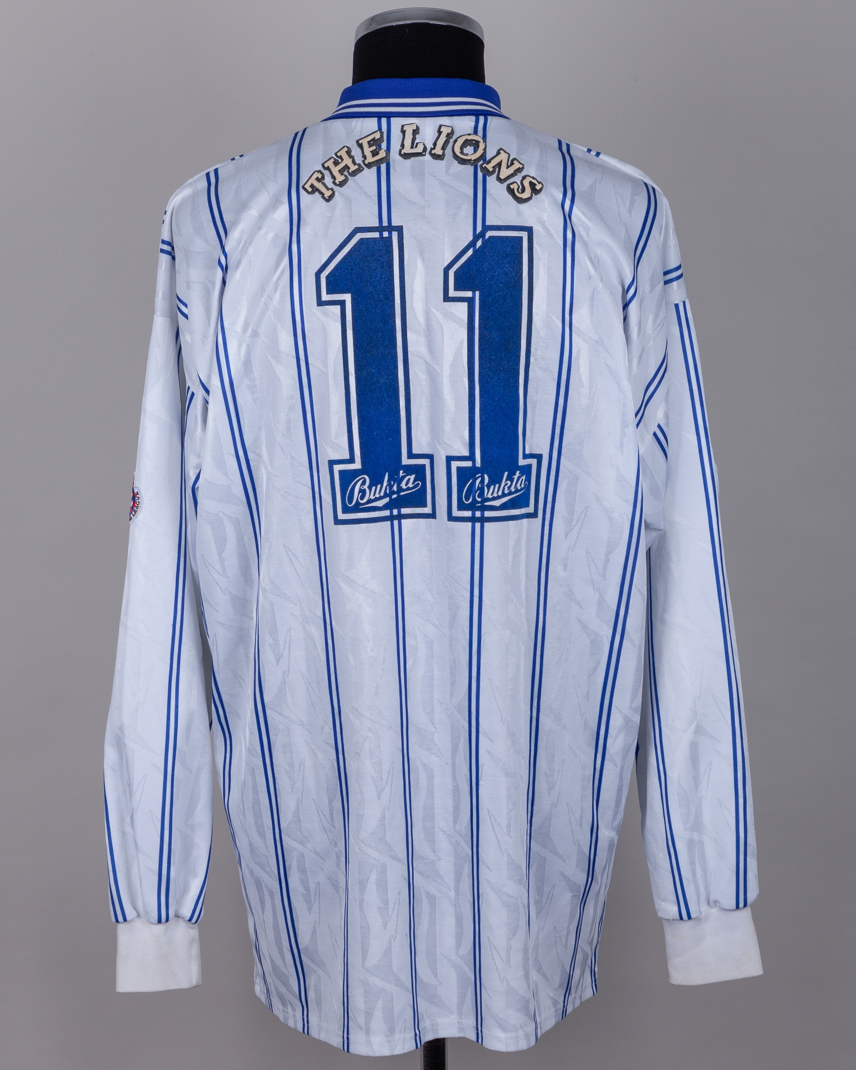 White and blue No.11 Millwall long-sleeved shirt, 1993-94, Bukta, 46/48, with button-up collar and embroidered cloth badge inscribed MILLWALL FC, the reverse lettered THE LIONS, the sleeves with The Football League flashes , some staining