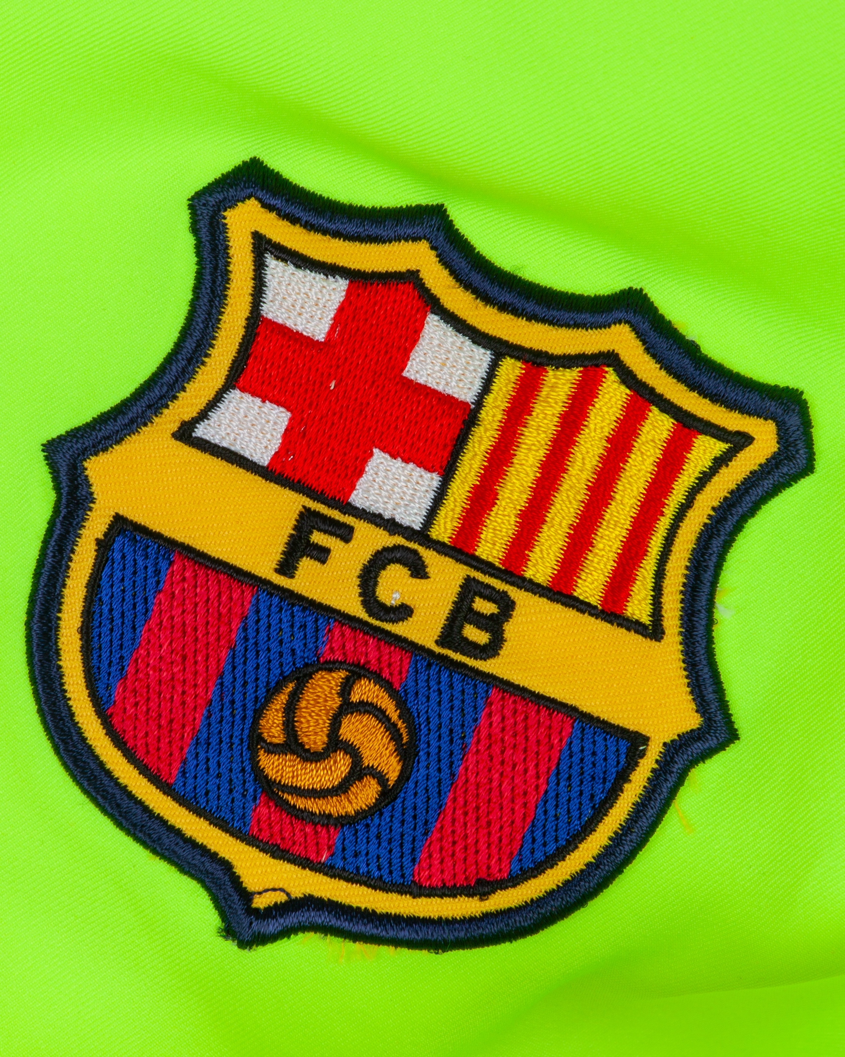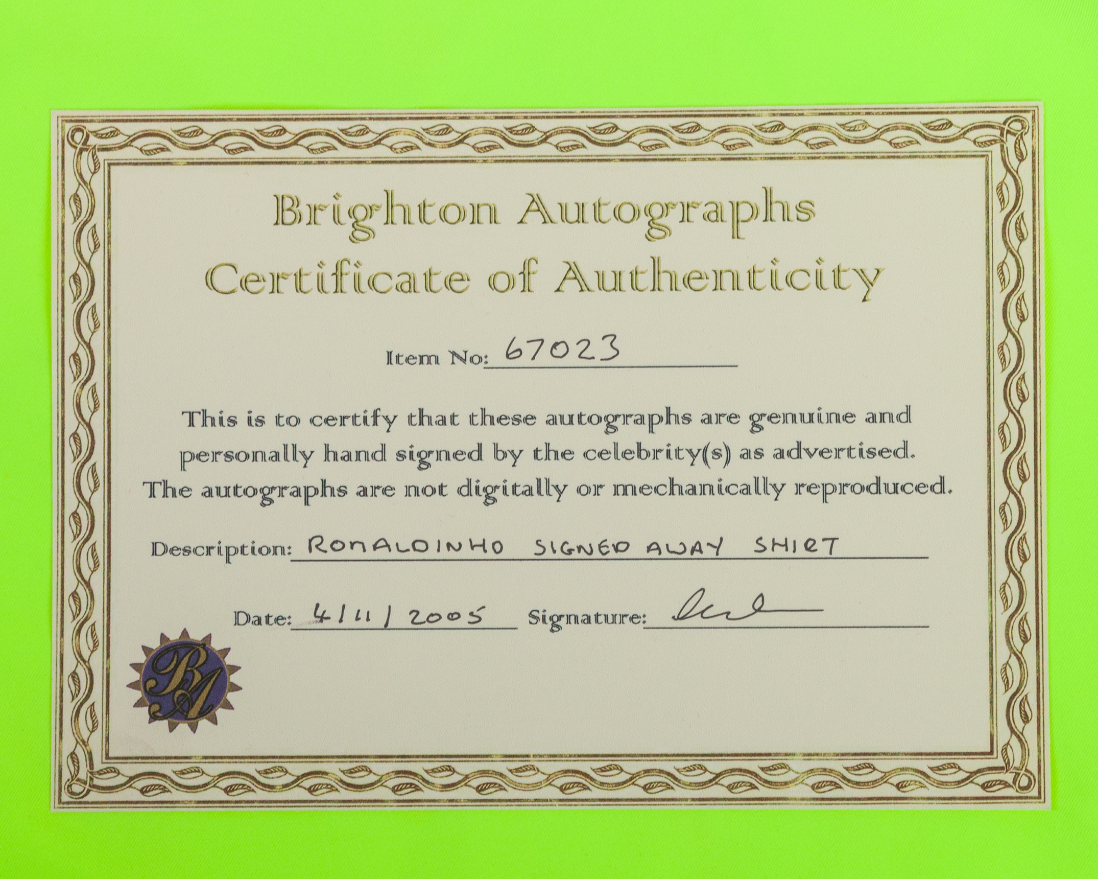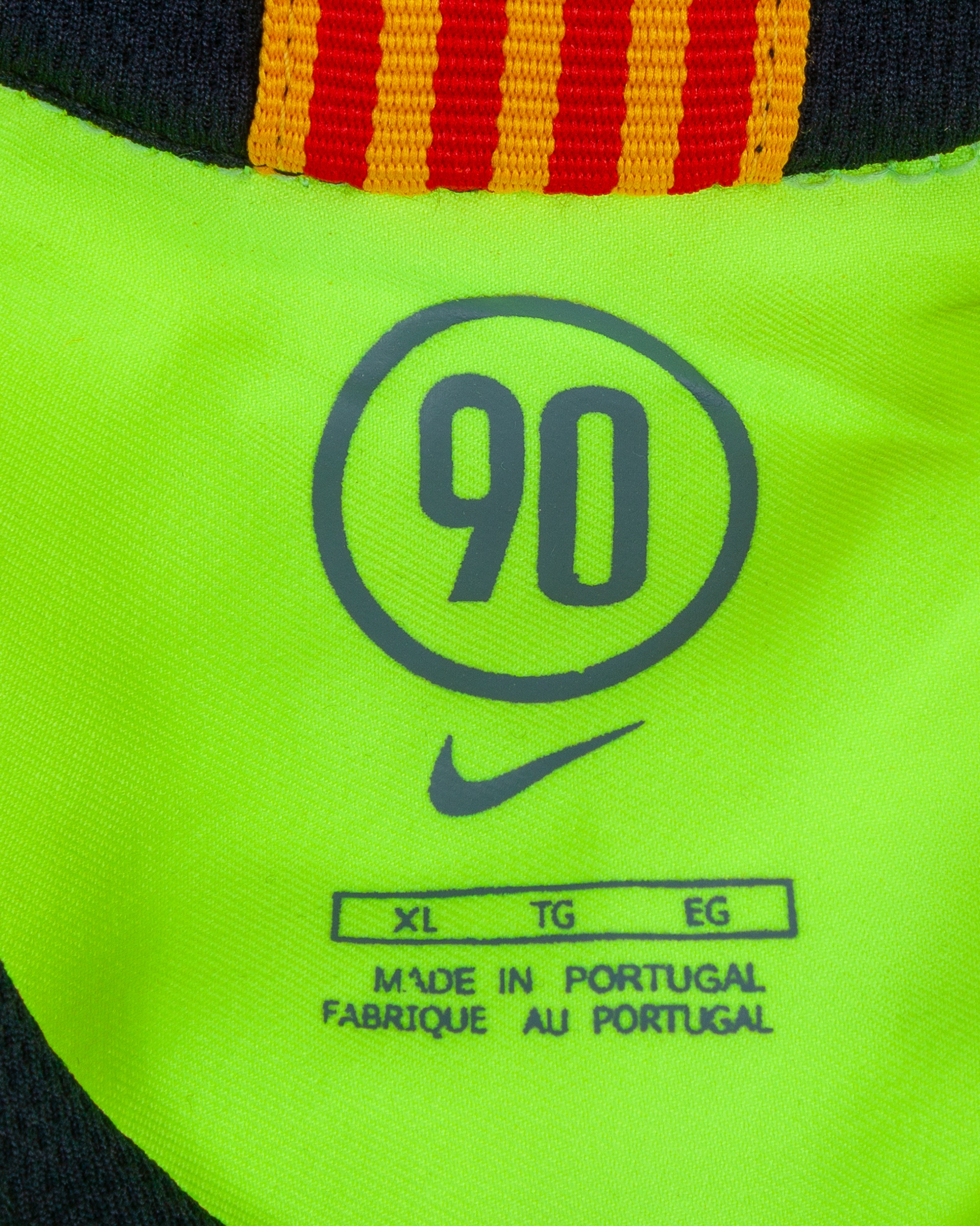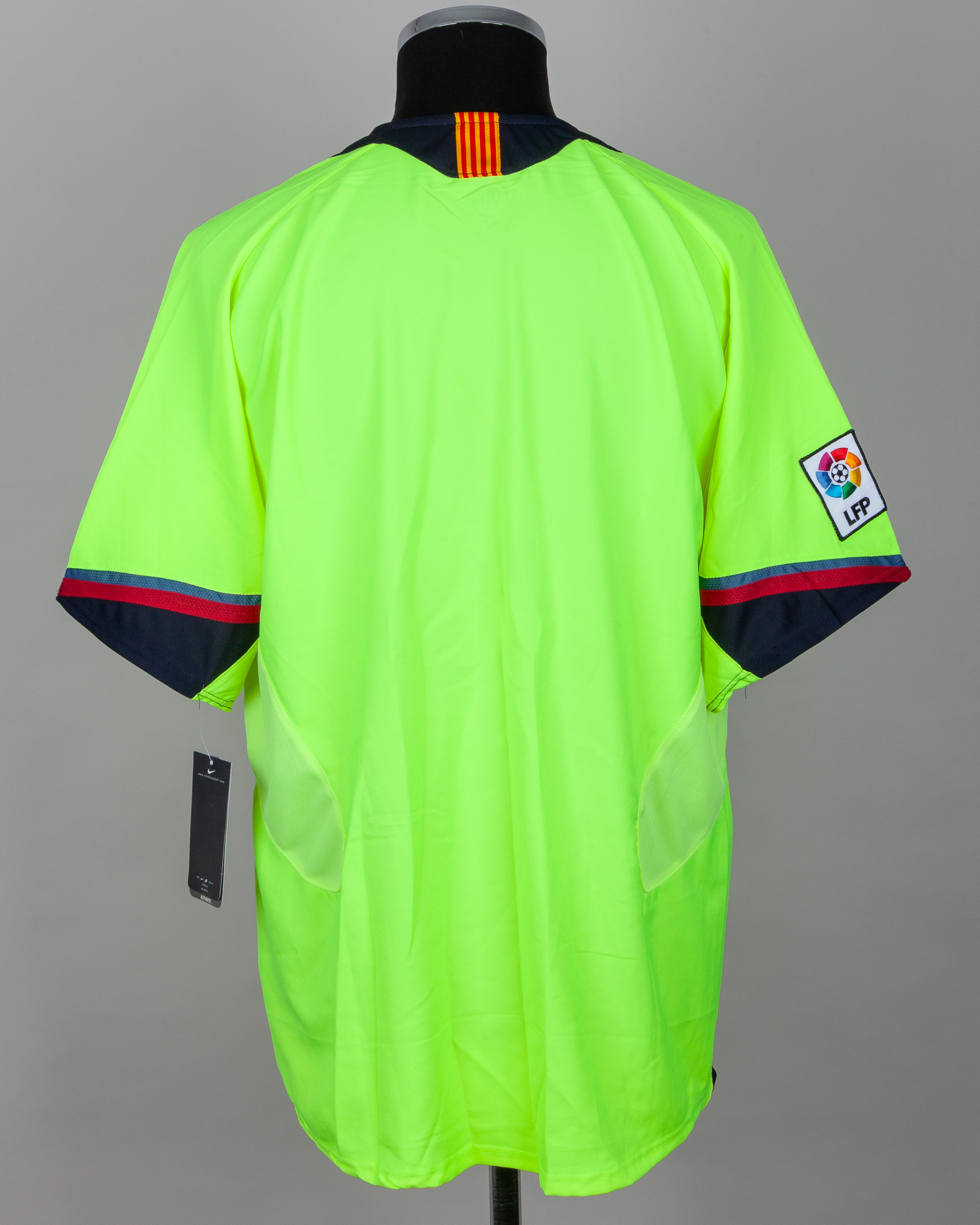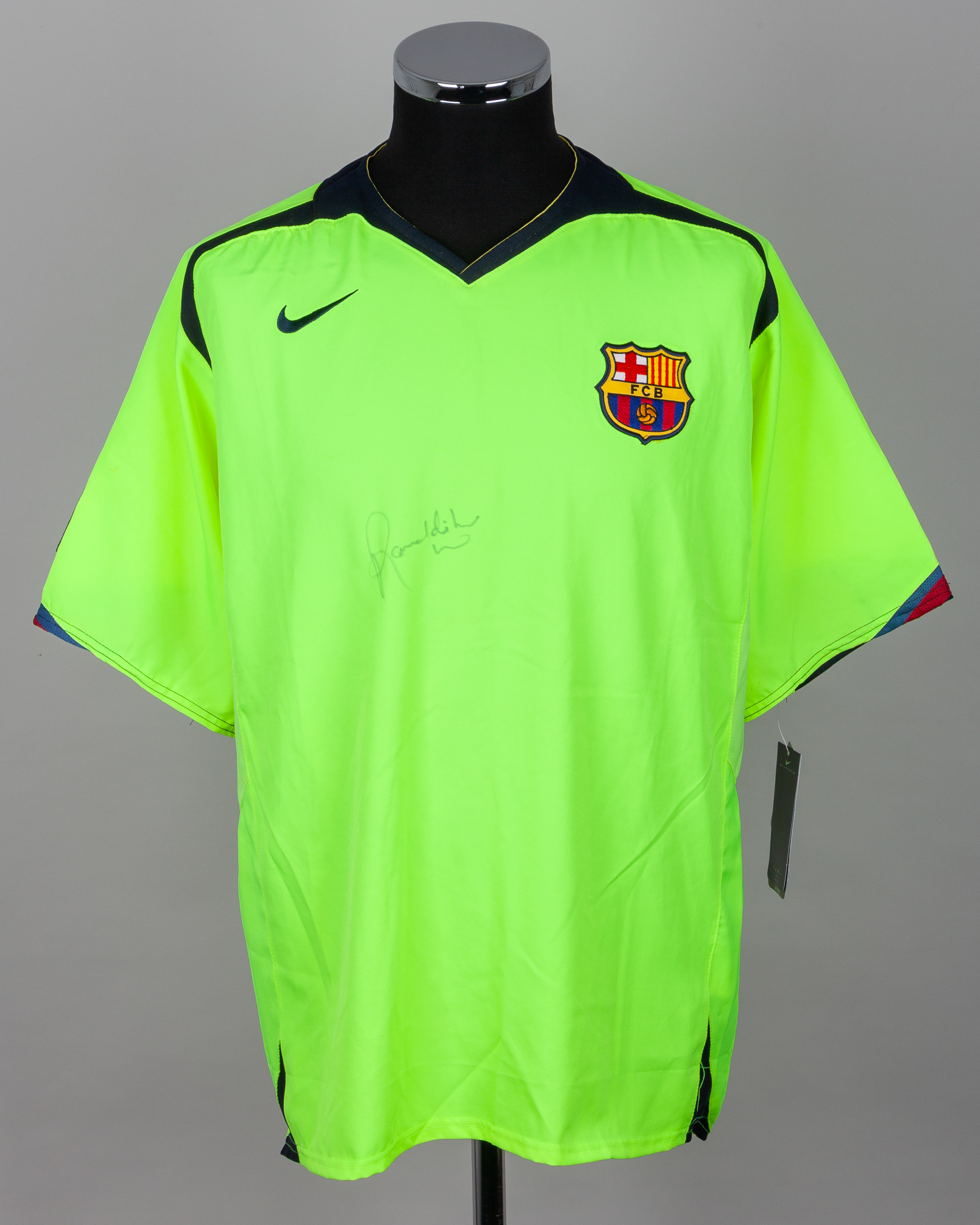 A yellow Ronaldinho autographed replica Barcelona short-sleeved shirt, Nike, XL, with v-neck collar and embroidered cloth badge inscribed FCB, with COA, unwashed