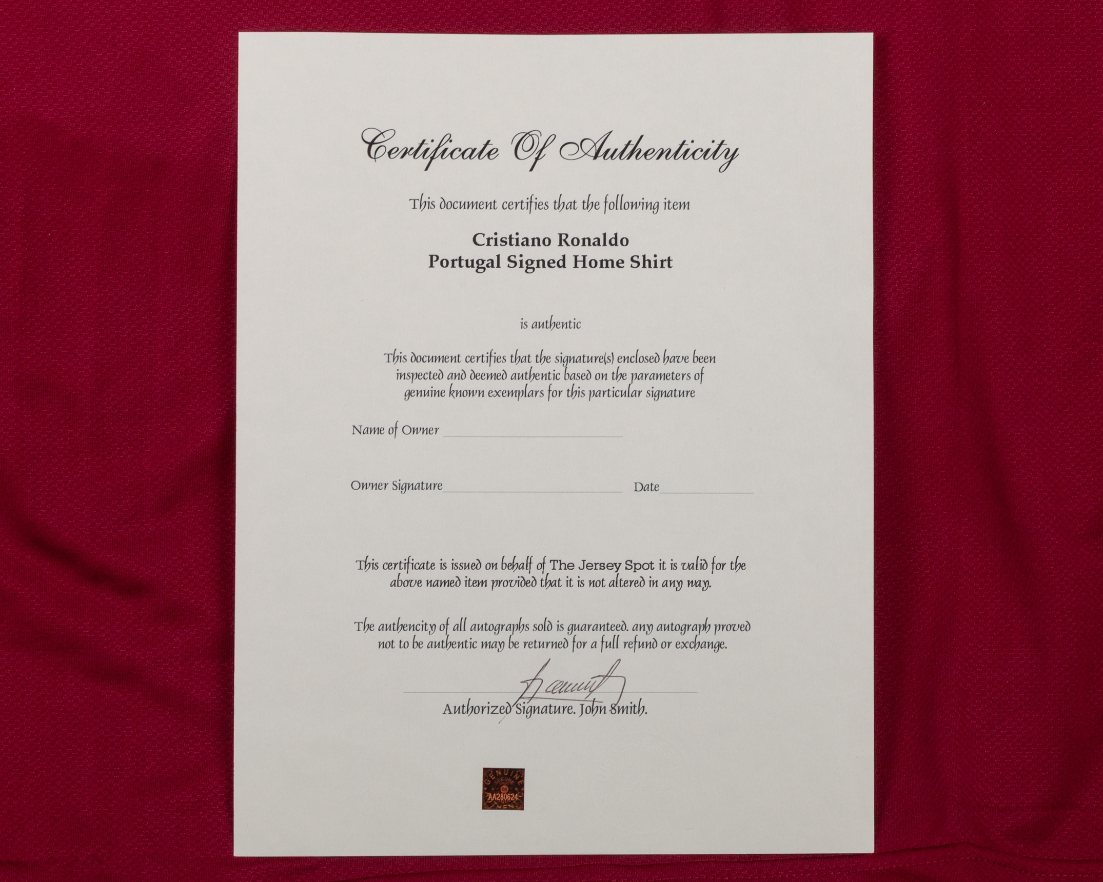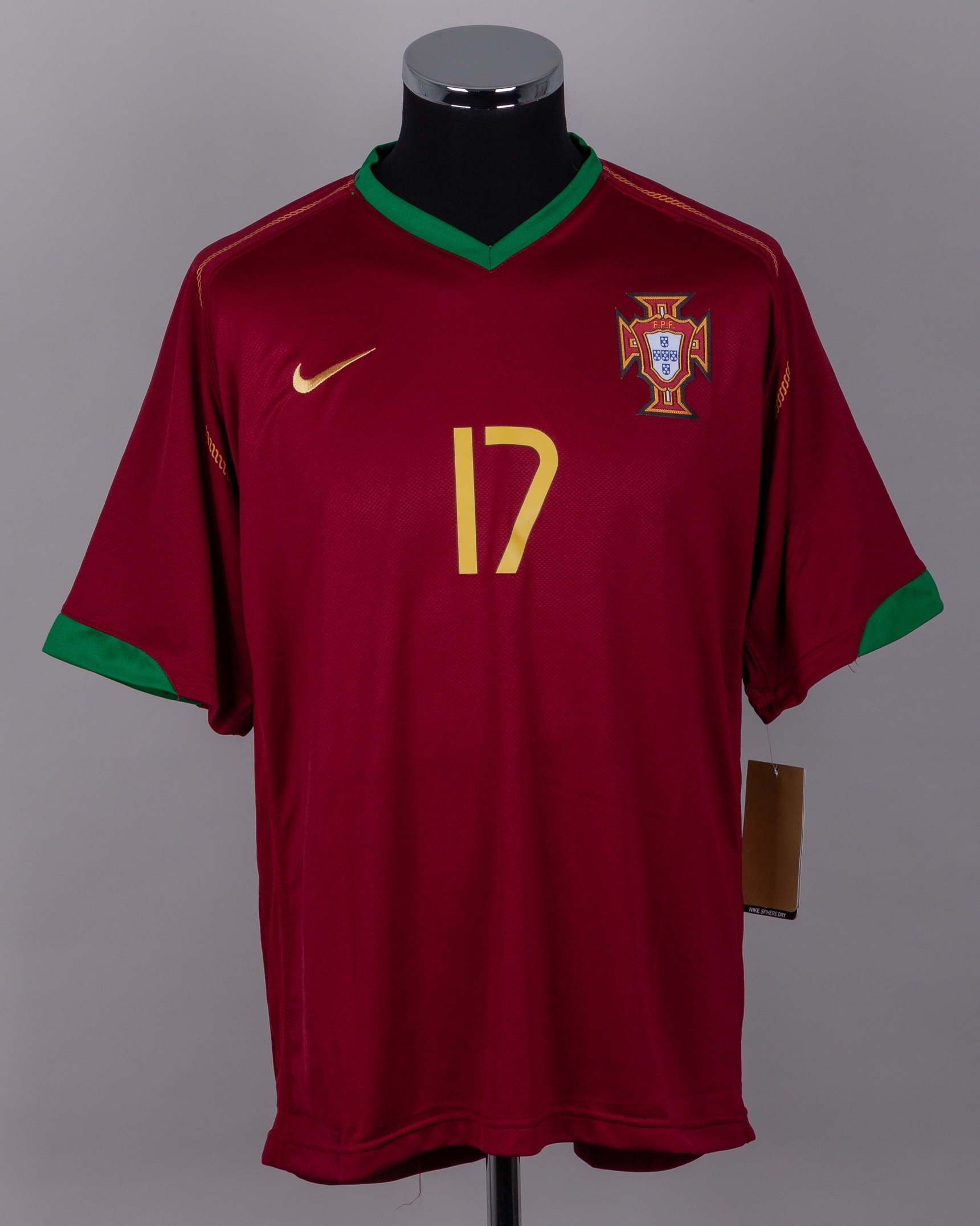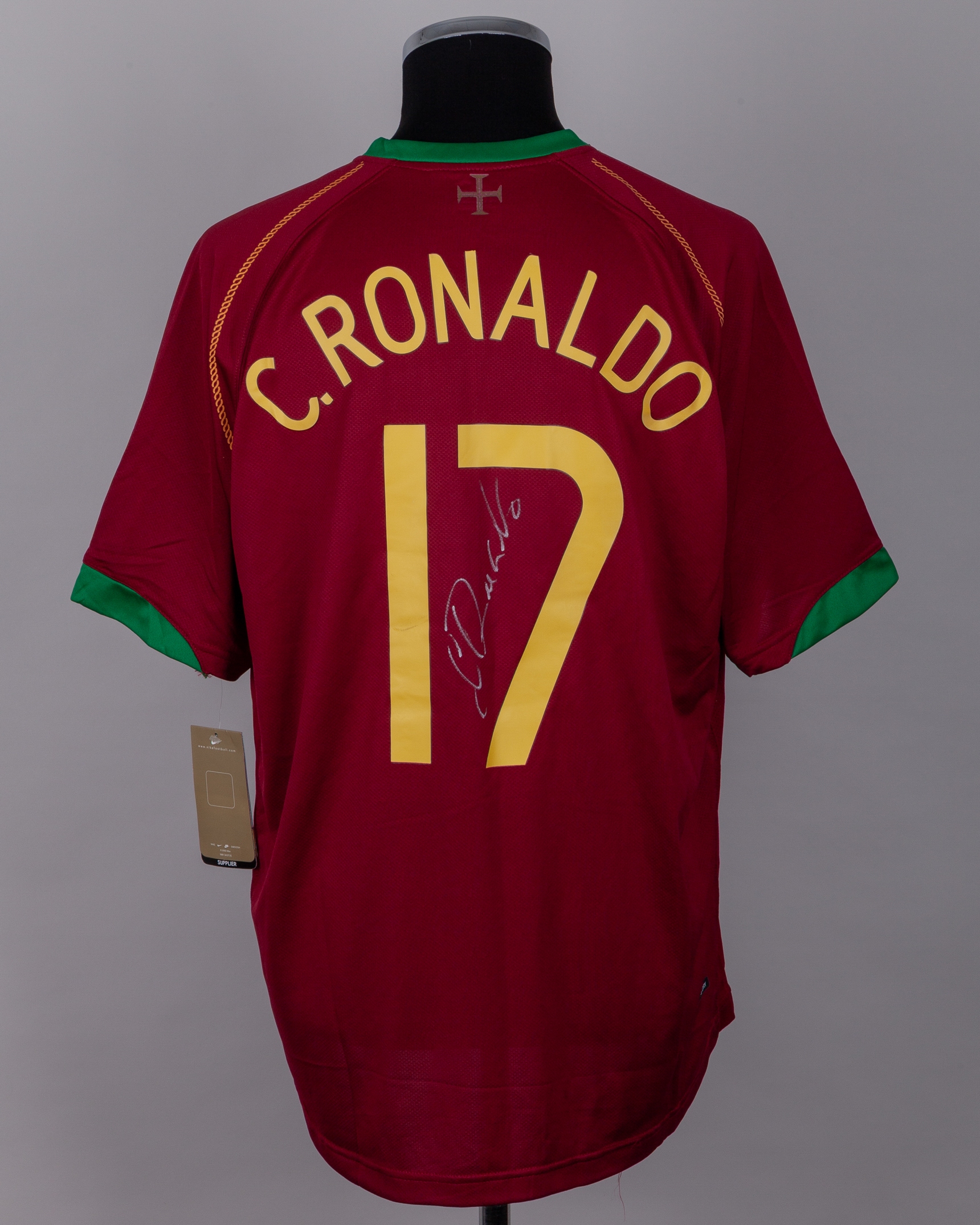 Cristiano Ronaldo red No.17 replica Portugal autographed short-sleeved shirt, Nike, XL, with v-neck collar and printed badge, the reverse lettered C. RONALDO, autographed on the back, with COA, unwashed