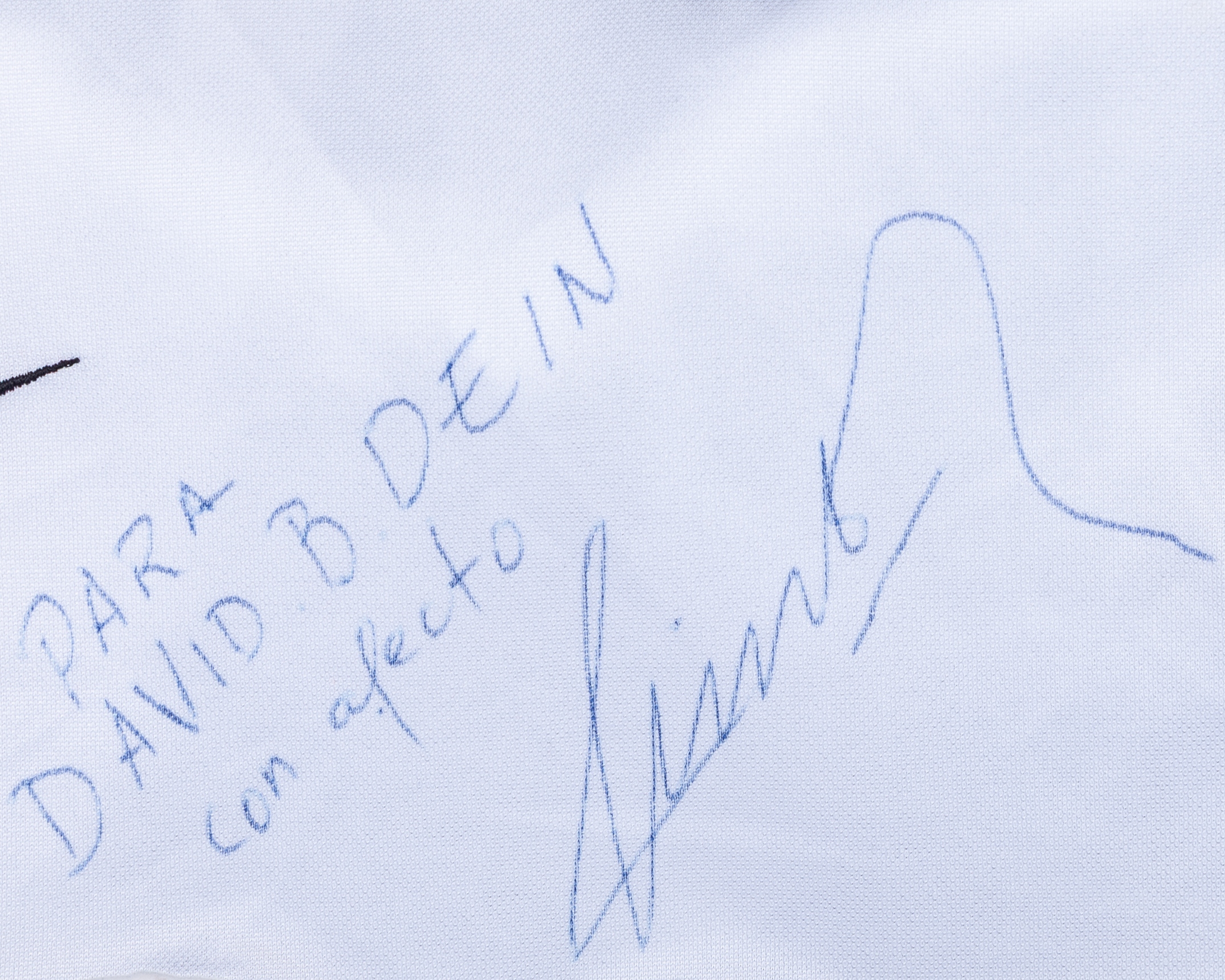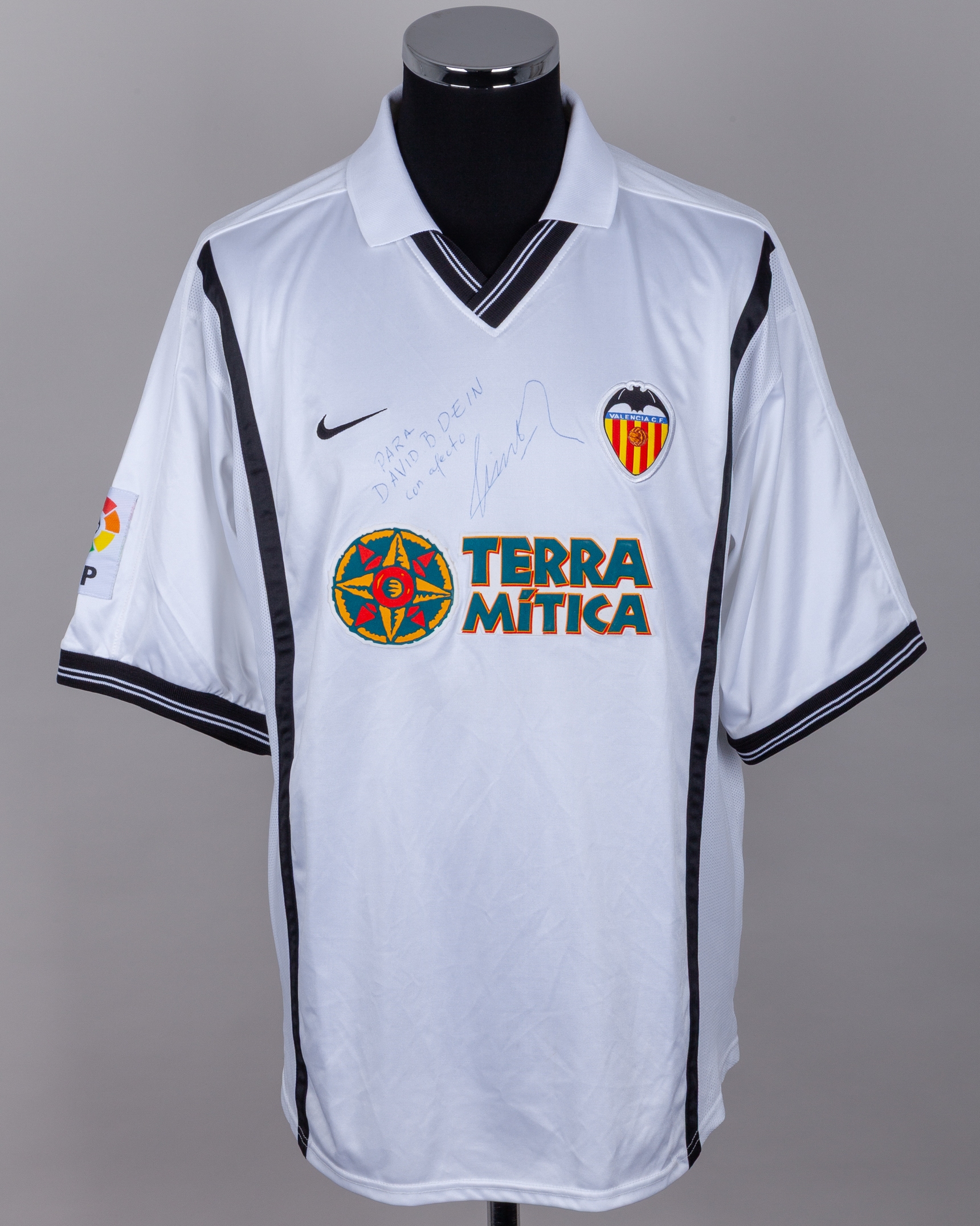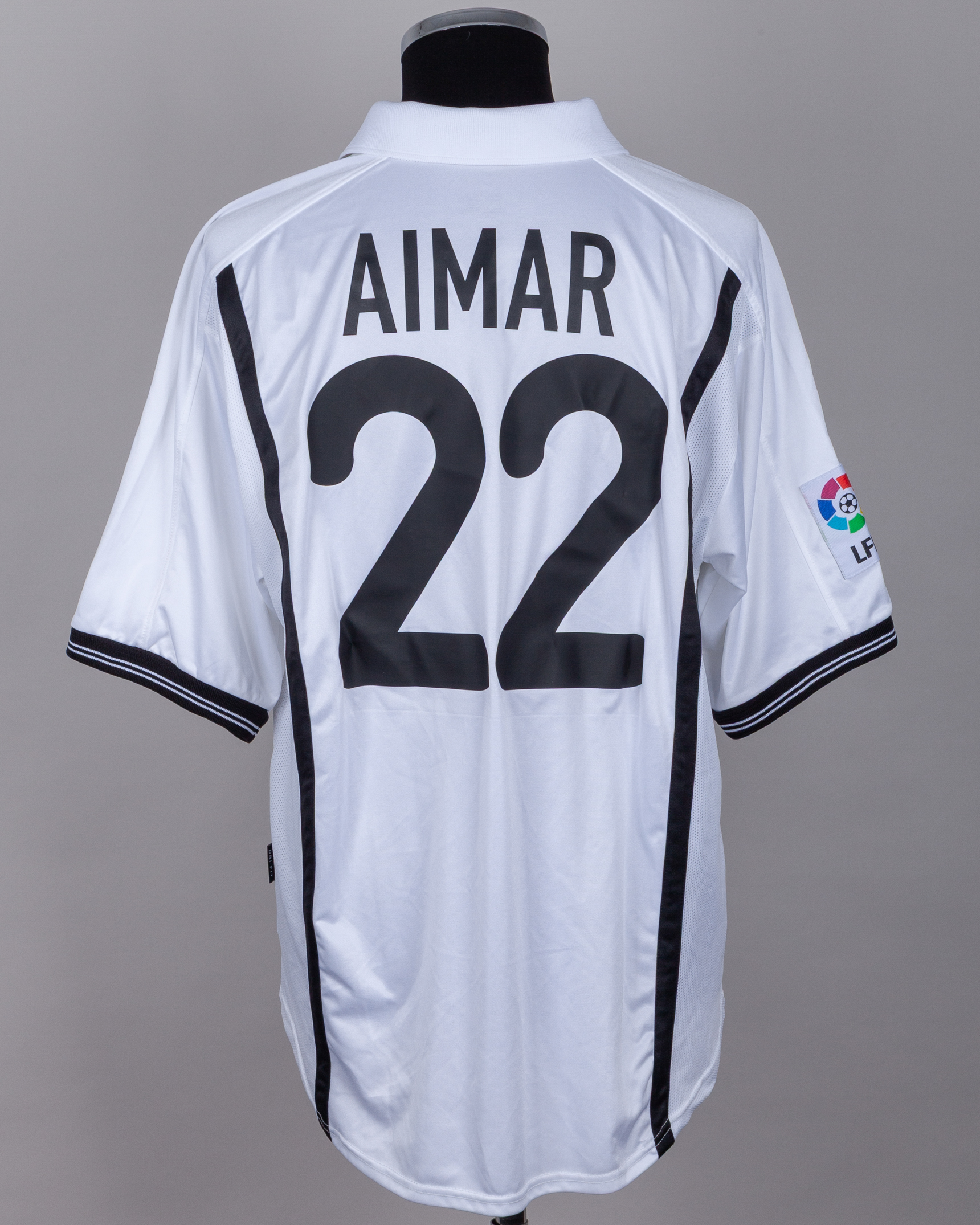 Pablo Aimar white and black No.22 Valencia autographed short-sleeved shirt, 2000-01, Nike, XL, with v-neck collar and embroidered cloth badge inscribed VALENCIA C.F., the reverse lettered AIMAR, the right sleeve with LFP flash, the front autographed by the player para David .B. Dein con afecto
