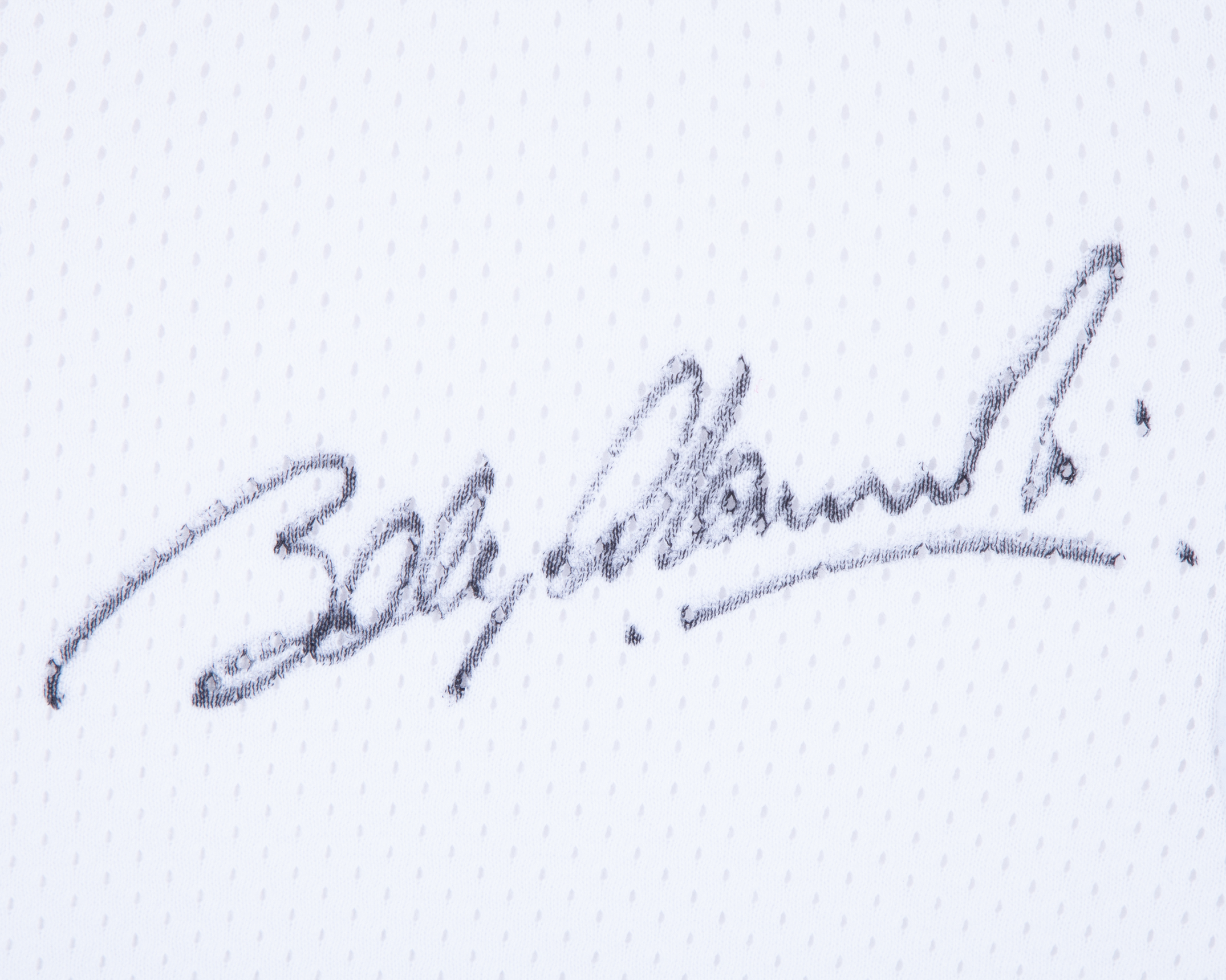 Bobby Charlton autographed white England replica shirt display, Umbro, with crew-neck collar and embroidered cloth badge, with two photocopies of programme covers, 82 x 61cm