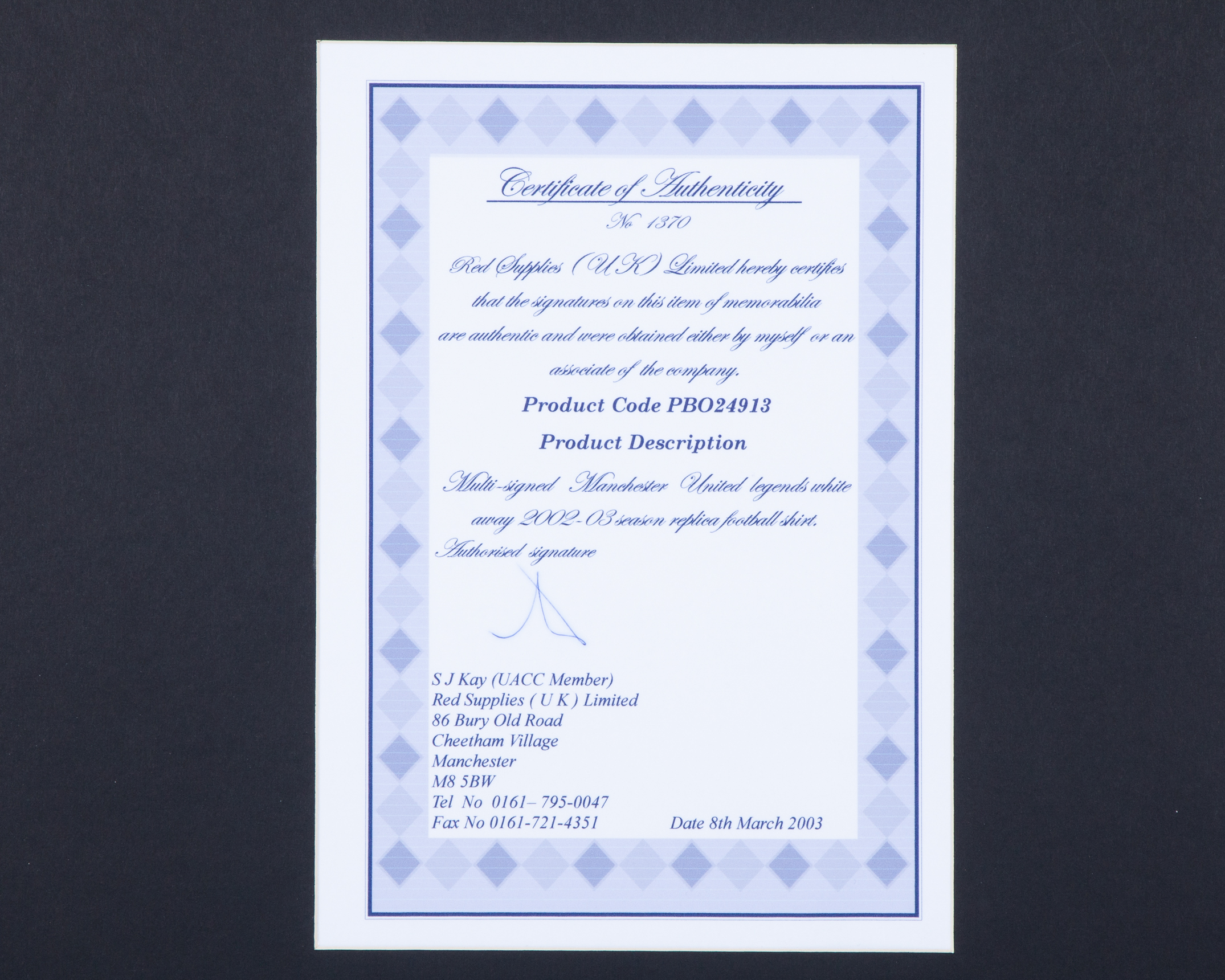A white, black and red Manchester United autographed replica shirt display