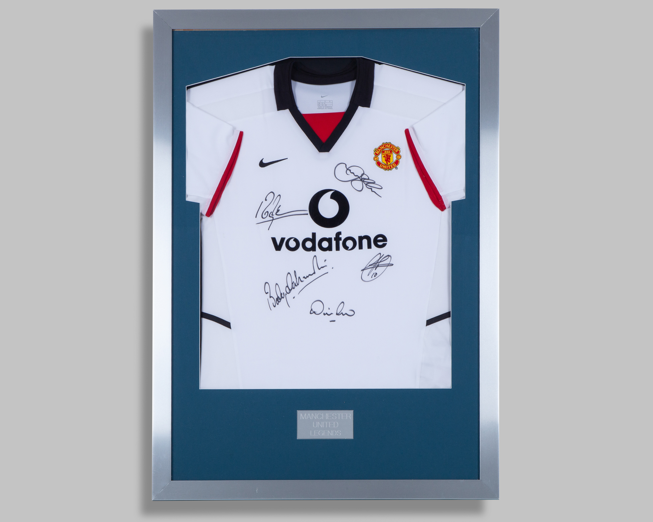 A white, black and red Manchester United autographed replica shirt display, Nike, L, with v-neck collar and embroidered badge inscribed MANCHESTER UNTIED, with five autographs including Roy Keane, David Beckham, Bobby Charlton, Denis Law and Ruud Van Nistelrooy, with COA, framed, 62 x 88cm