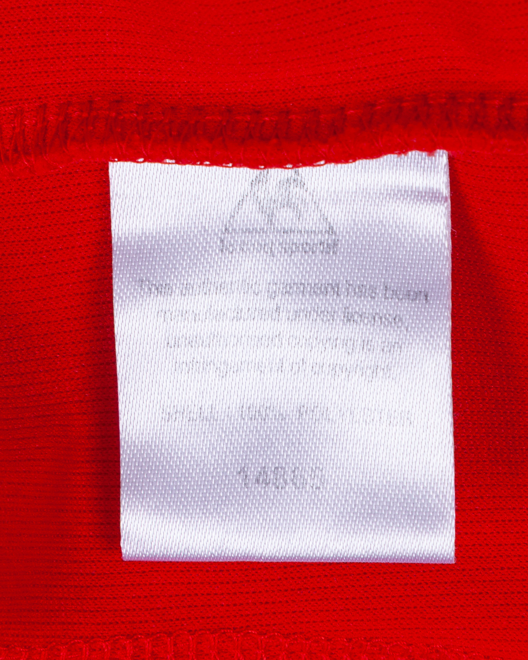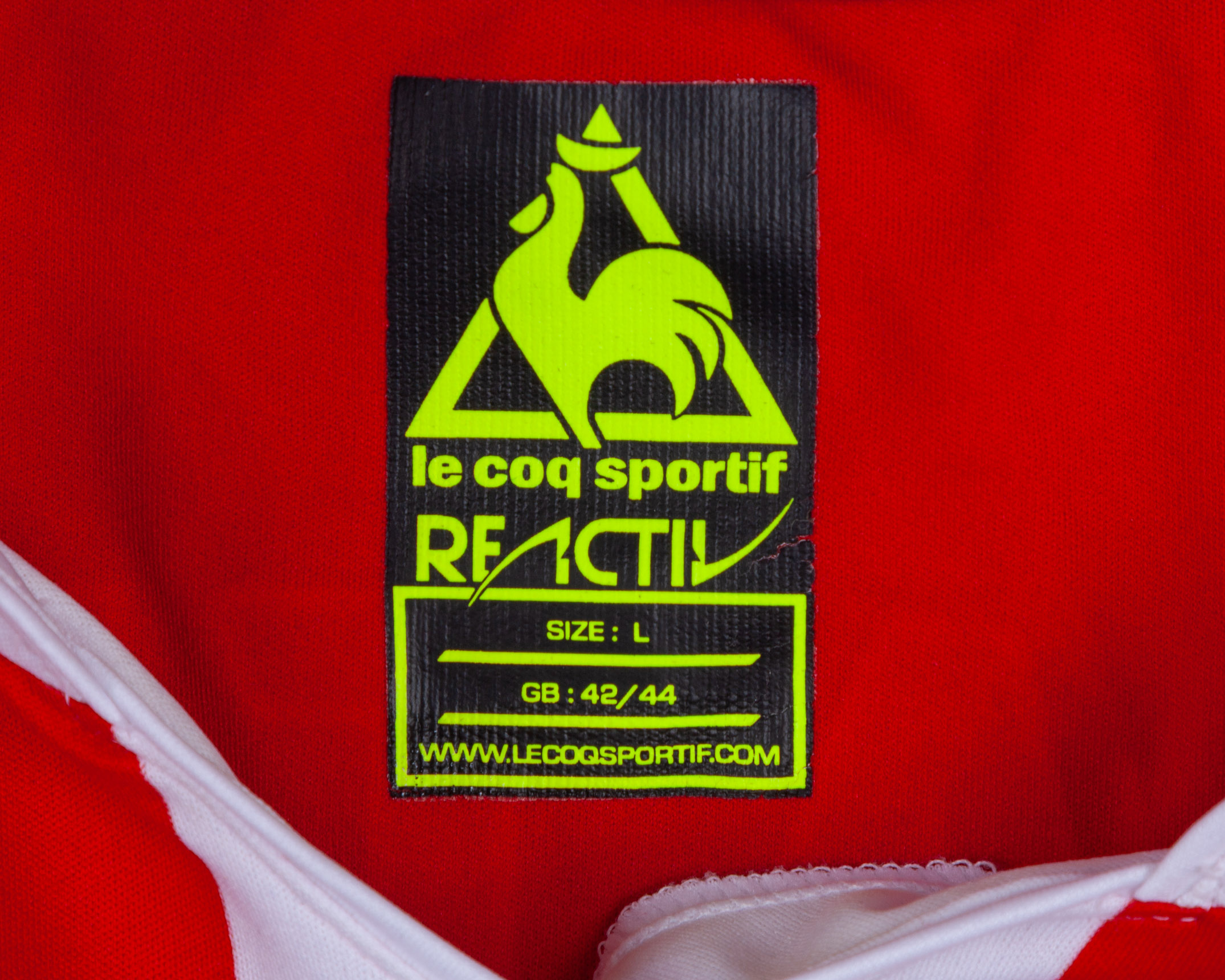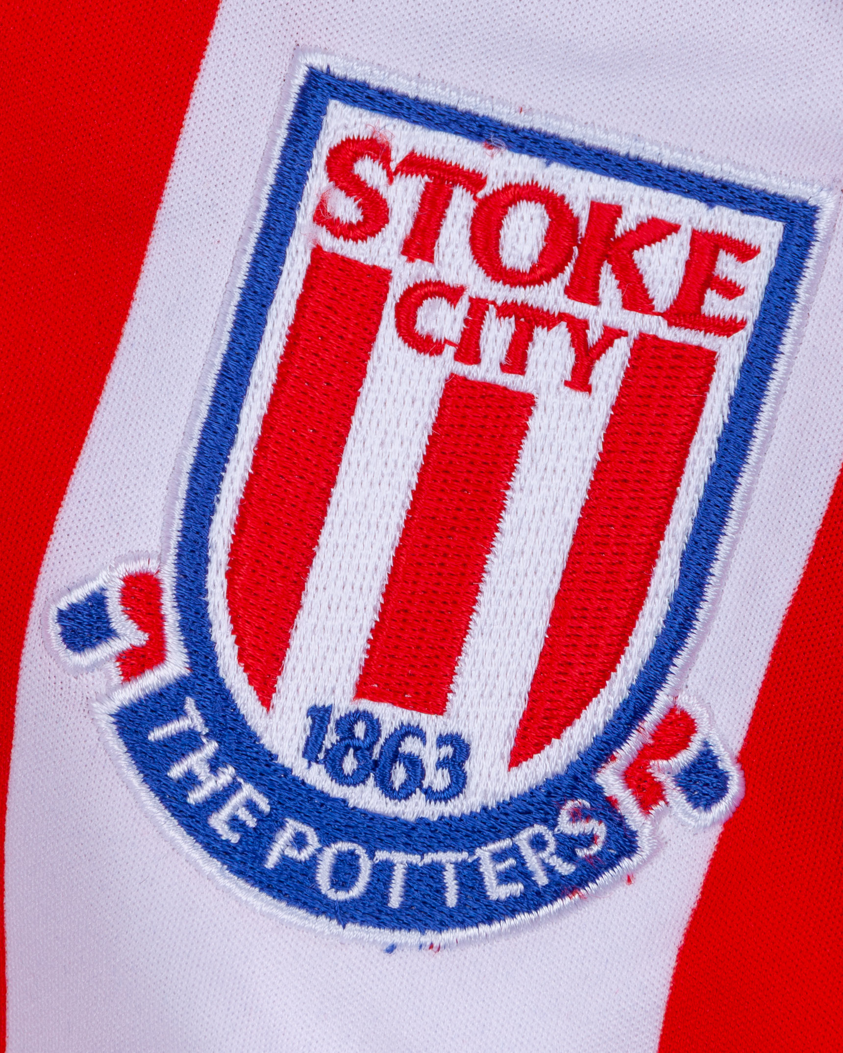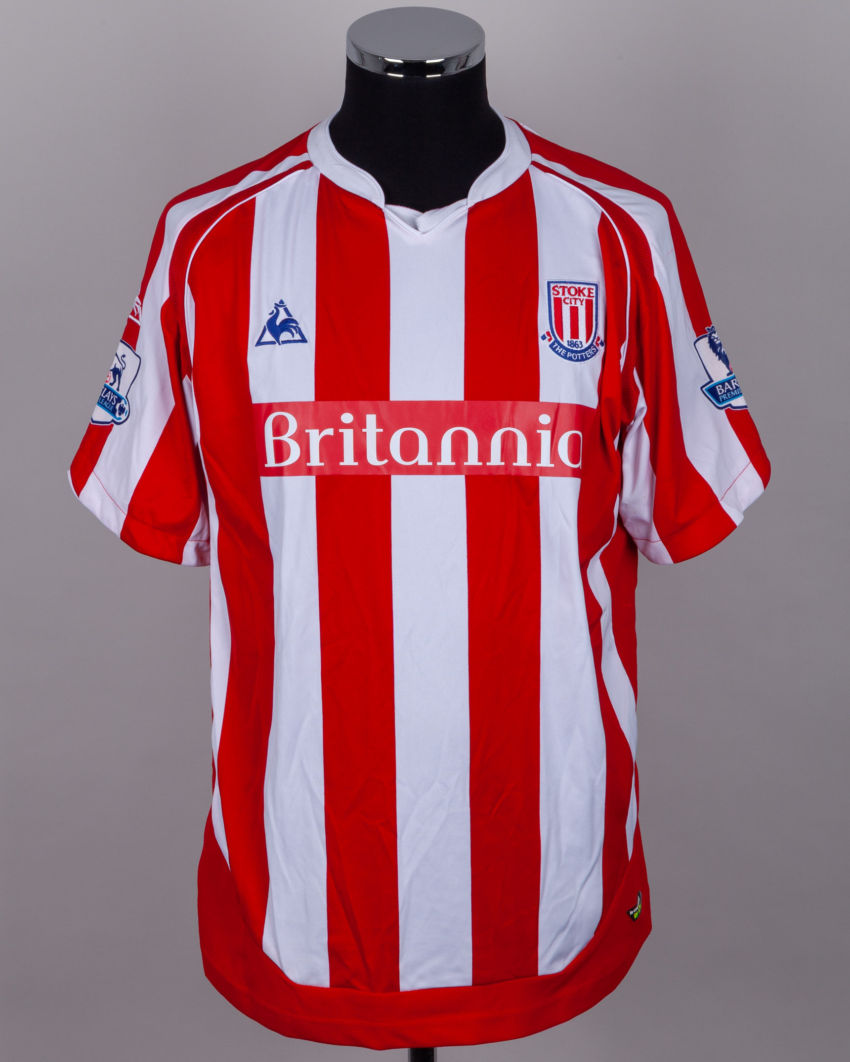James Beattie red and white No.9 Stoke City short-sleeved shirt, 2009-10, Le Coq Sportif, L, with v-neck collar and embroidered badge inscribed STOKE CITY 1863 THE POTTERS, the reverse lettered BEATTIE, the sleeves with Barclays Premier League flashes