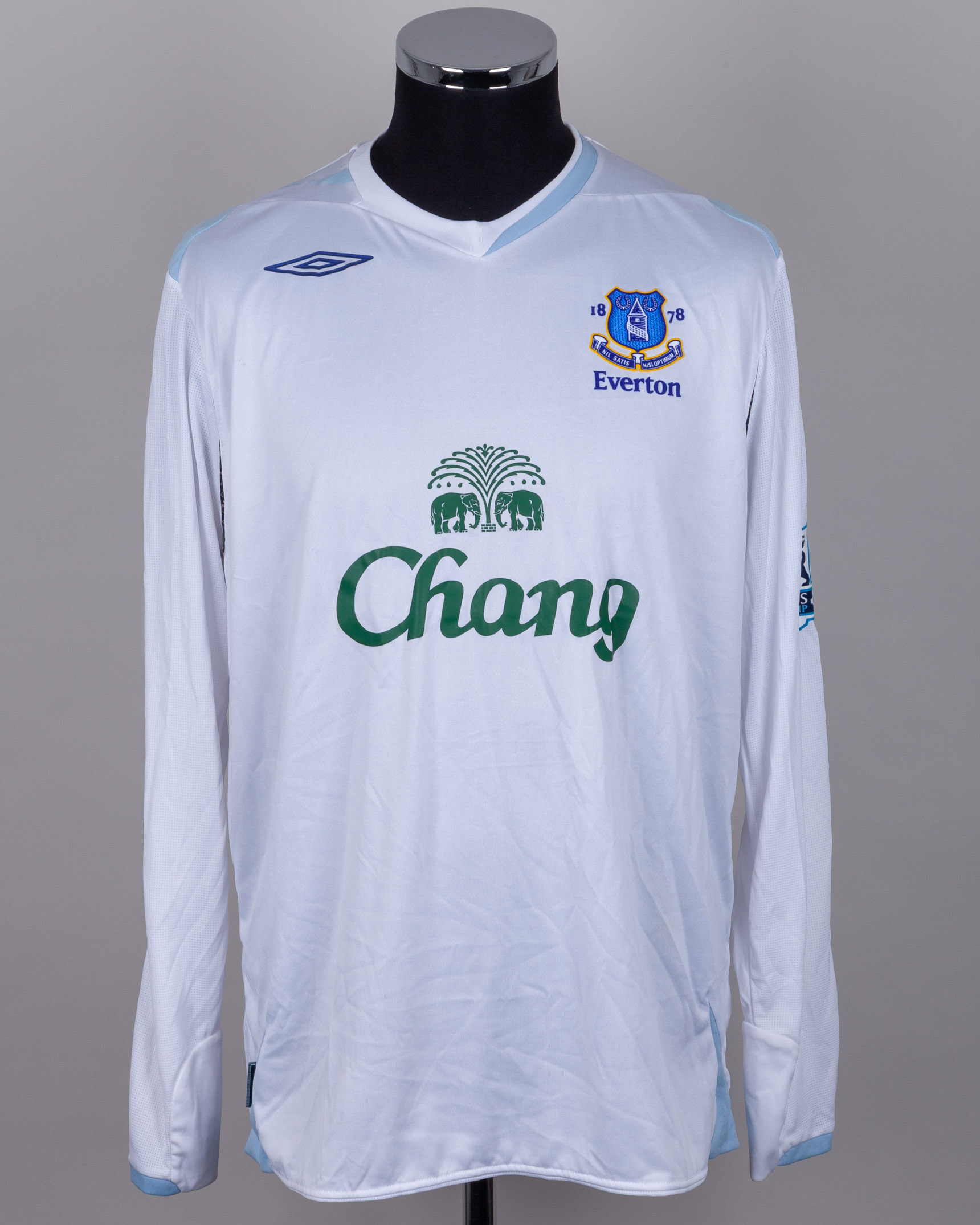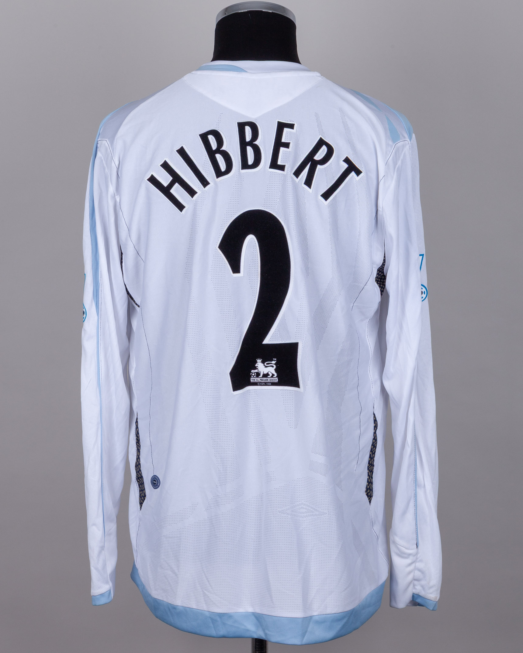 Tony Hibbert white No.2 Everton long-sleeved shirt, 2006-07, Umbro, XL, with v-neck collar and felt badge, the reverse lettered HIBBERT, the sleeves with Barclays Premiership flashes