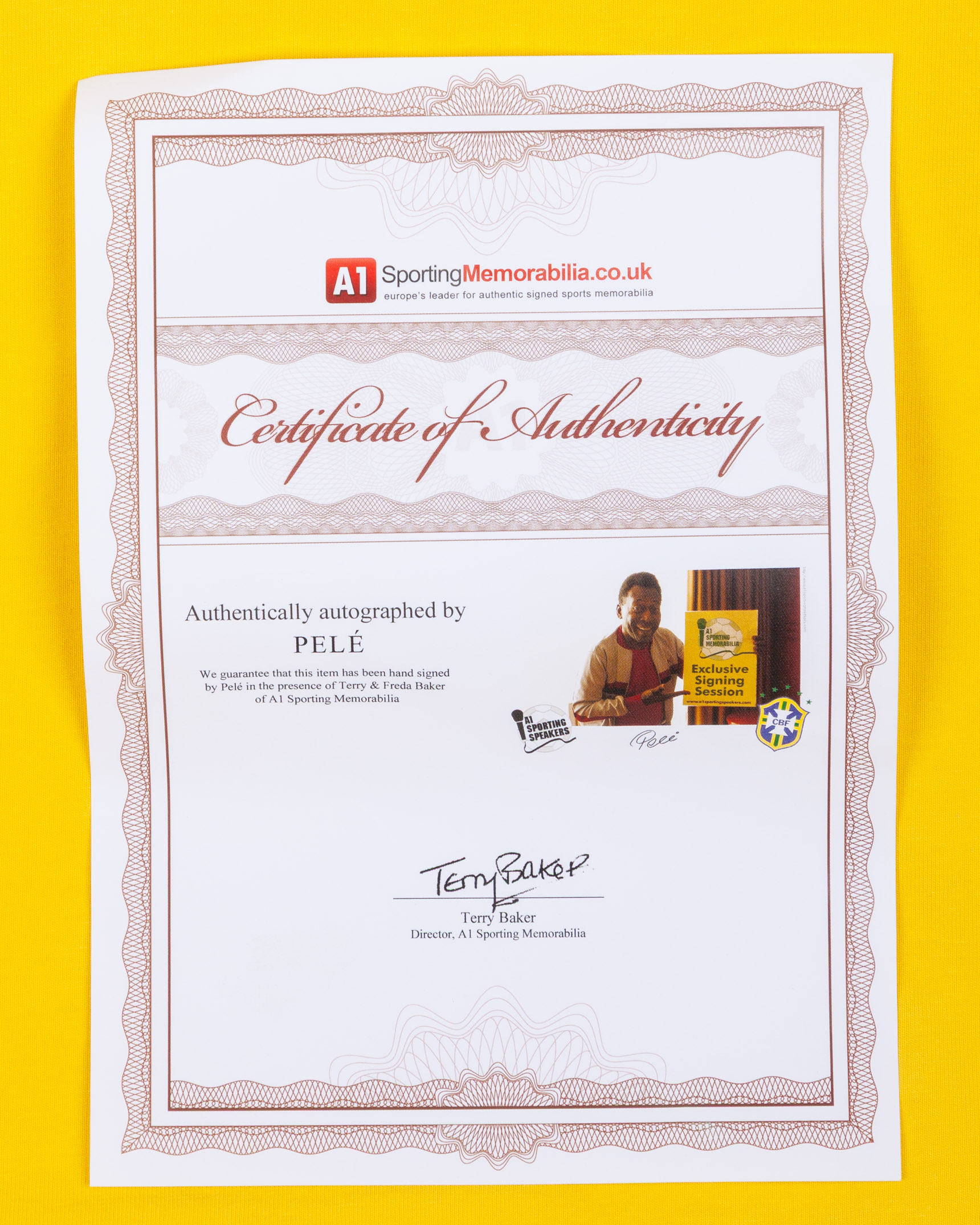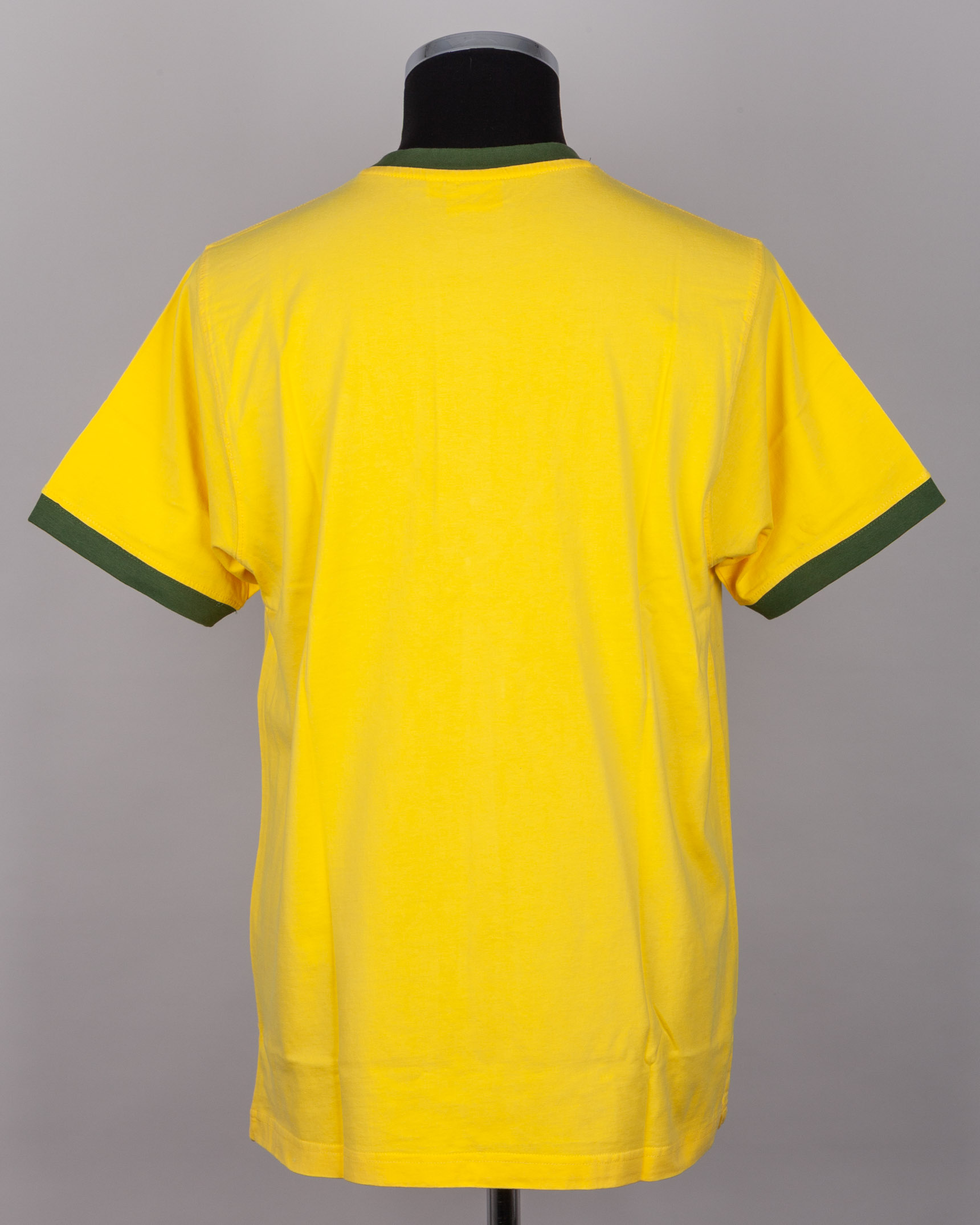Pele replica yellow Brazil autographed short-sleeved shirt, Re-Take, L, with crew-neck collar and embroidered cloth badge, with A1 COA