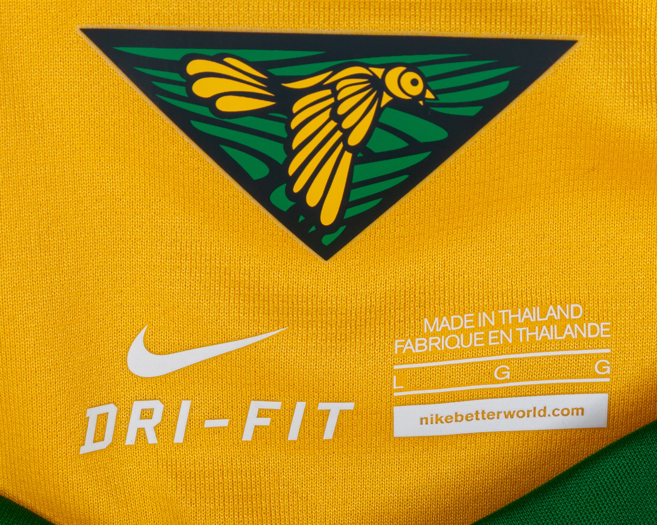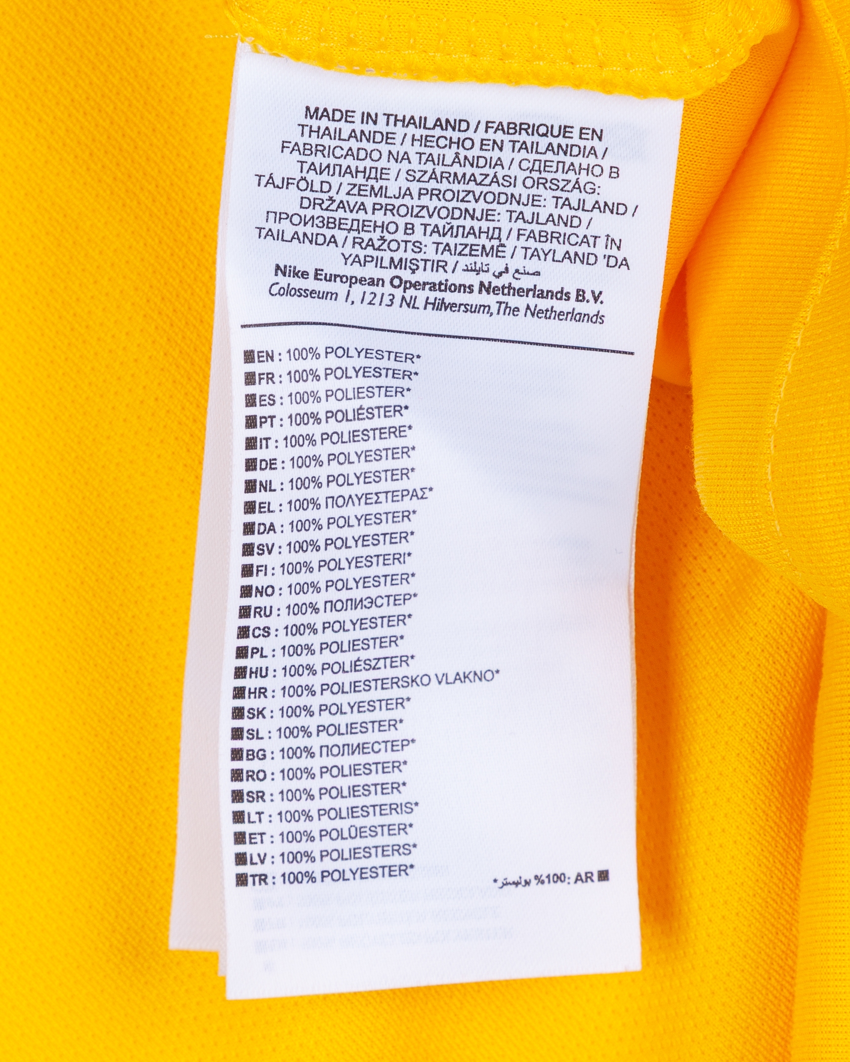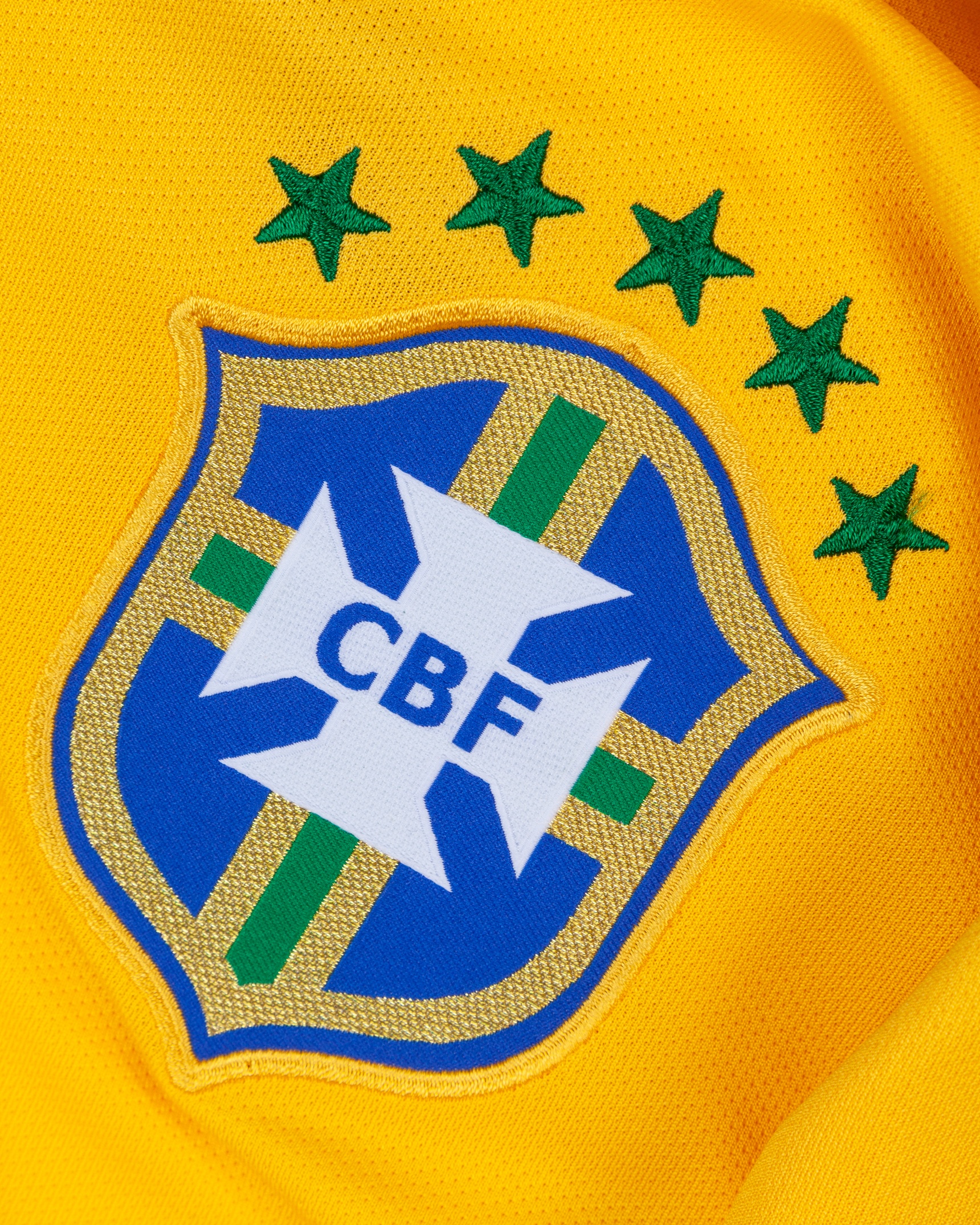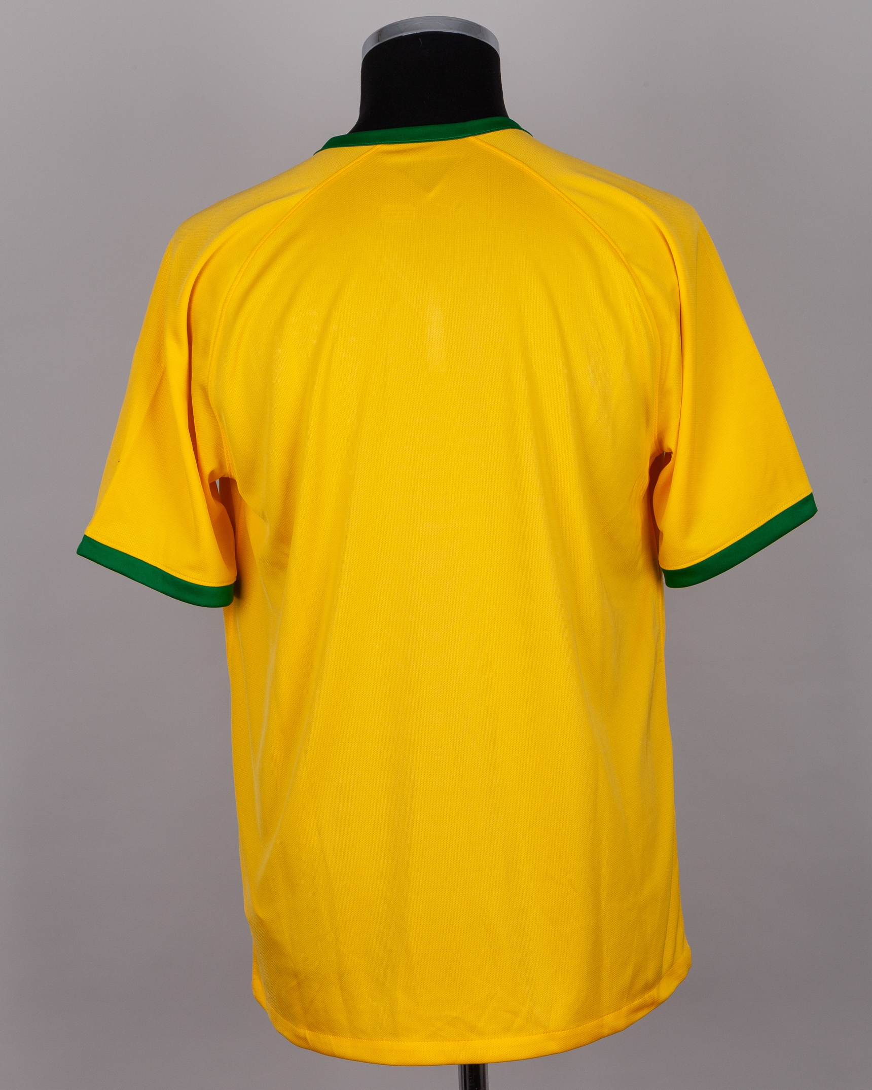 Pele autographed yellow and green Brazil replica short-sleeved shirt, Nike, L, with v-neck collar and embroidered cloth badge inscribed CBF