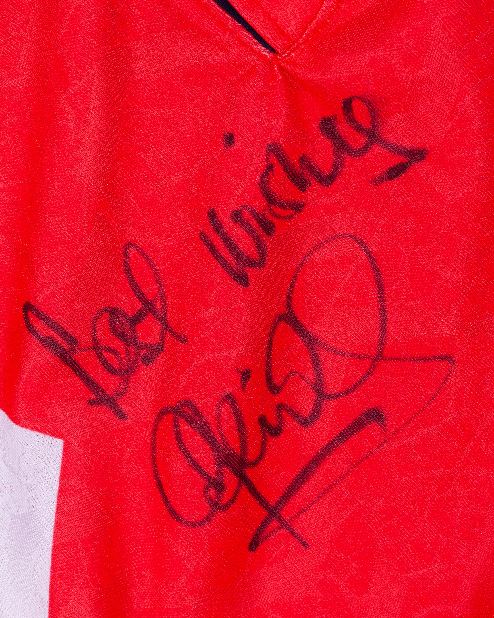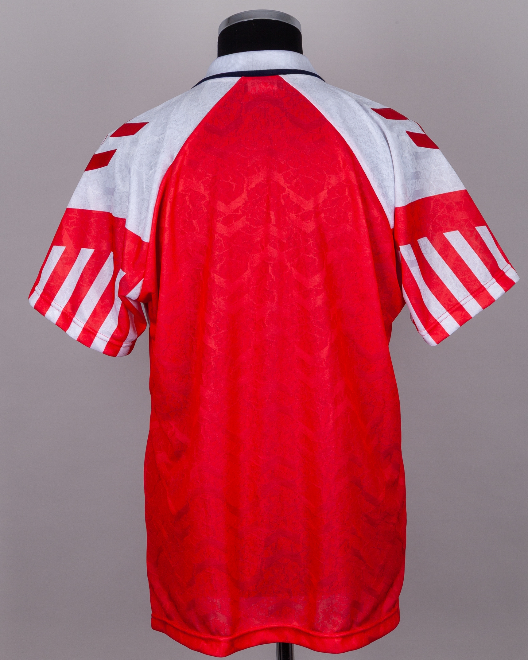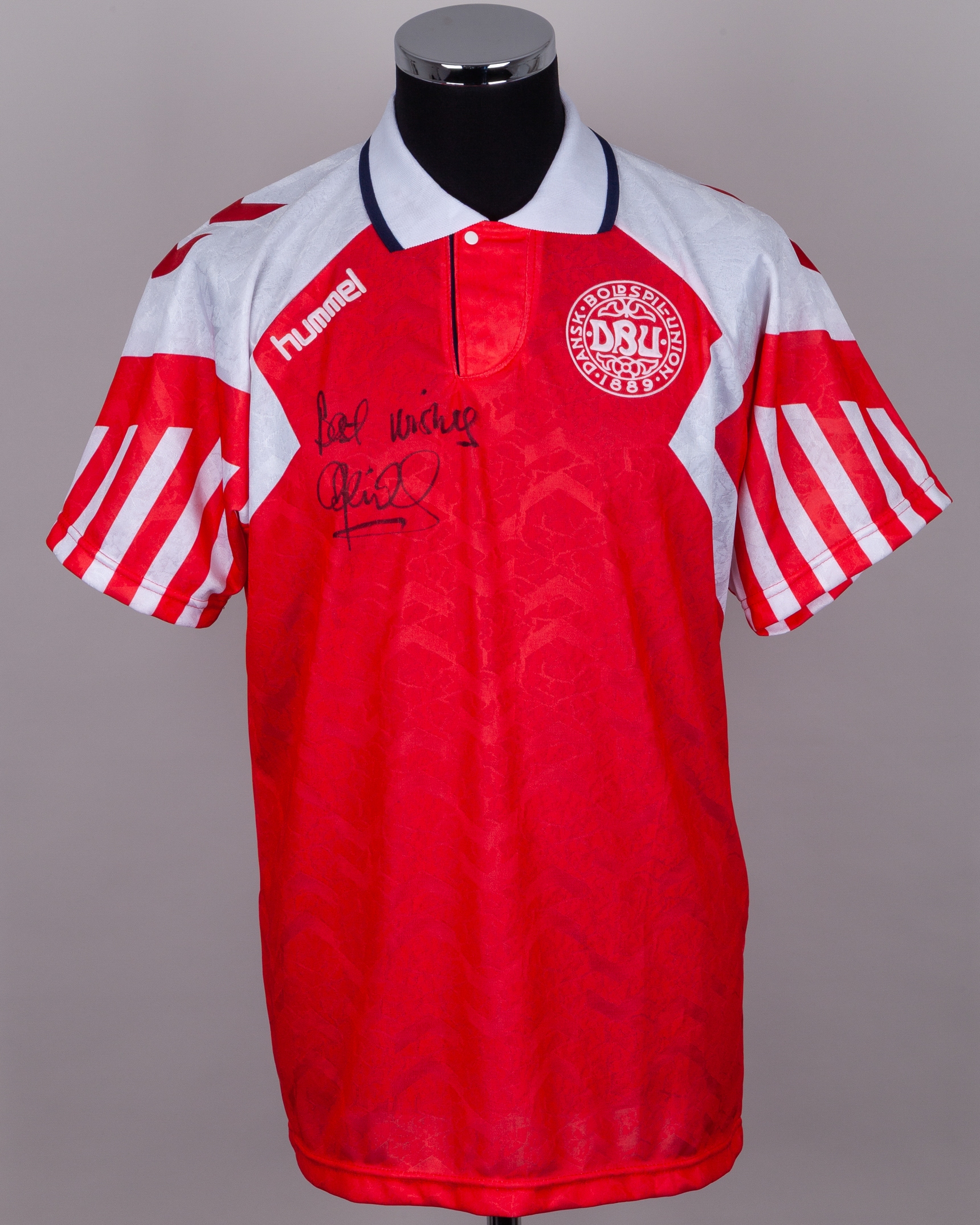 A Peter Schmeichel autographed red and white Denmark replica short-sleeved shirt