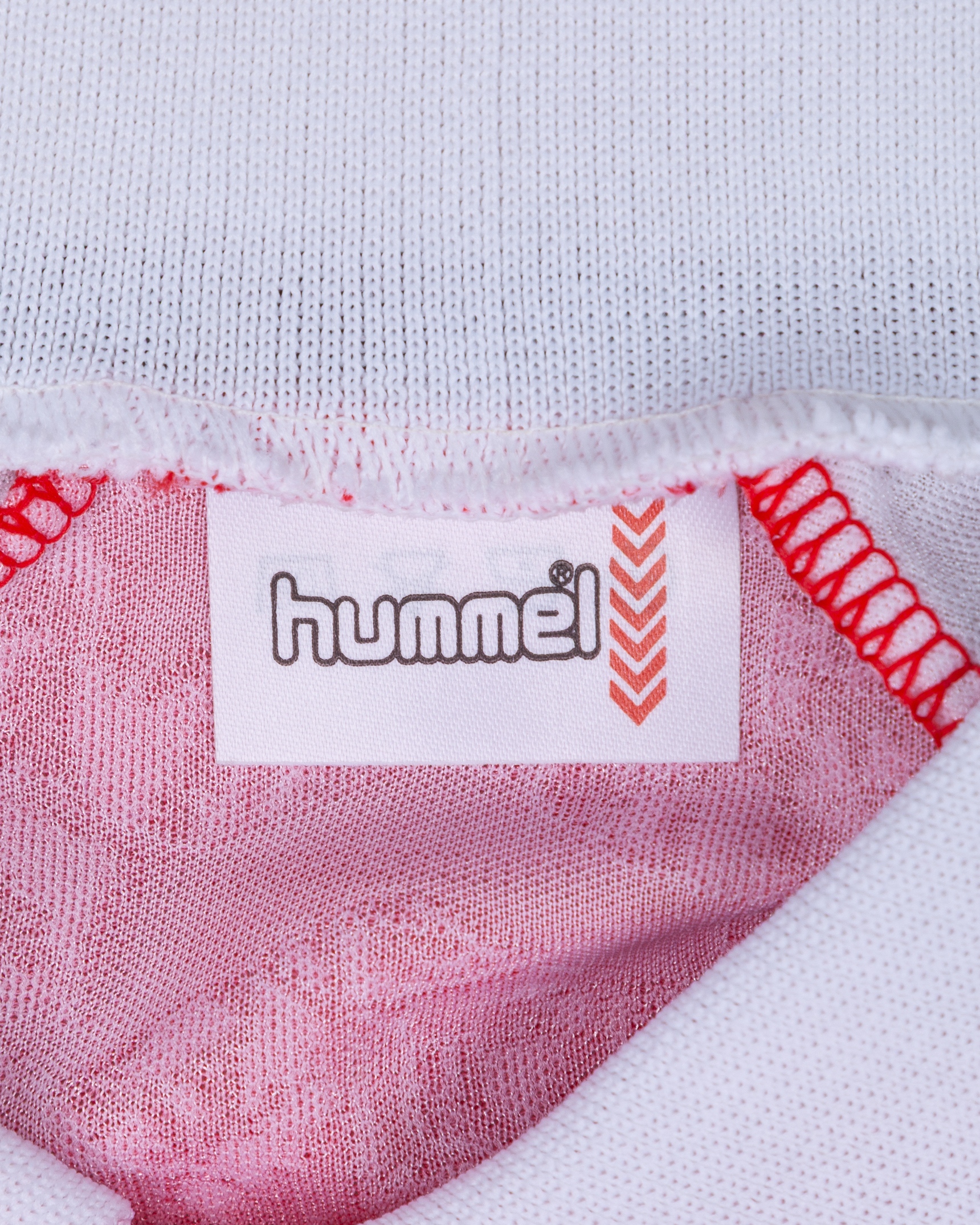 A Peter Schmeichel autographed red and white Denmark replica short-sleeved shirt, Hummel, L, with button-up collar and felt badge