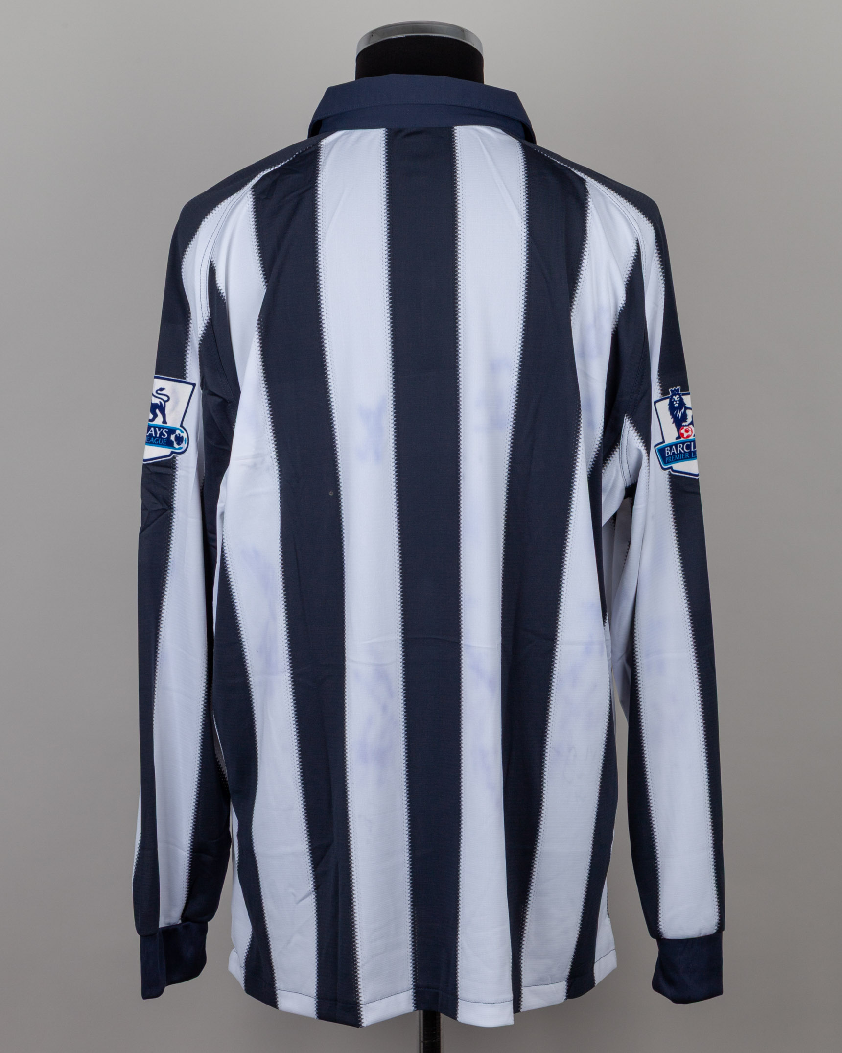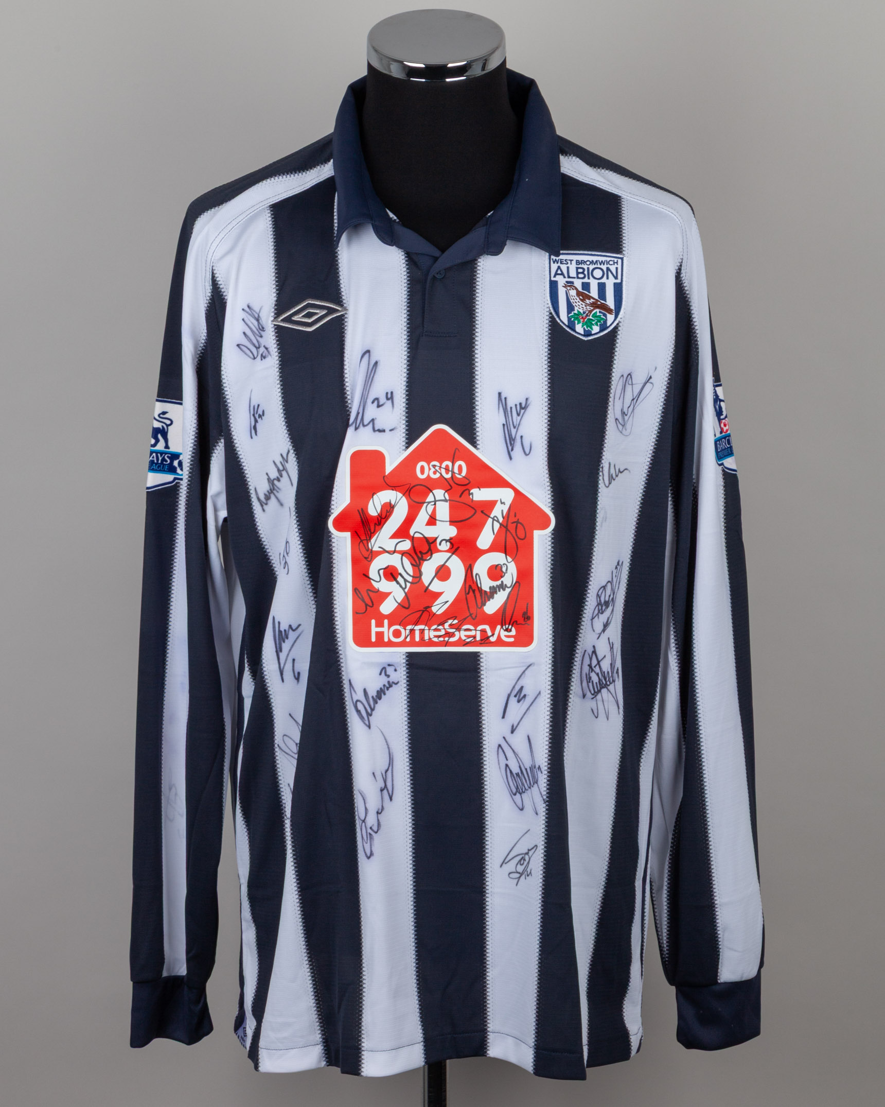 Replica blue and white West Bromwich Albion autographed long-sleeved shirt, Umbro, XXL, with button-up collar and embroidered cloth badge inscribed WEST BROMWICH ALBION, the sleeves with Barclays Premier League flashes, with approximately twenty-six autographs
