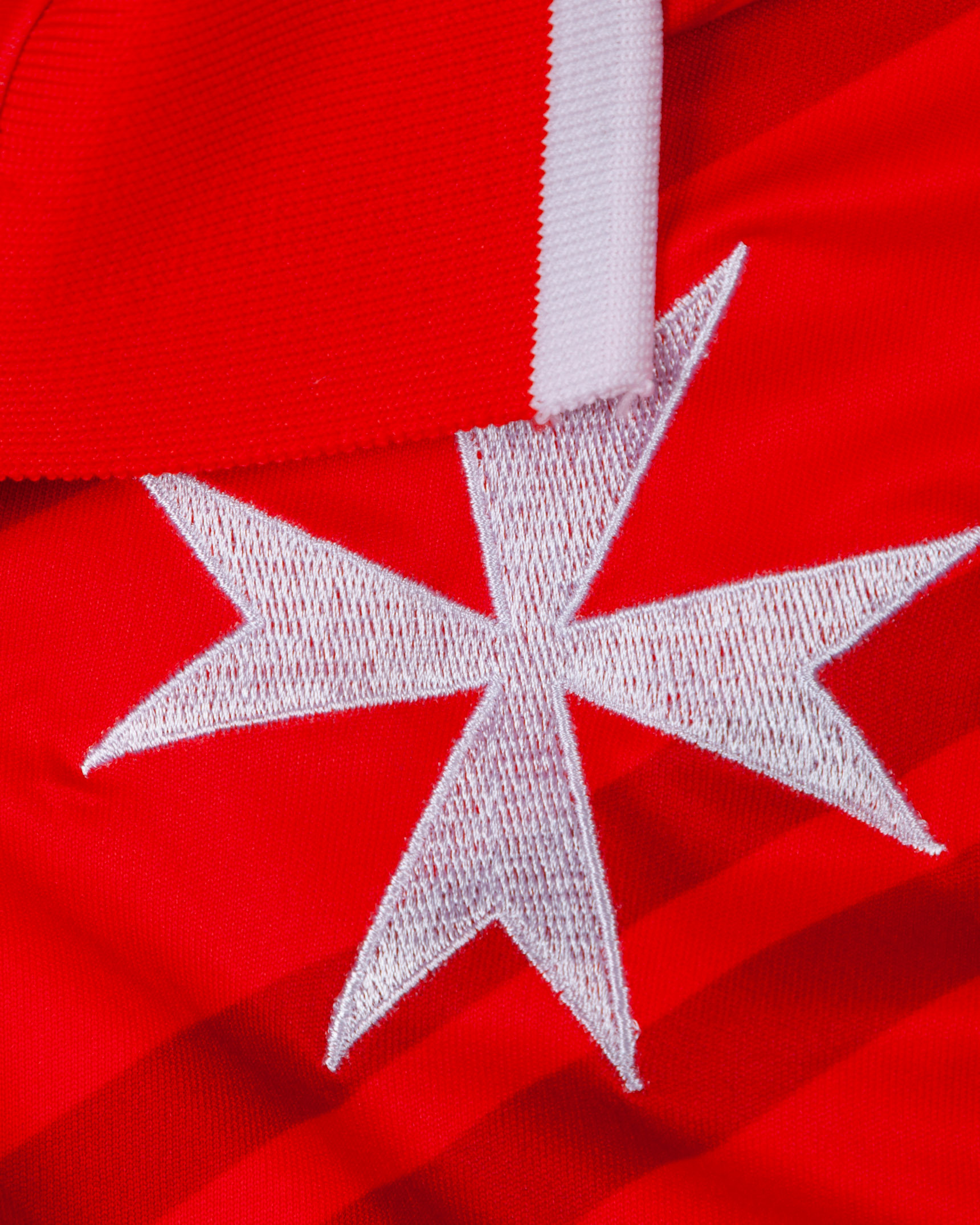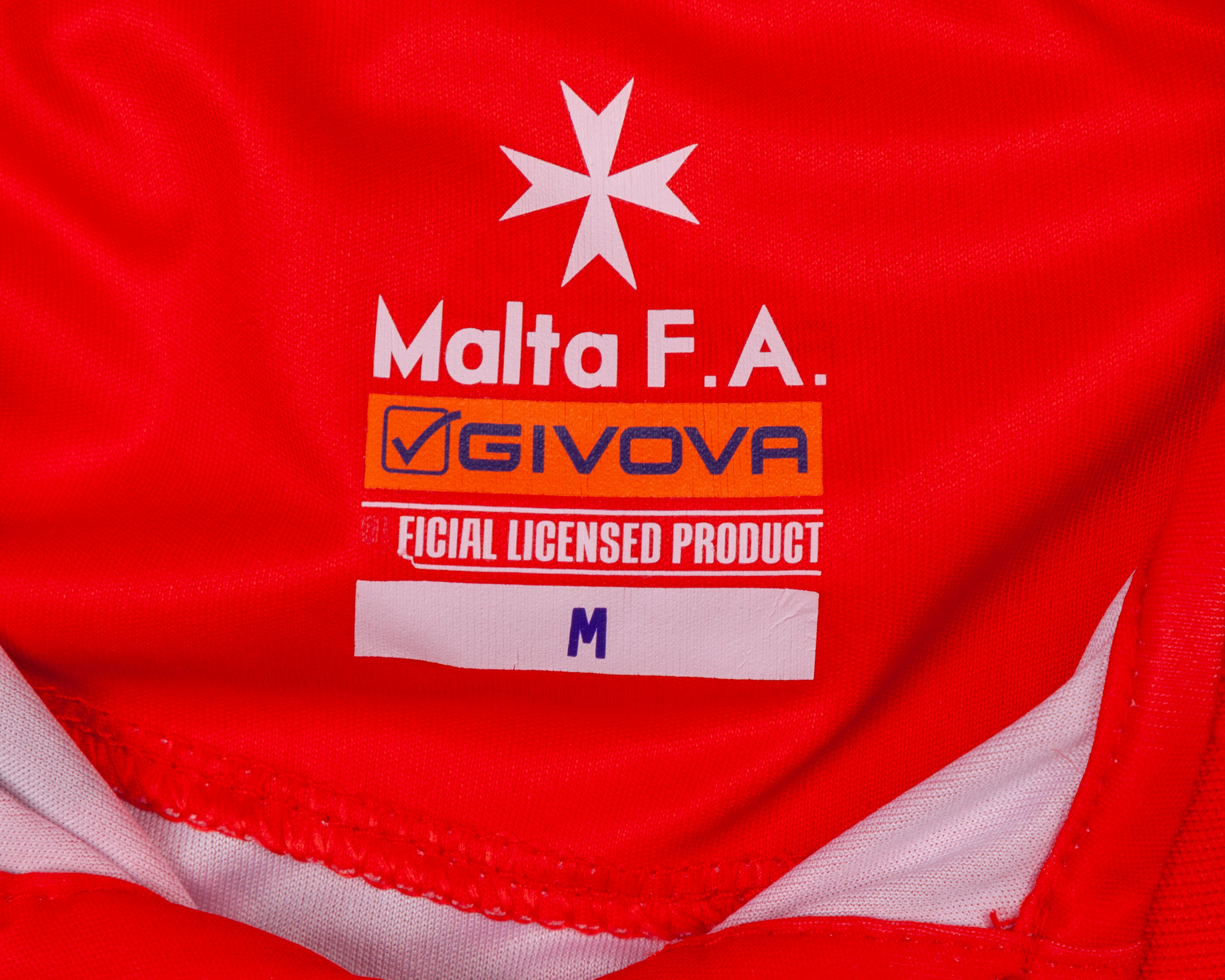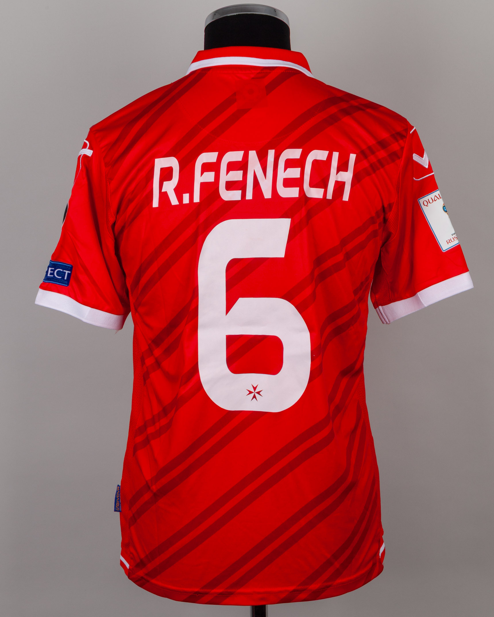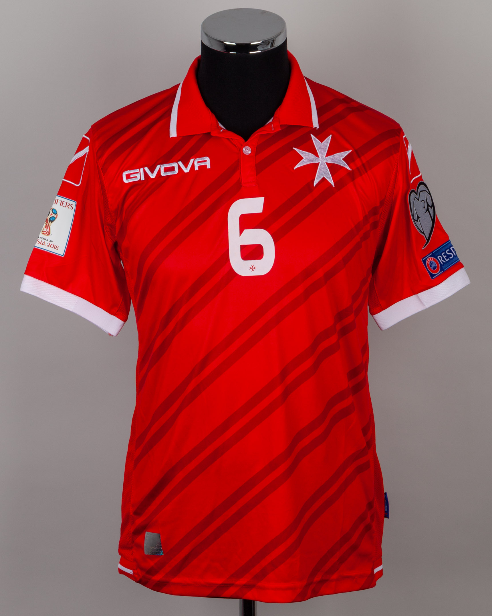 Ryan Fenech red No.6 Malta short-sleeved shirt, Givova, M, with buttoned-up collar and embroidered badge, the reverse lettered R.FENECH, the right sleeve with qualifiers FIFA World Cup Russia 2018 and the left sleeve with respect flash