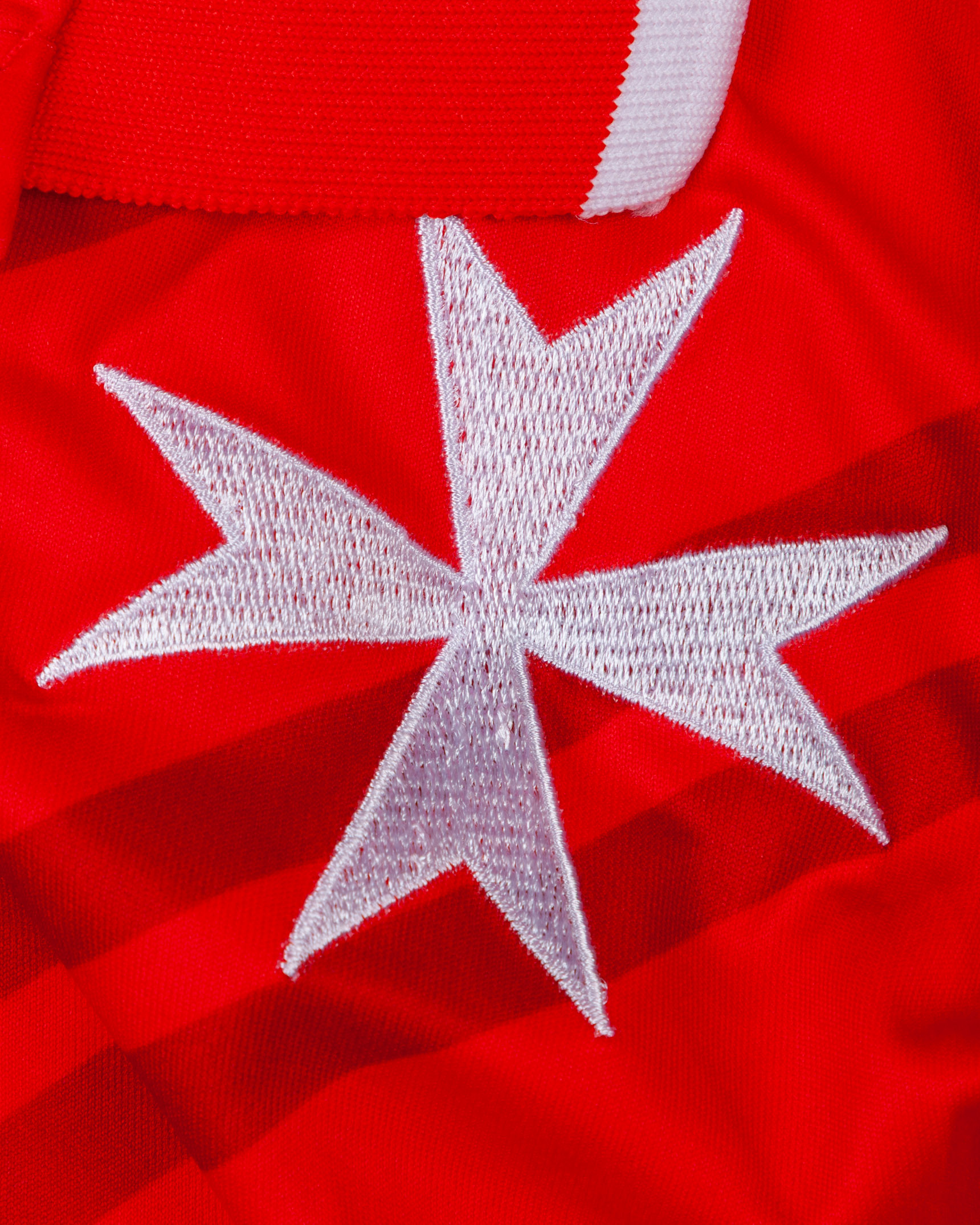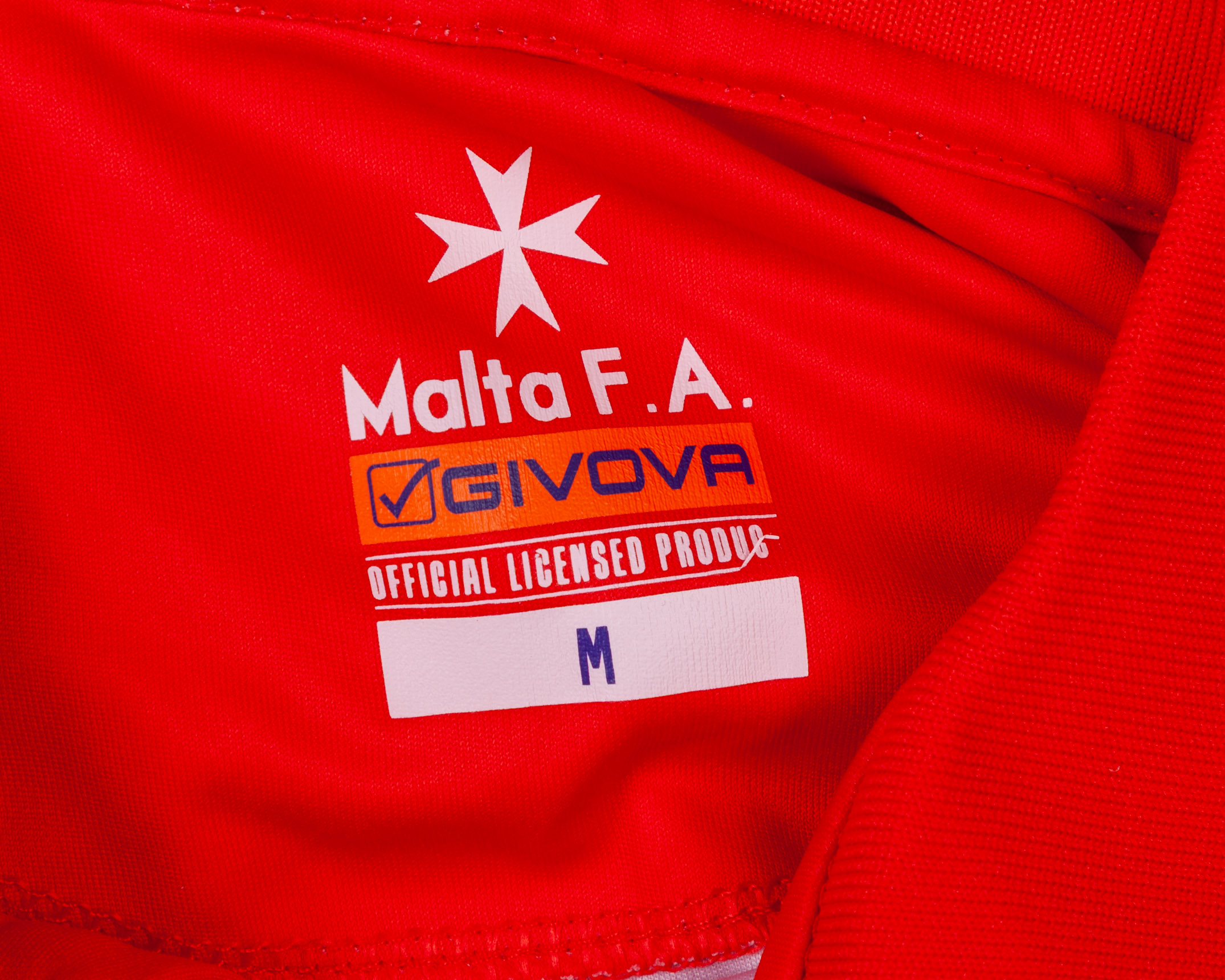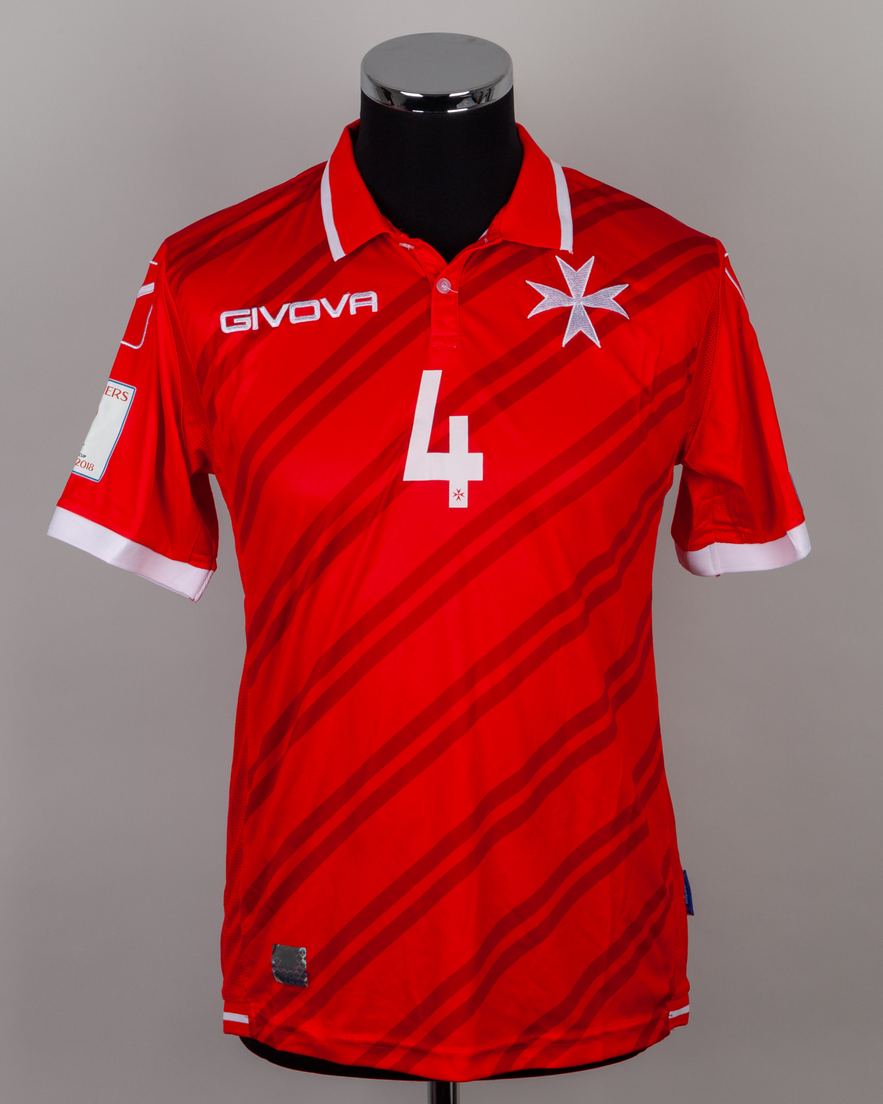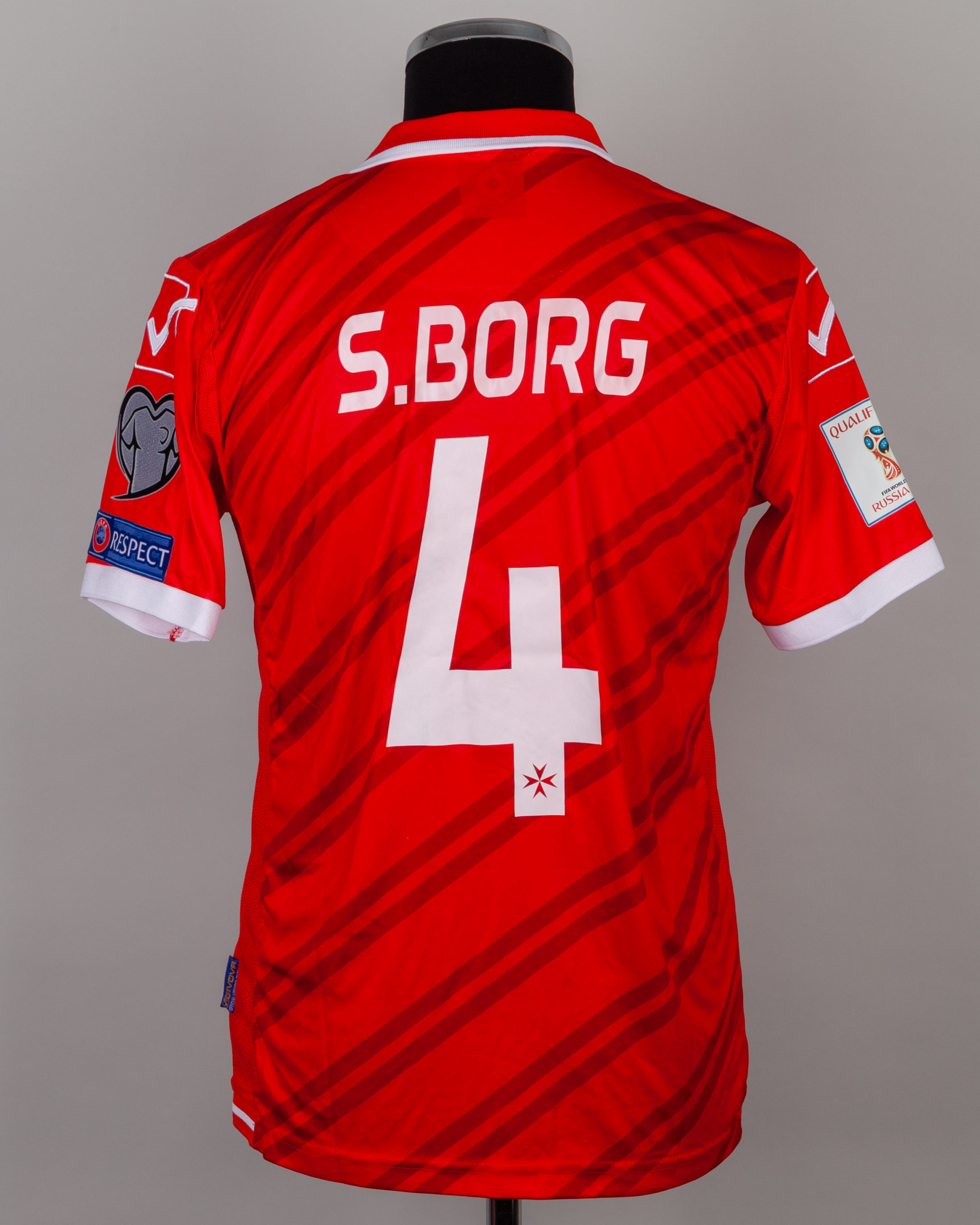 Steve Borg red No.4 Malta short-sleeved shirt, Givova, M, with buttoned-up collar and embroidered badge, the reverse lettered S.BORG, the right sleeve with qualifiers FIFA World Cup Russia 2018 and the left sleeve with respect flash