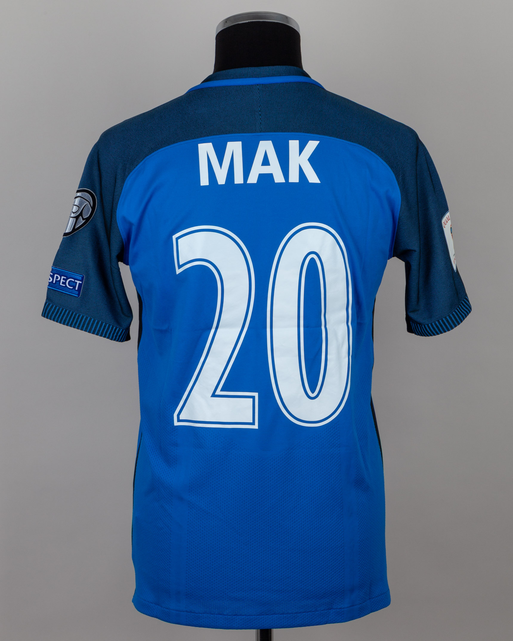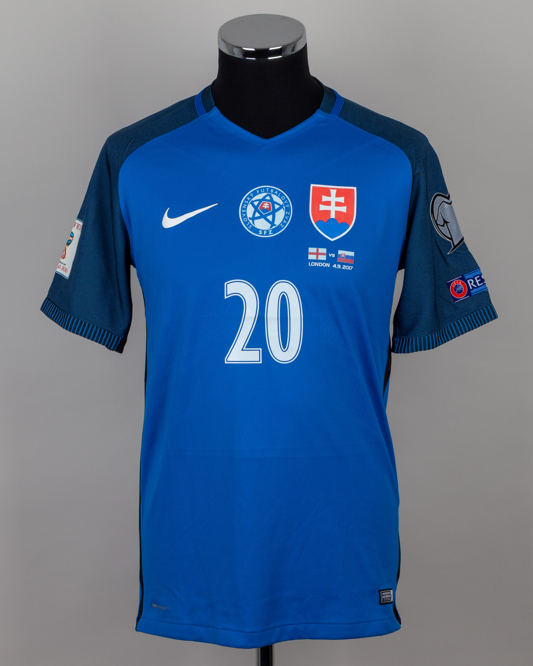 Robert Mak blue No.20 Slovakia v. England short-sleeved shirt, 2017, Nike, M, with v-neck collar and printed badge, with LONDON 4.9.2017 decal, the reverse lettered Mac, the right sleeve with qualifiers FIFA World Cup Russia 2018 and the left sleeve with respect flash