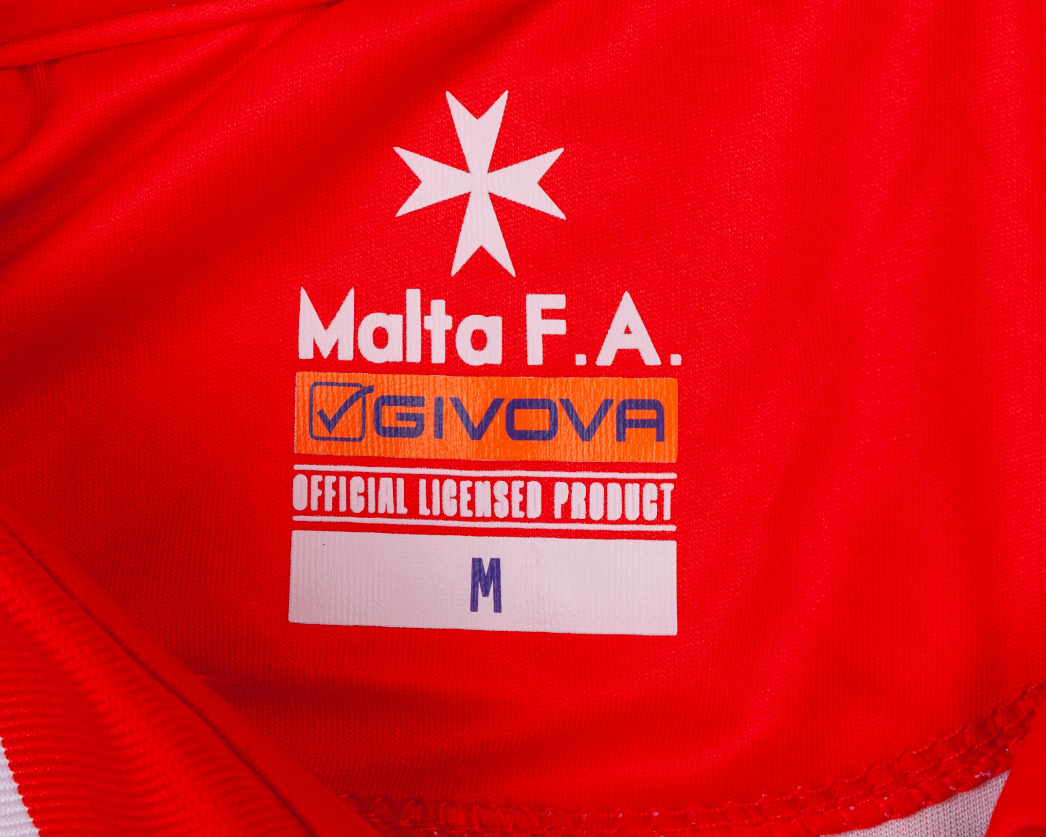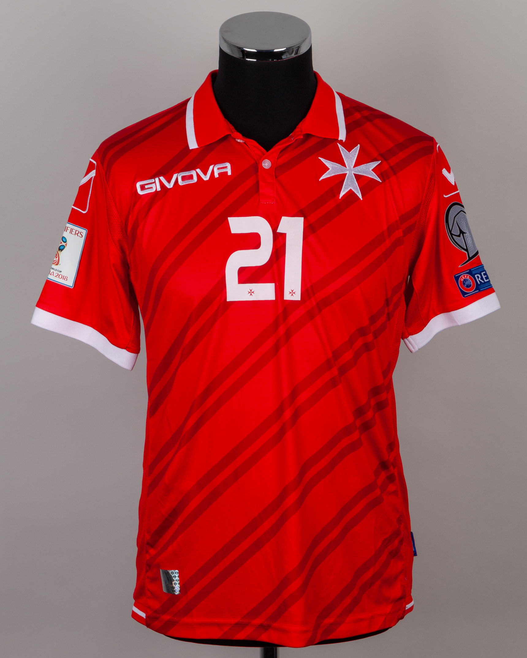 Stephen Pisani red No.21 Malta short-sleeved shirt, Givova, M, with buttoned-up collar and embroidered badge, the reverse lettered PISANI, the right sleeve with qualifiers FIFA World Cup Russia 2018 and the left sleeve with respect flash