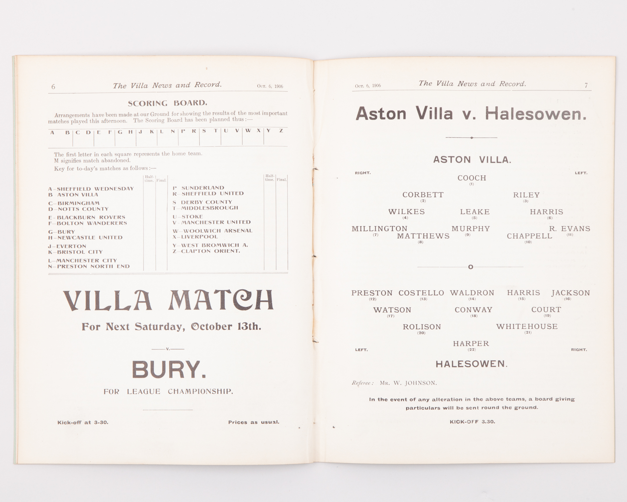 Aston Villa v. Halesowen, match programme, 6th October 1906, ex bound volume