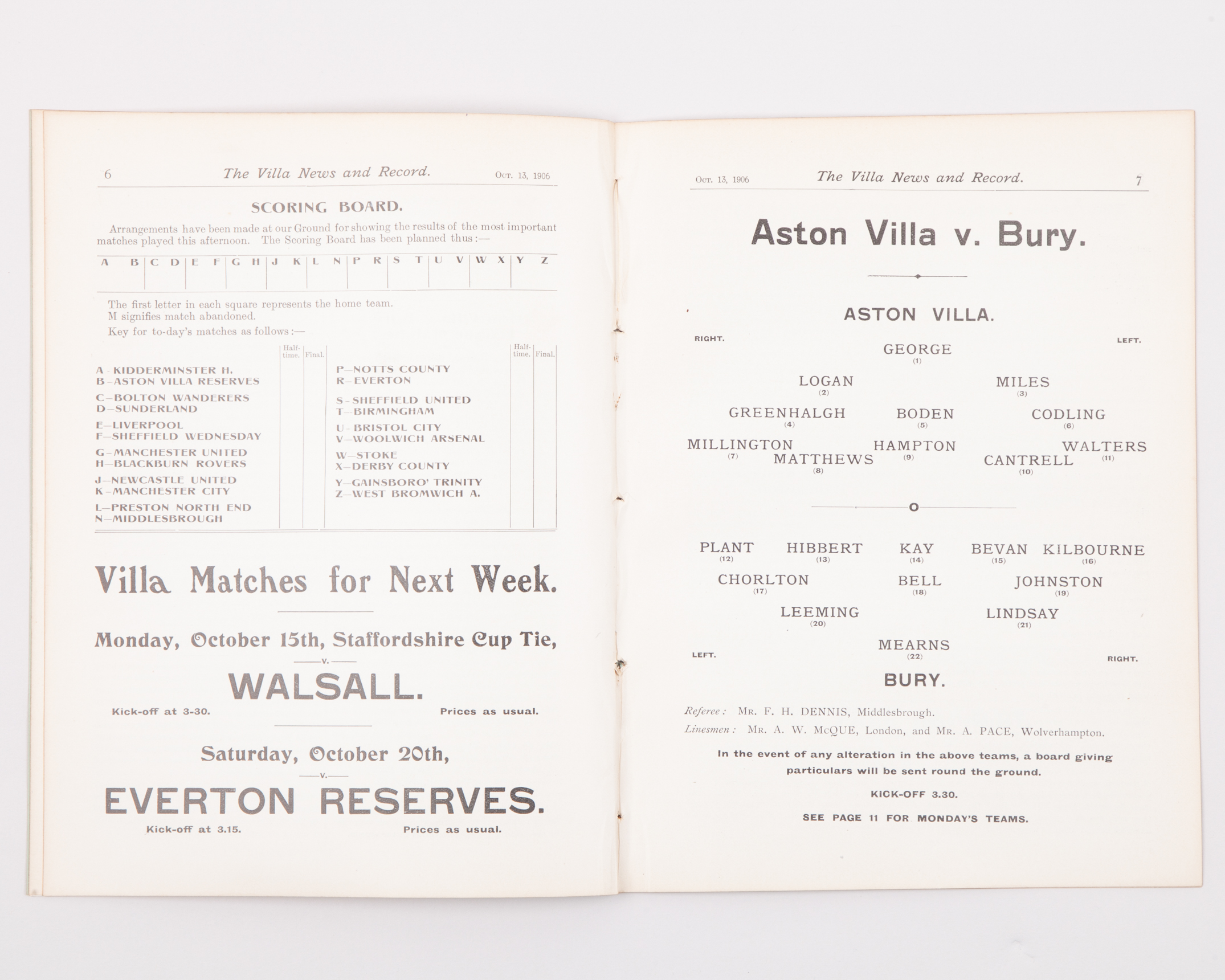 Aston Villa v. Bury, match programme, 13th October 1906, ex bound volume