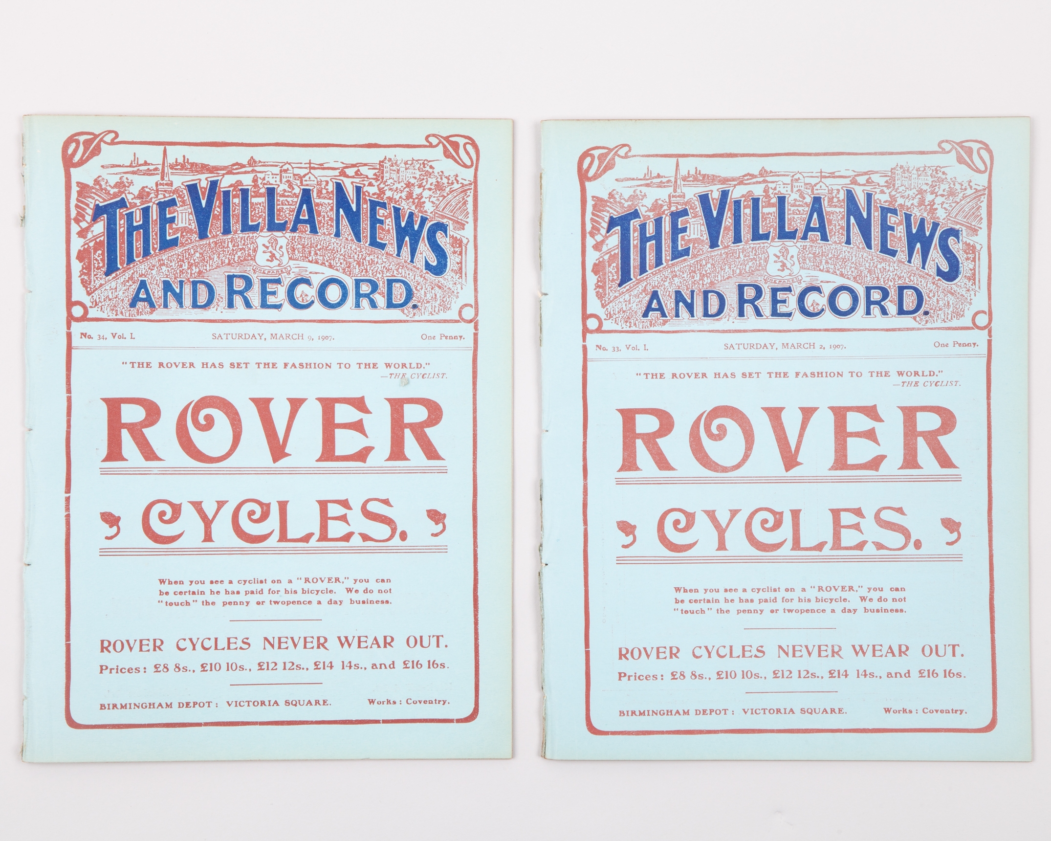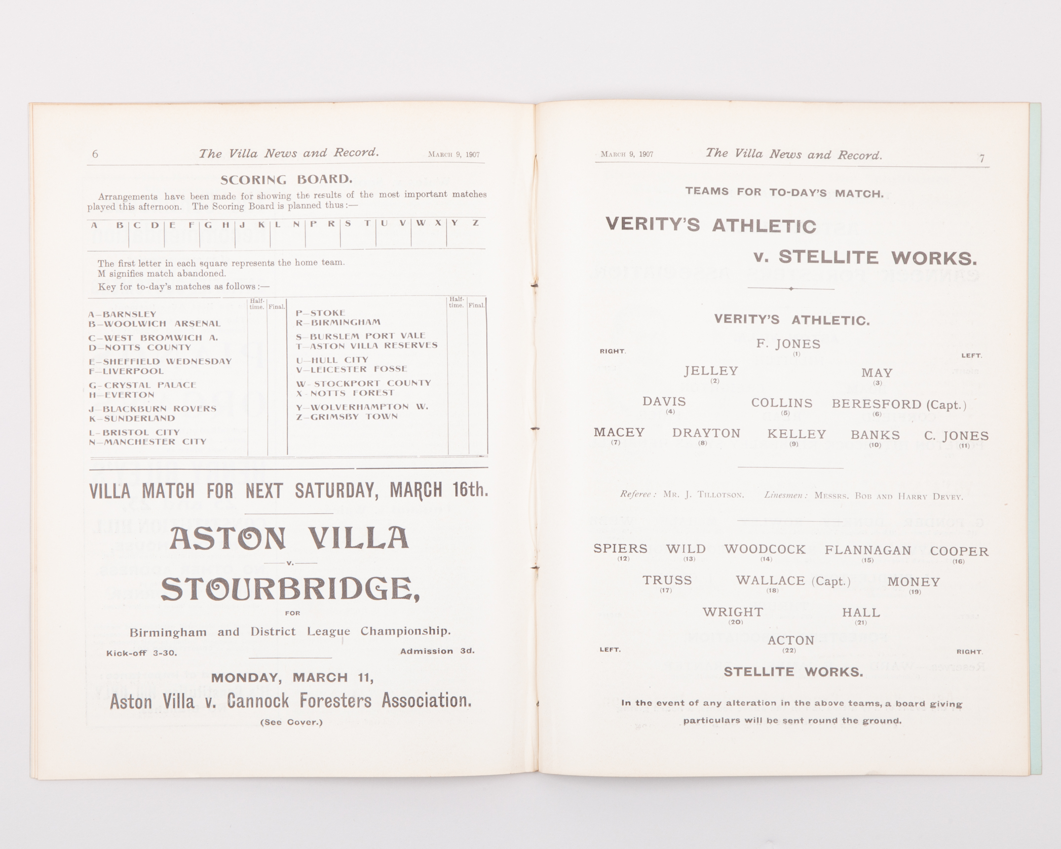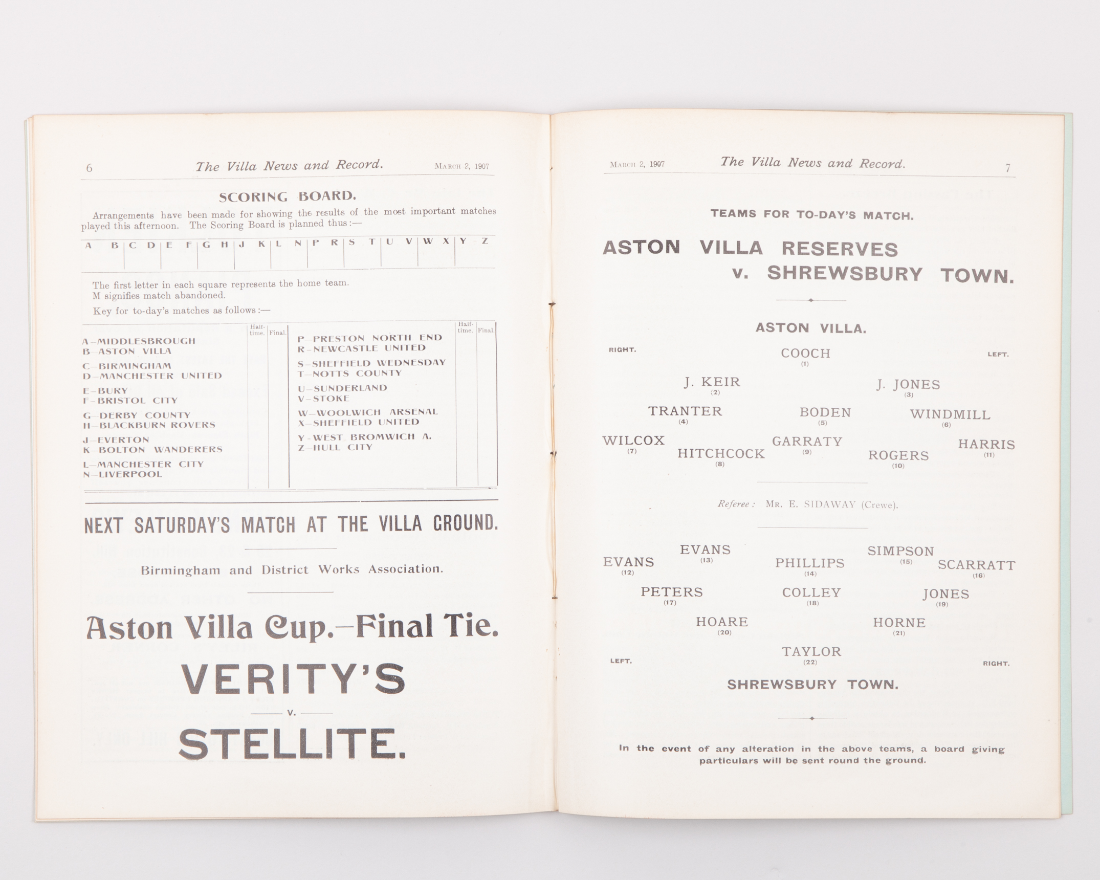 Aston Villa Reserves v. Shrewsbury Town, match programme, 2nd March 1907 and Verity's Athletic v. Stellite Works, match programme, 9th March 1907, ex bound volume (2)