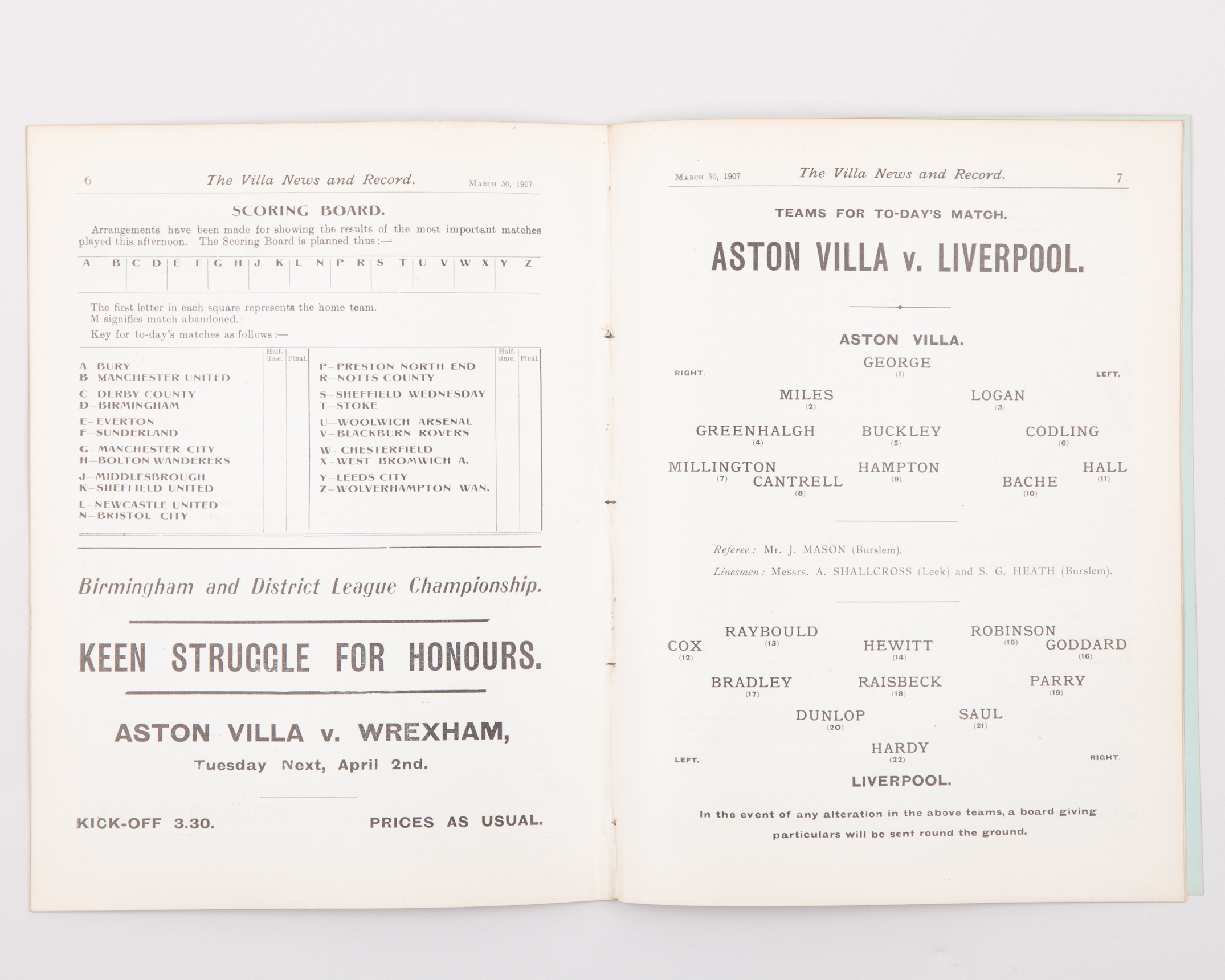 Aston Villa v. Liverpool, match programme, 30th March 1907, ex bound volume