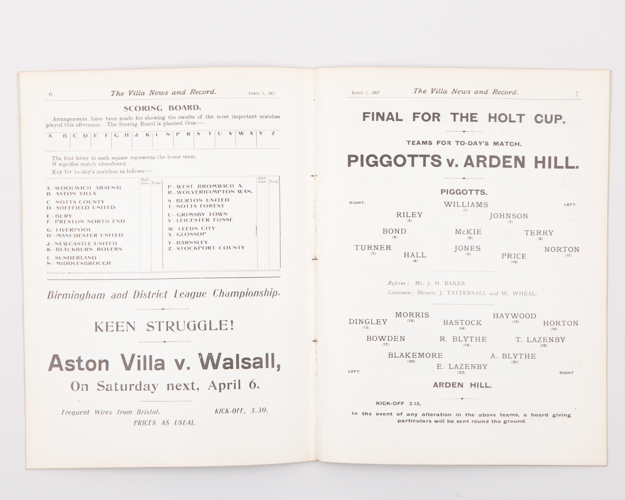 Piggotts v. Arden Hill, Holt Cup Final, match programme and Belliss & Morcom v. Stellite Works, combined match programme, 1st April 1907, ex bound volume