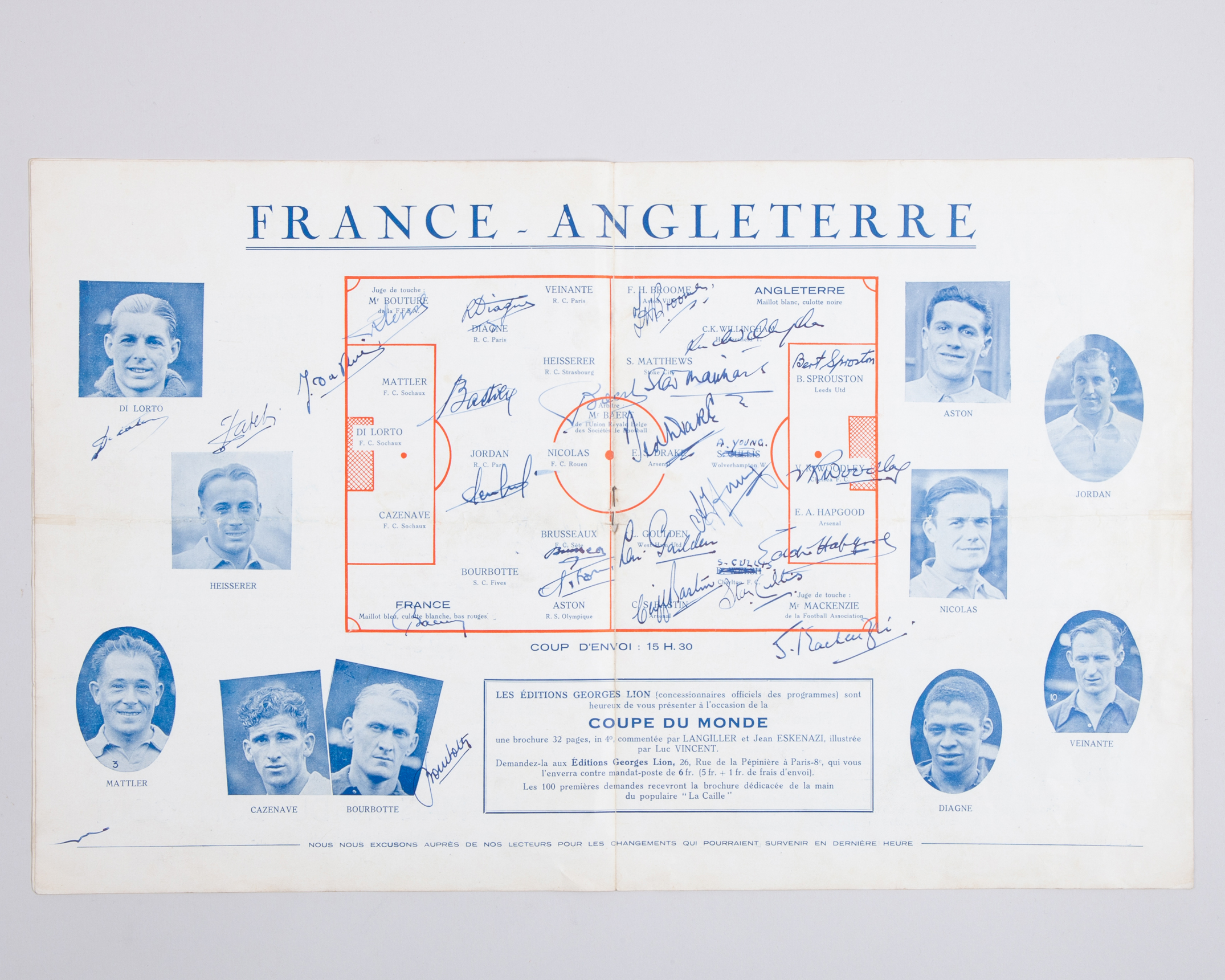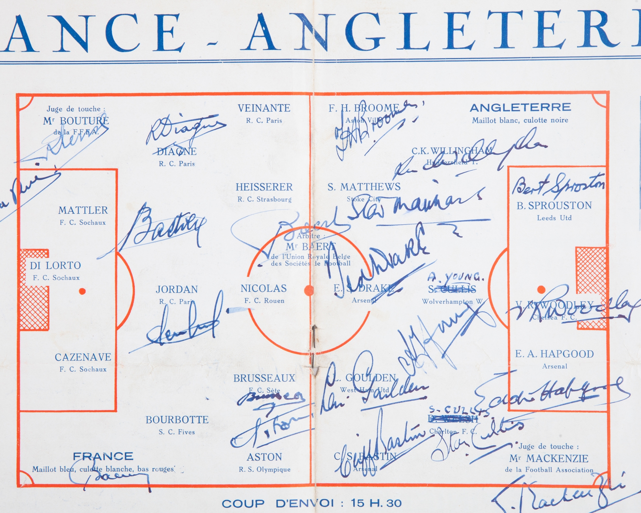 France v. England International match programme, 26th May 1938, the team line-up pages autographed by both sides, signs of fold, some staining