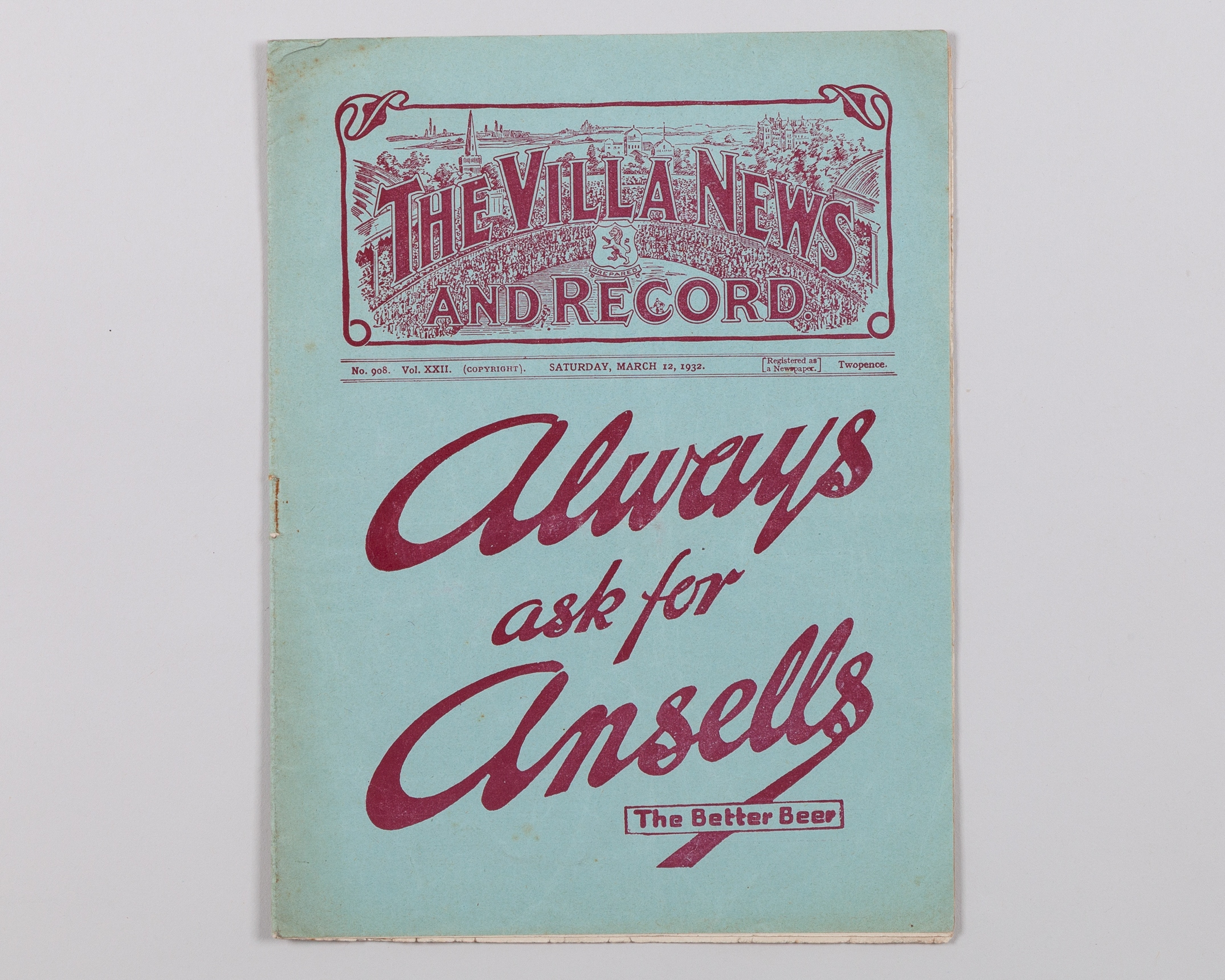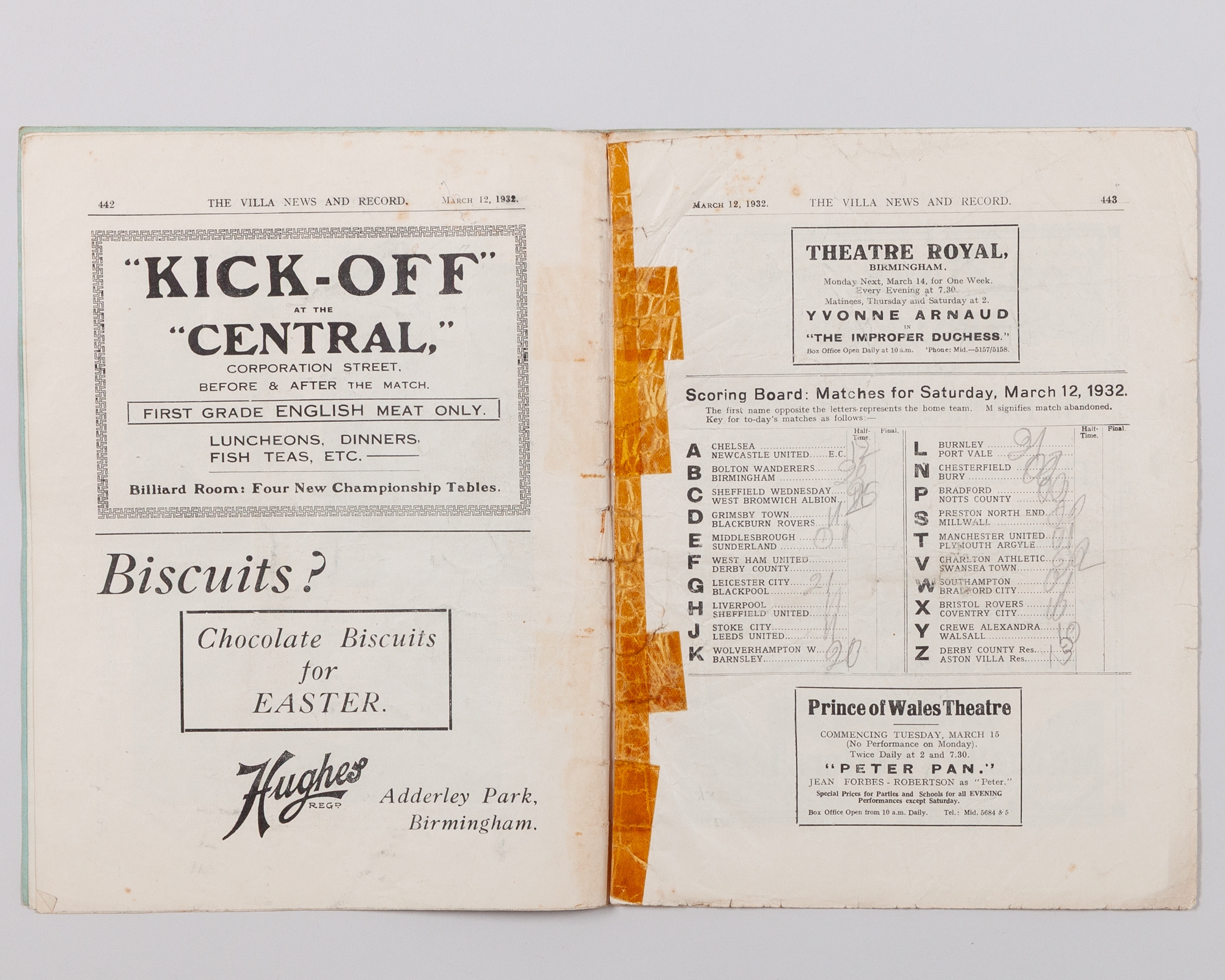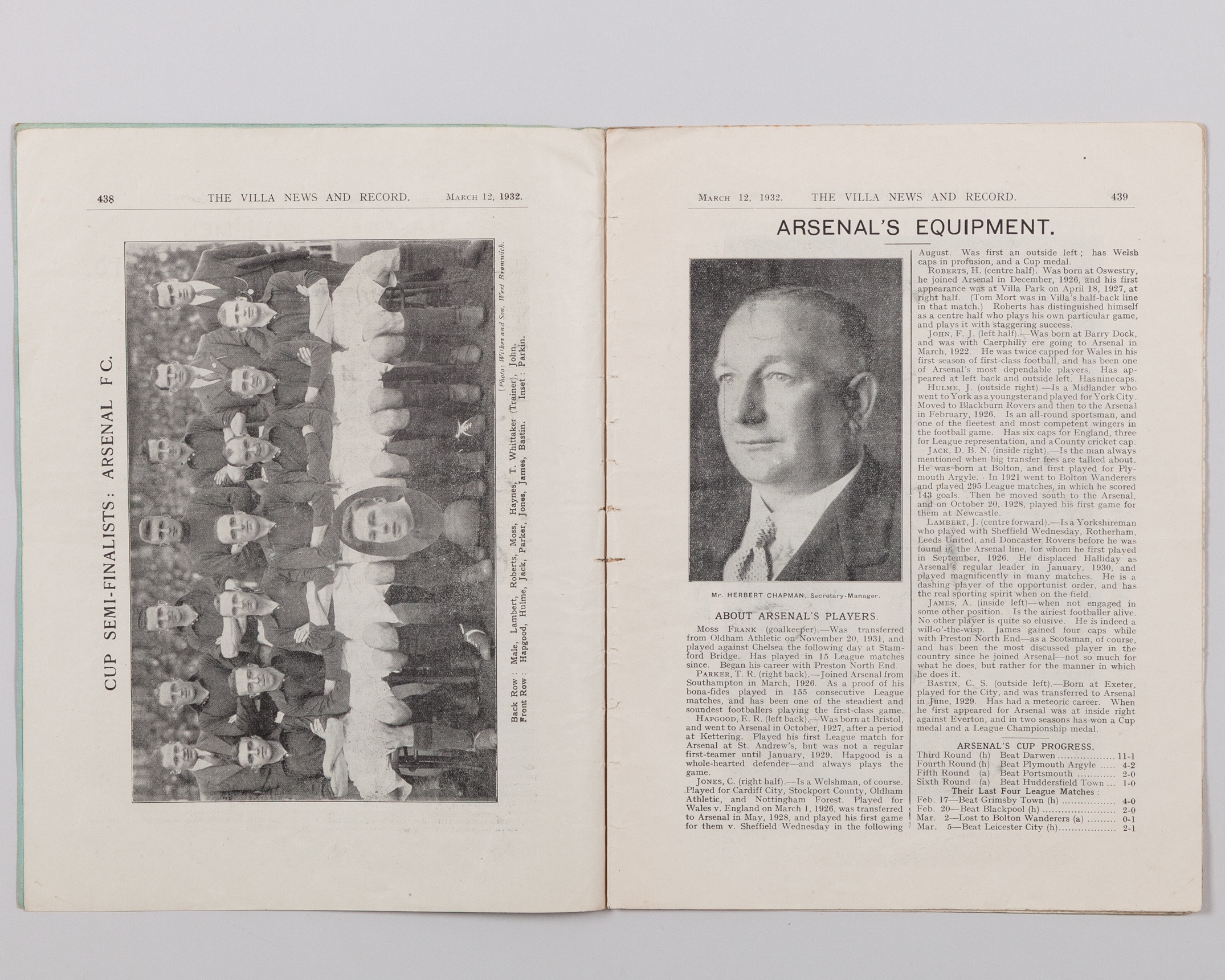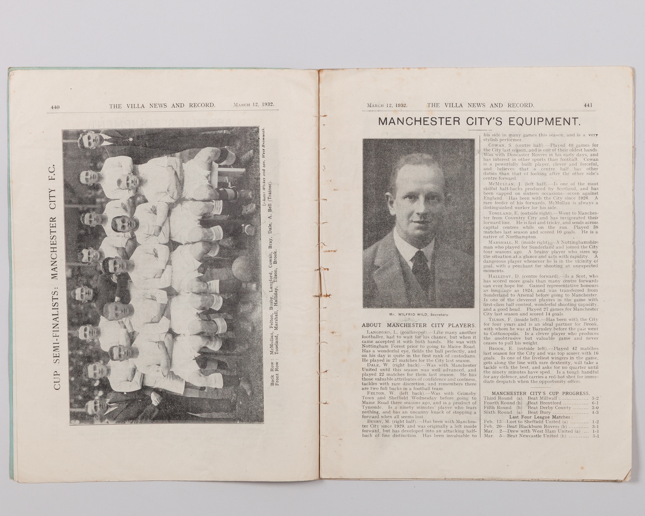 Arsenal v. Manchester City F.A.Cup Semi-Final match programme, 12th March 1932, match played at Villa Park, team pages loose, page taped and pencil text