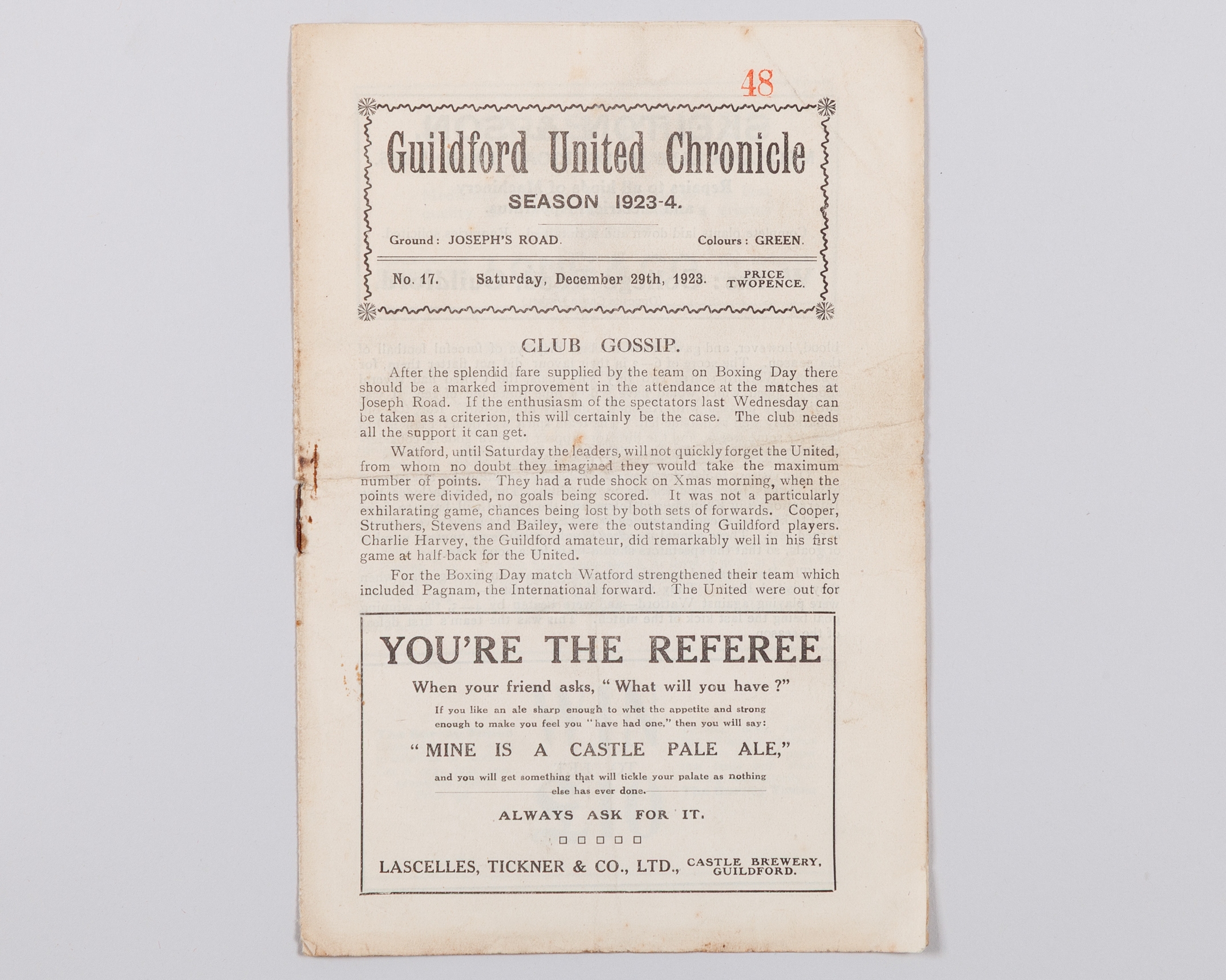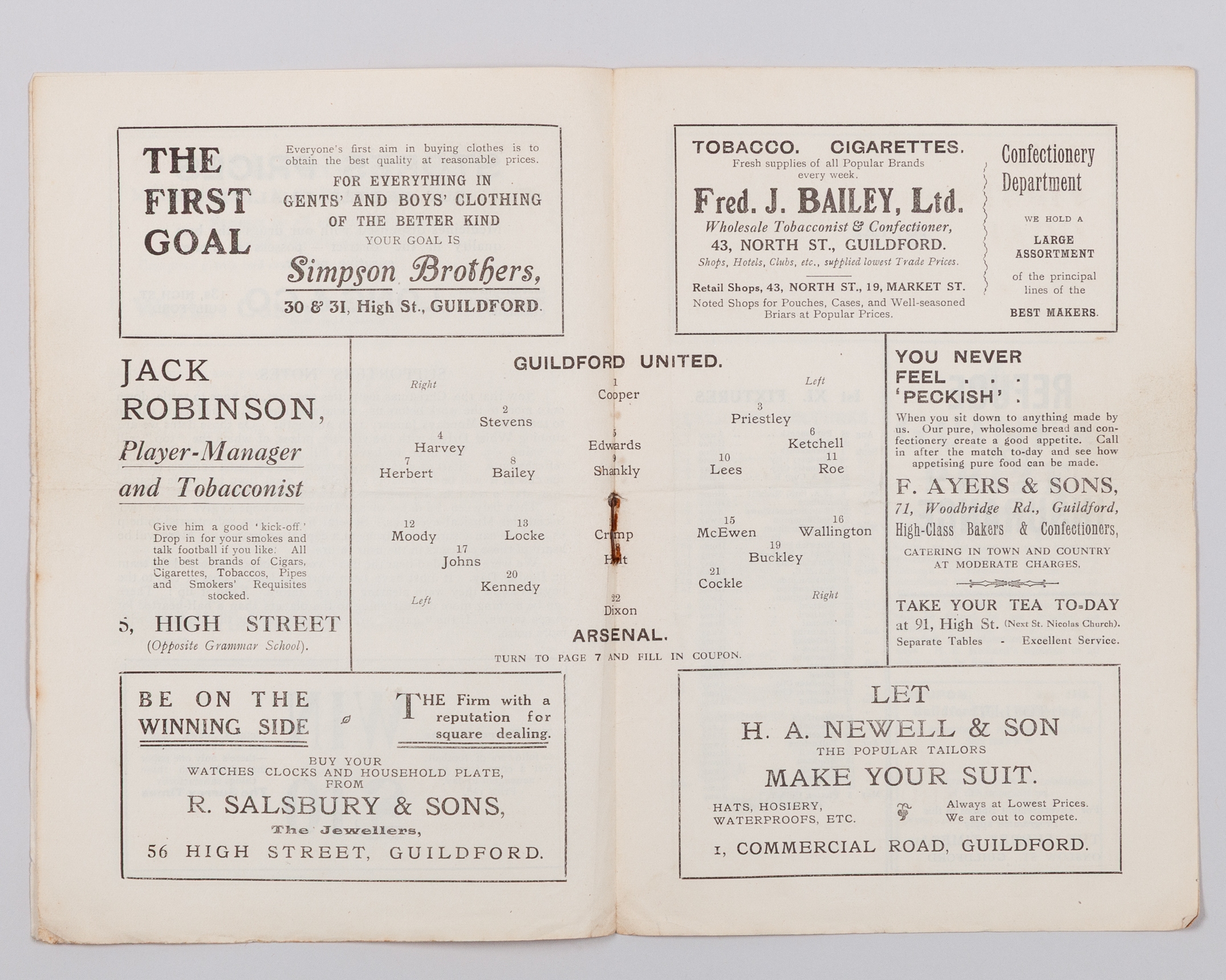 Guildford United v. Arsenal match programme, 29th December 1923, folds