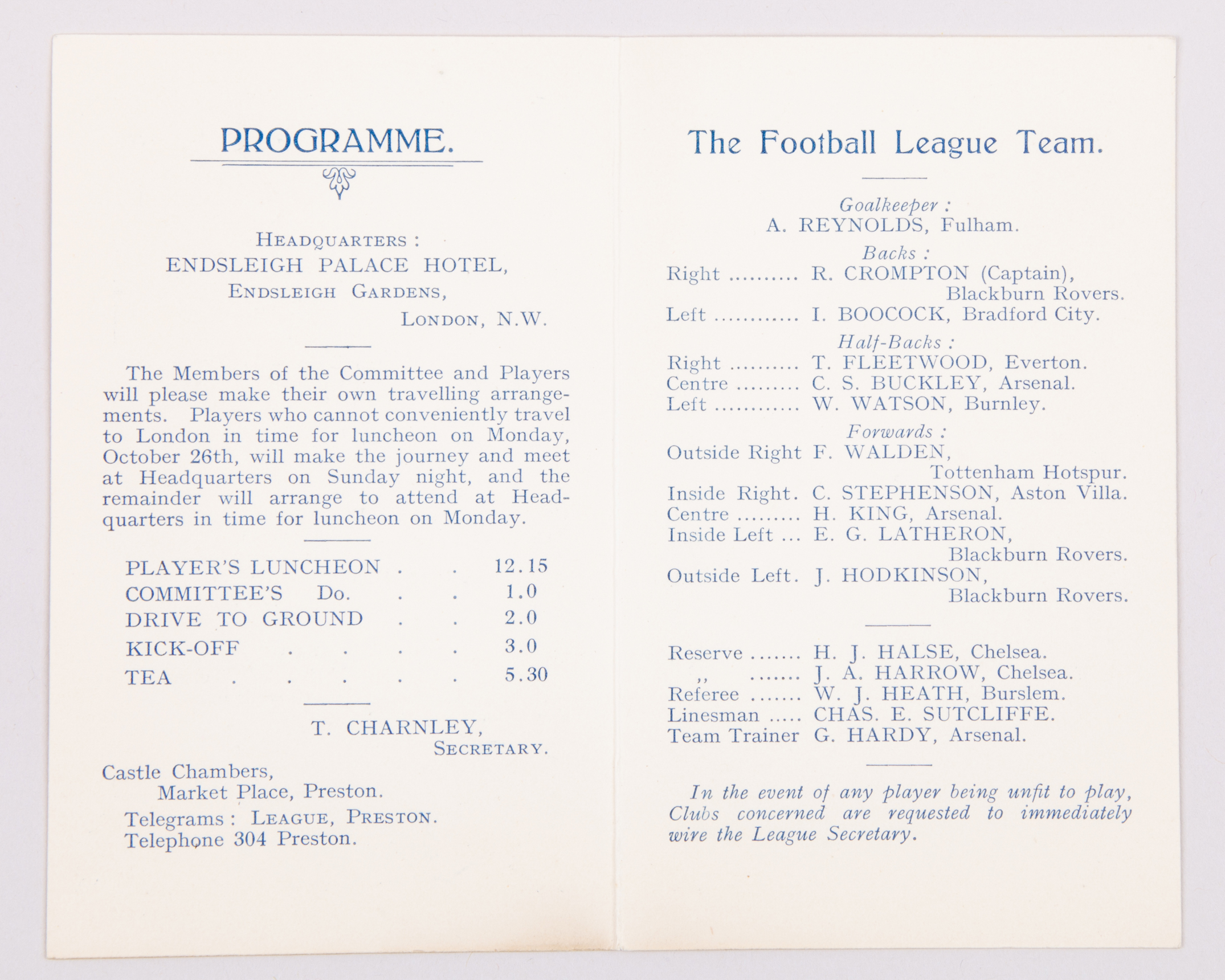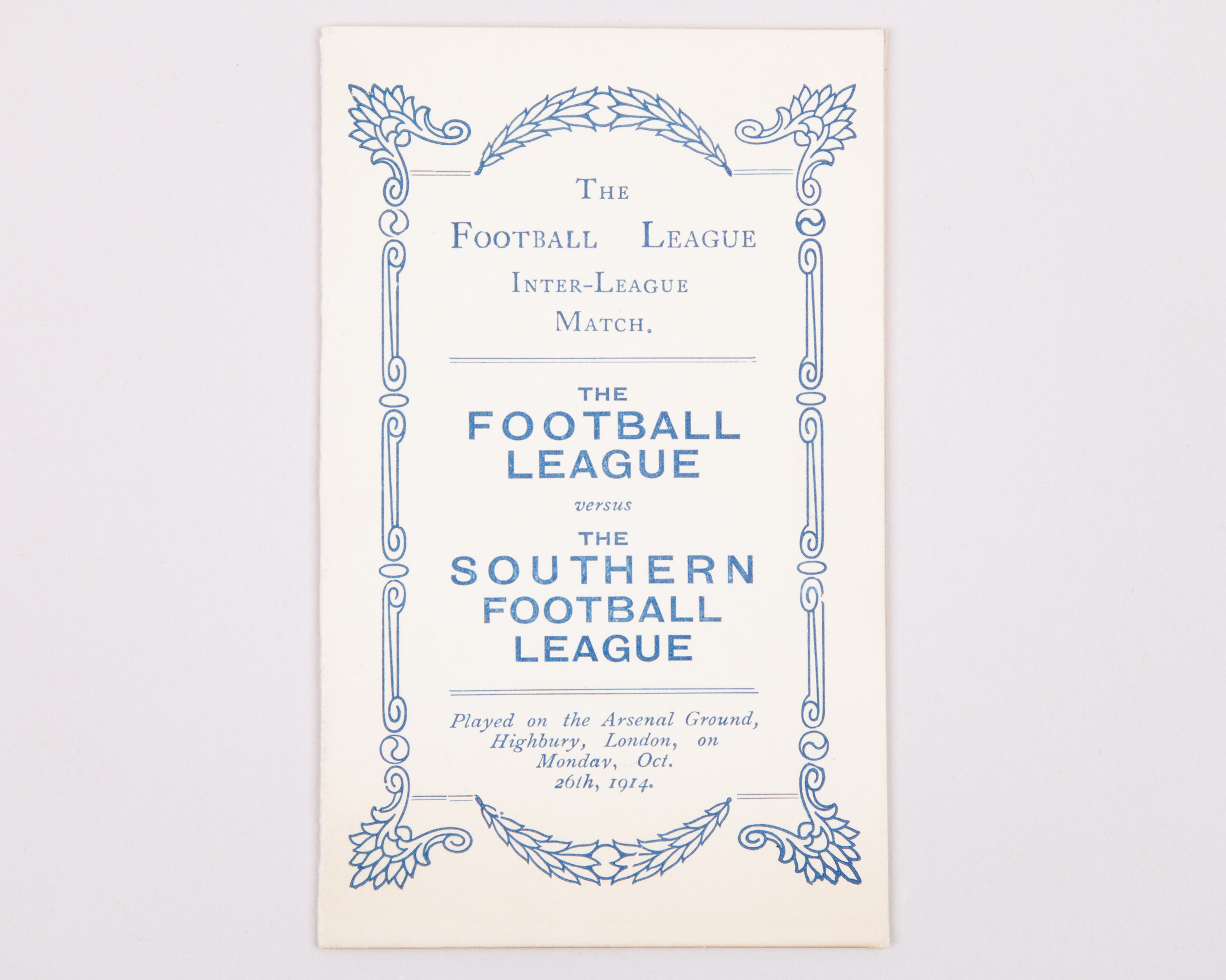 The Football League v. The Southern Football League itinerary, the four page booklet listing the the Football League side, match played at Highbury, 26th October 1914
