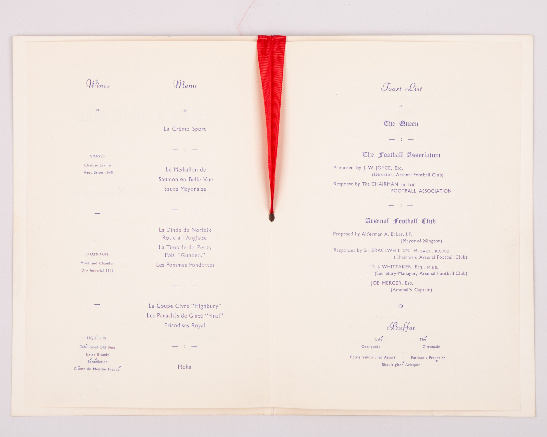 1952 Arsenal autographed menu for the Dinner & Dance to celebrate F.A.Cup, held at the Cafe Royal, 3rd May 1952, the back cover bearing sixteen autographs including Peter Goring, Ernie Collett, Doug Lishman, Ted Drake, Alf Fields, Joe Mercer, Leslie Compton, Denis Compton, Ray Daniels, Lionel Smith, Reg Lewis etc