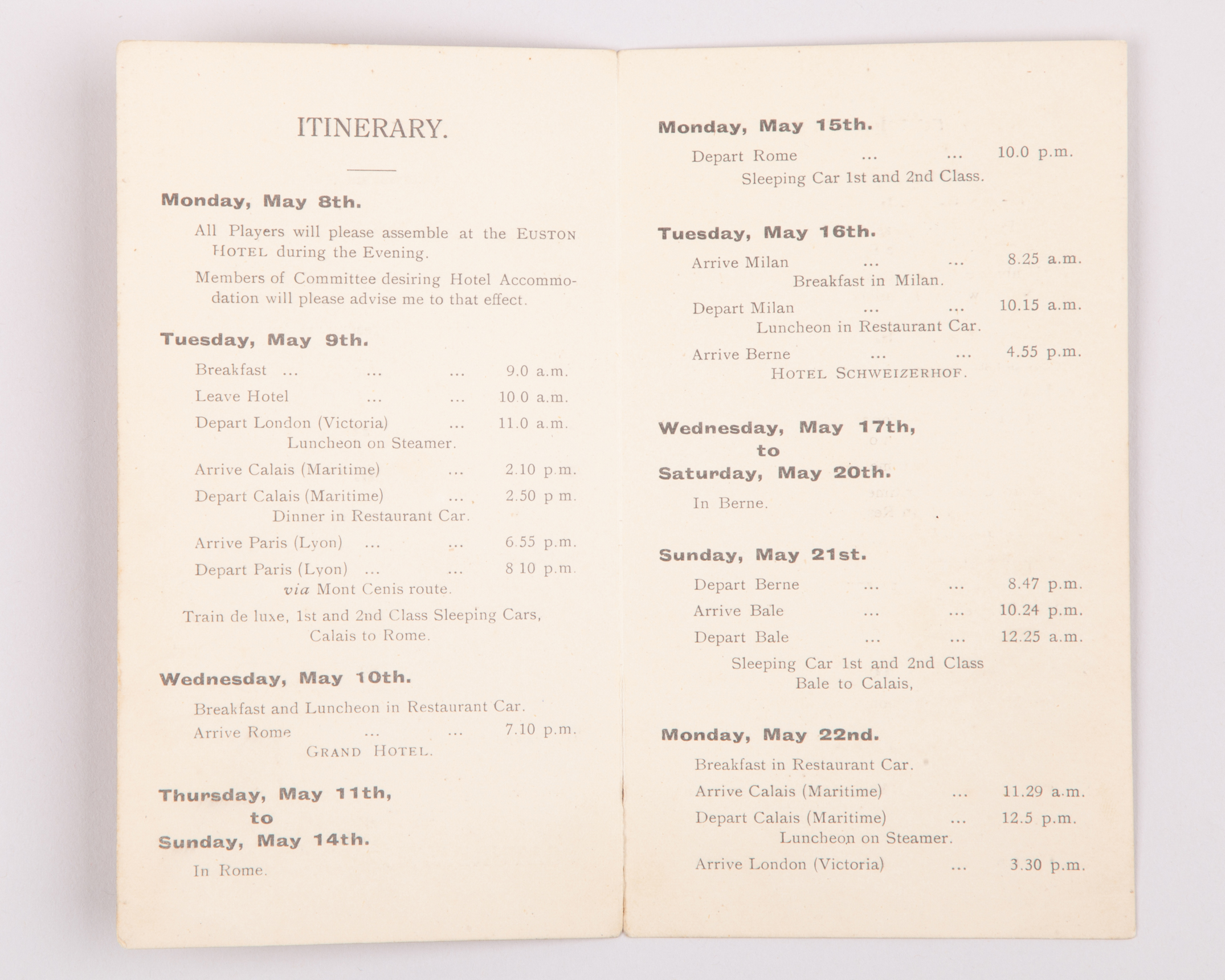 1933 Italy v England and Switzerland v. England autographed four page itinerary