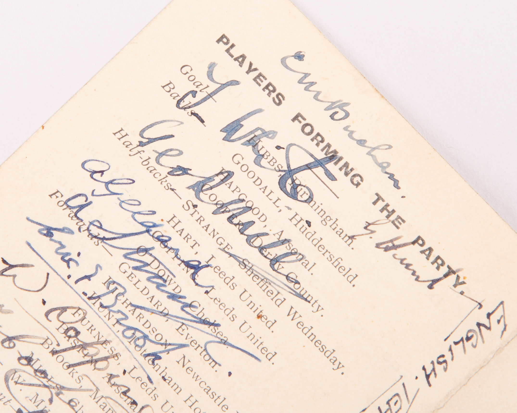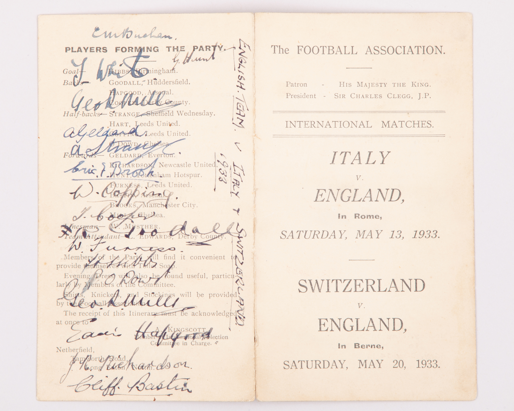 1933 Italy v England and Switzerland v. England autographed four page itinerary, match against Italy played on 13th May in Rome and match against Switzerland played on 20th May in Berne, the card fully autographed by every player who played in either match comprising, Geldard, Brook, Copping, O'Dowd, Hapgood, Richardson, Bastin, Strange, Hibbs, Goodall, Furness, White, also signed by Charles Buchan, Cooper (Derby) and Mills (Chelsea - twice), small tear to base of spine