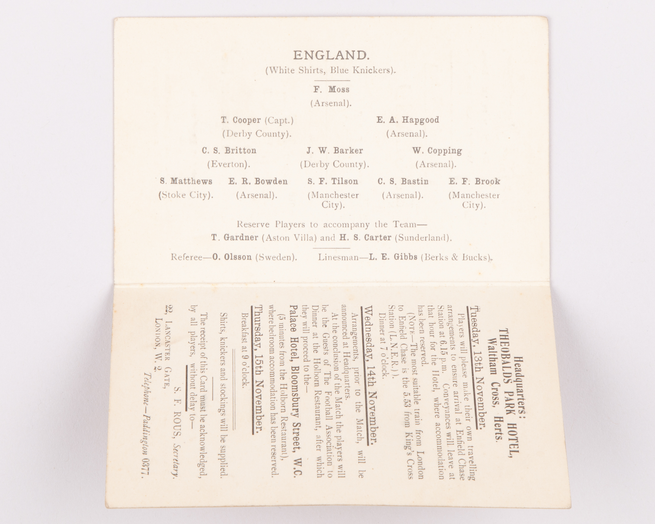 1934 England v. Italy four page itinerary, 14th November 1934