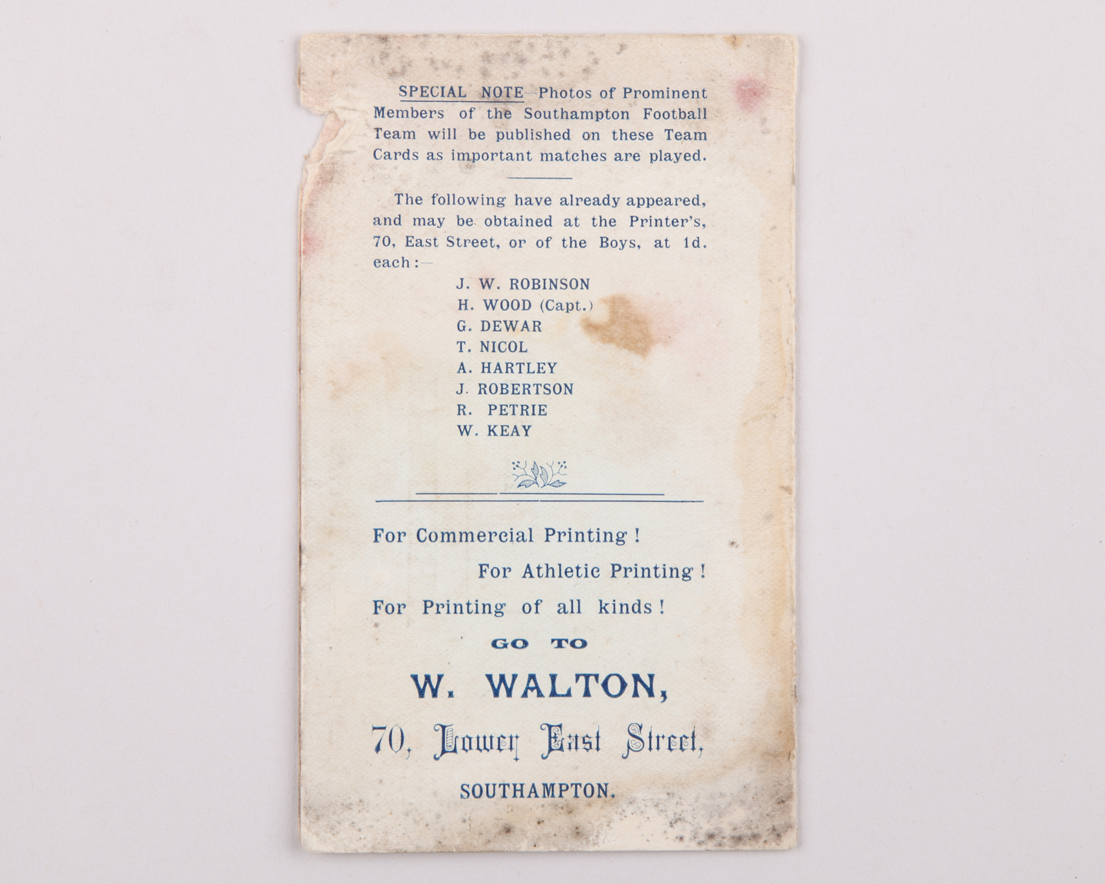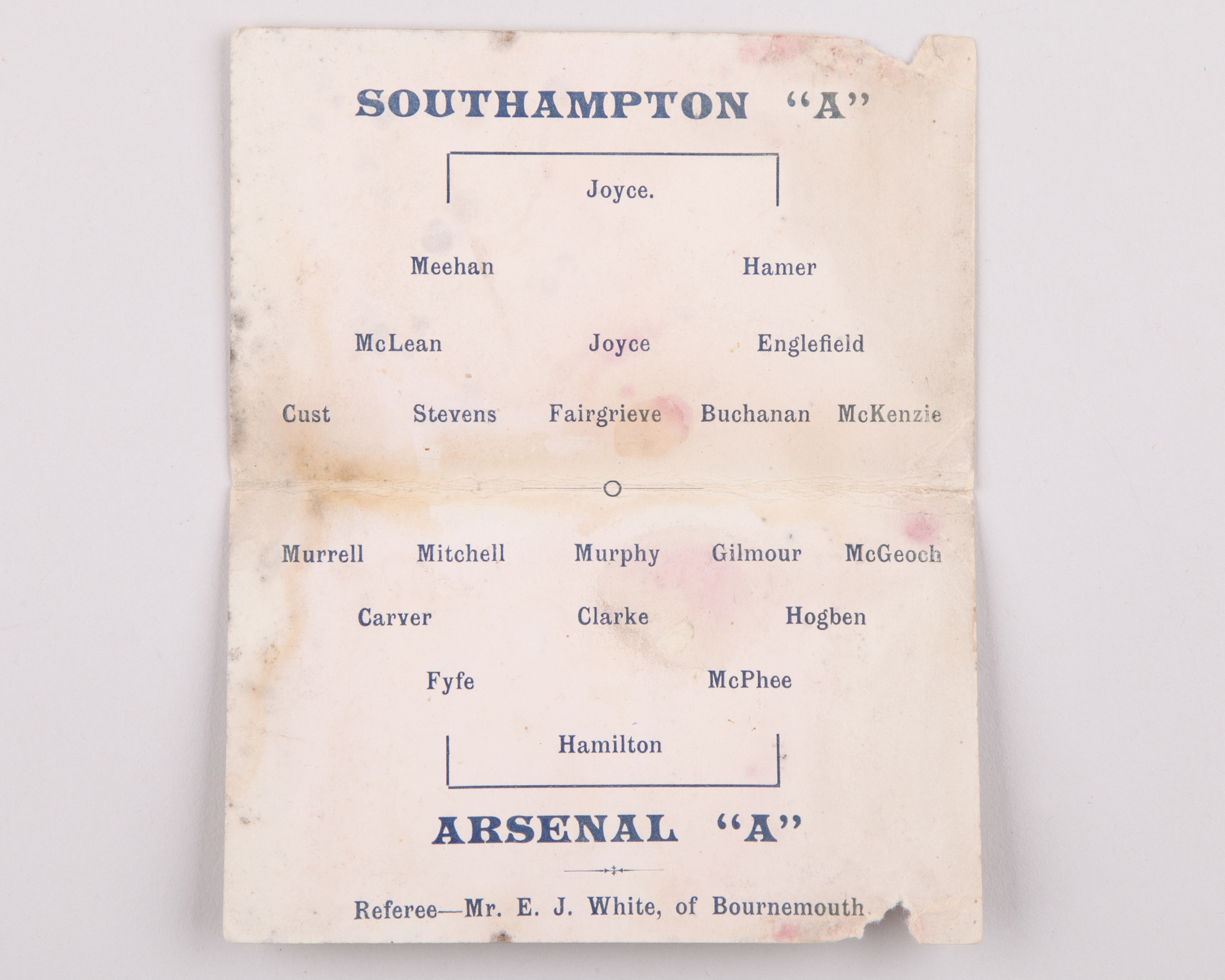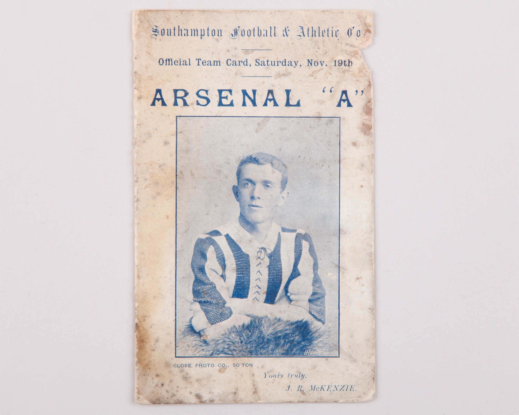 Southampton 'A' v Arsenal 'A' team card programme, 19th November 1898, in the form of a very rare 4-page match card, one of the earliest Southampton programmes known, believed to be a United League fixture, some paper loss to top right hand corner, foxing