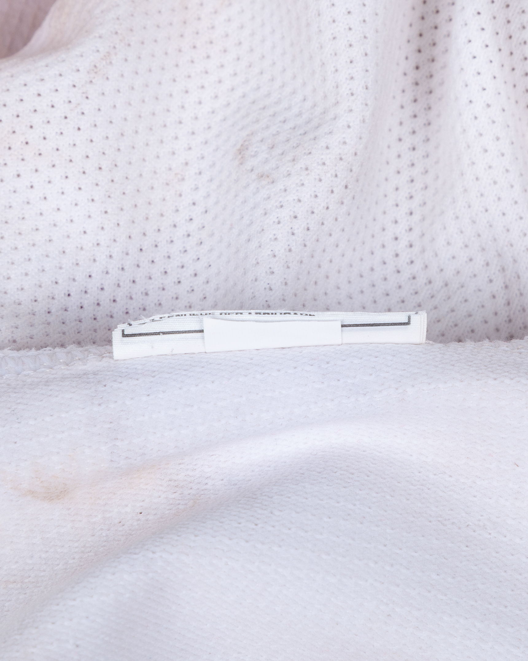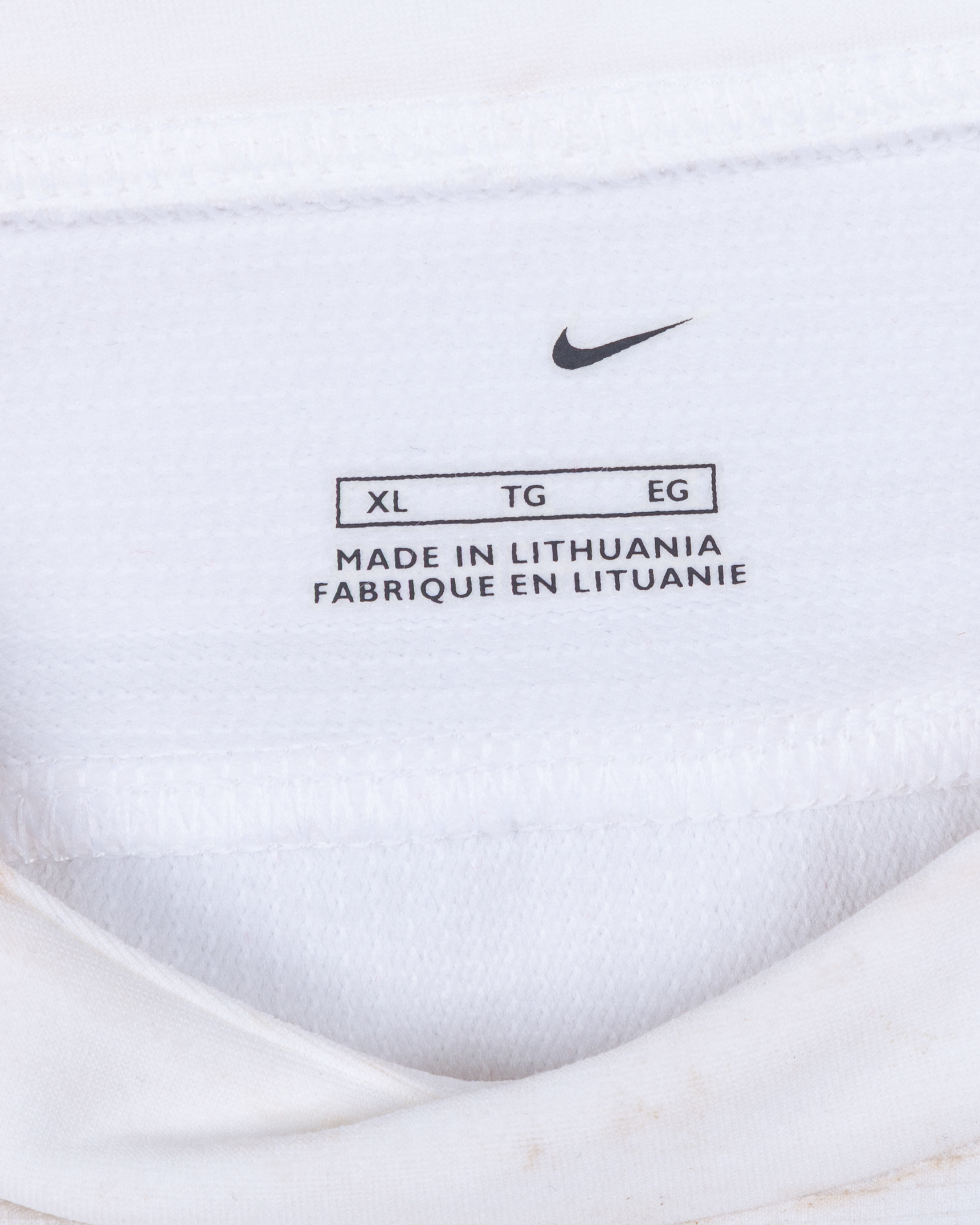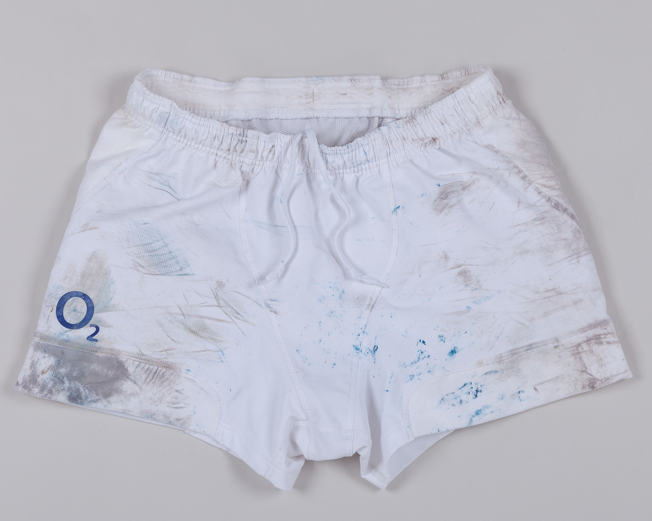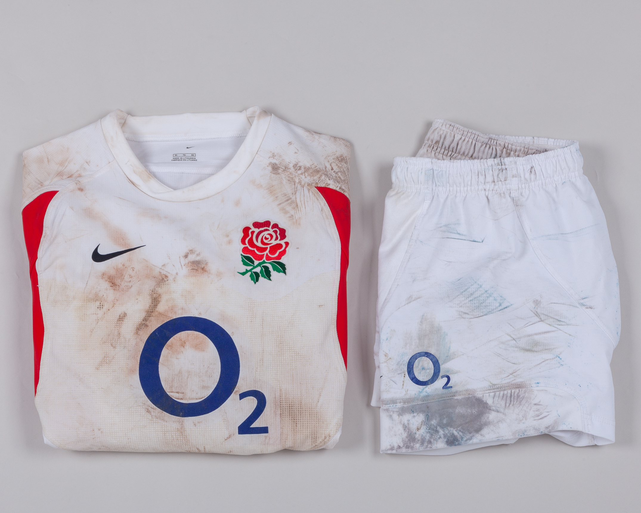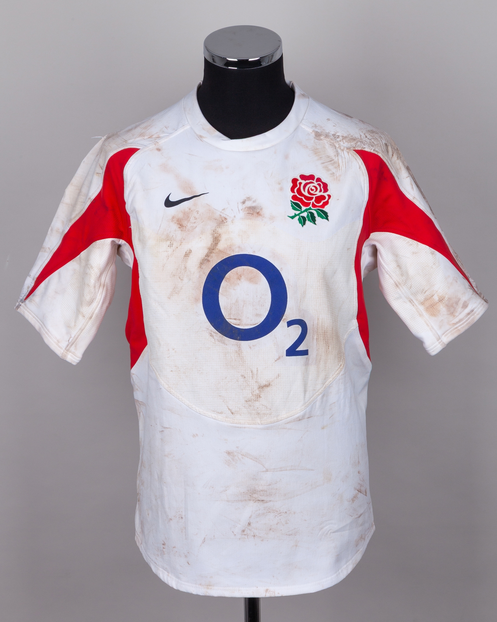 White and red No.7 England rugby union short-sleeved shirt, 2005-06, Nike, XL, with crew-neck collar and felt badge, with staining and discolouration, with matching white rugby shorts, with staining and discolouration (2)