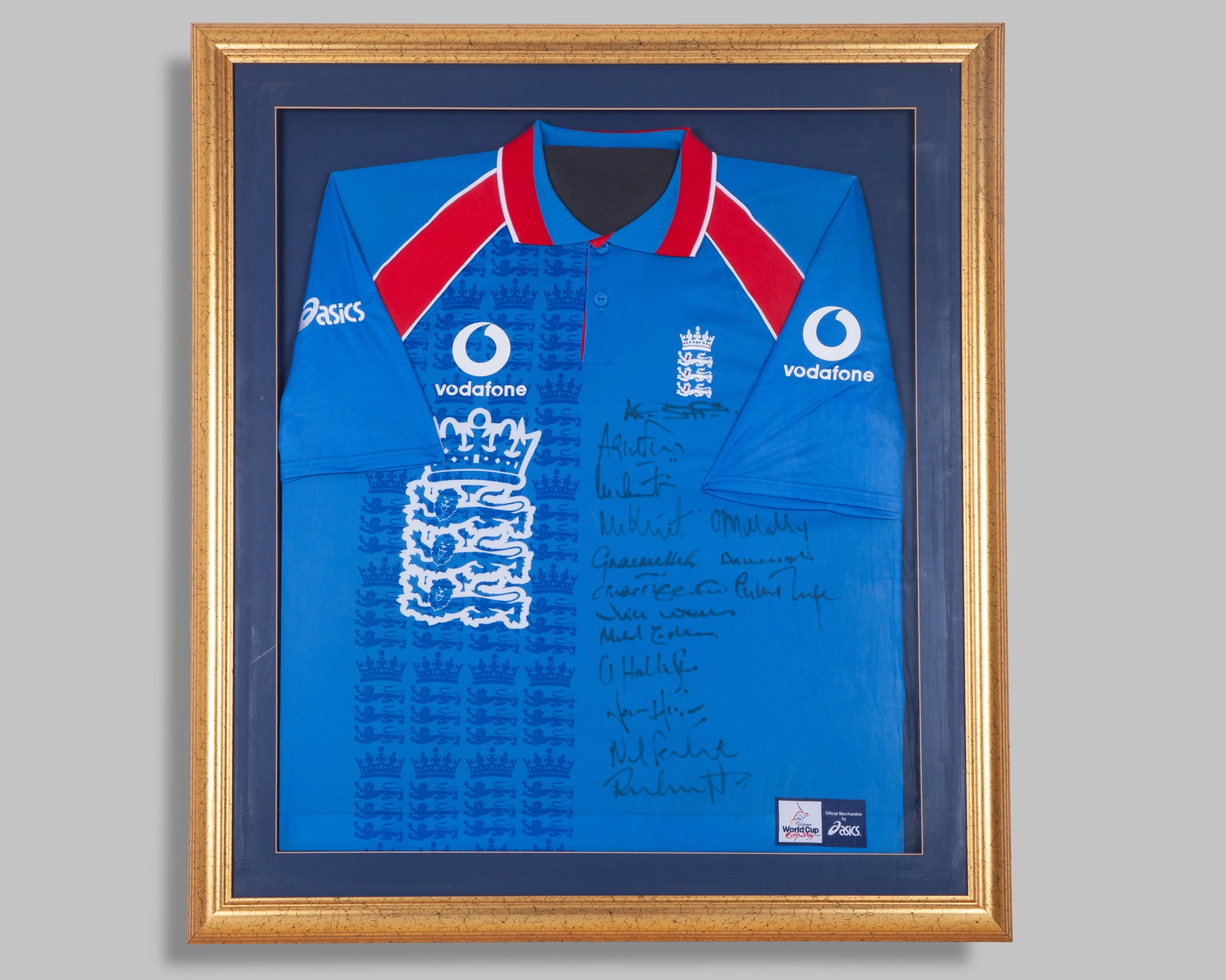 Blue and red England ODI Cricket autographed short-sleeved shirt, 1999, Asics, with button-up collar and embroidered badge, with fifteen autographs including Nasser Hussain, Robert Croft, Angus Fraser, Graeme Hick and Mark Ealham etc., framed and glazed, 84x95cm