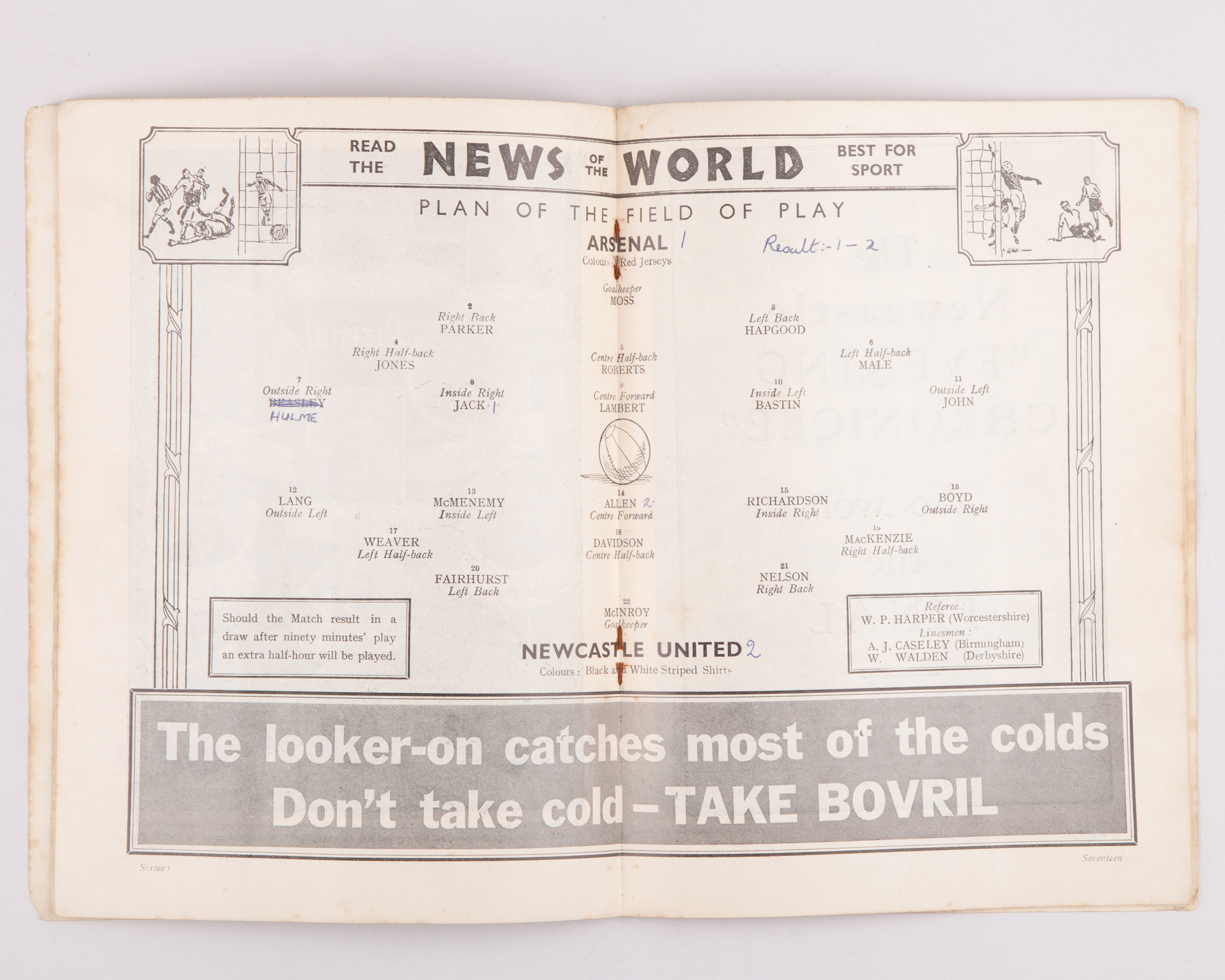 Arsenal v. Newcastle United FA Cup Final programme 23rd April 1932, with foxing, fold crease and annotations to center page