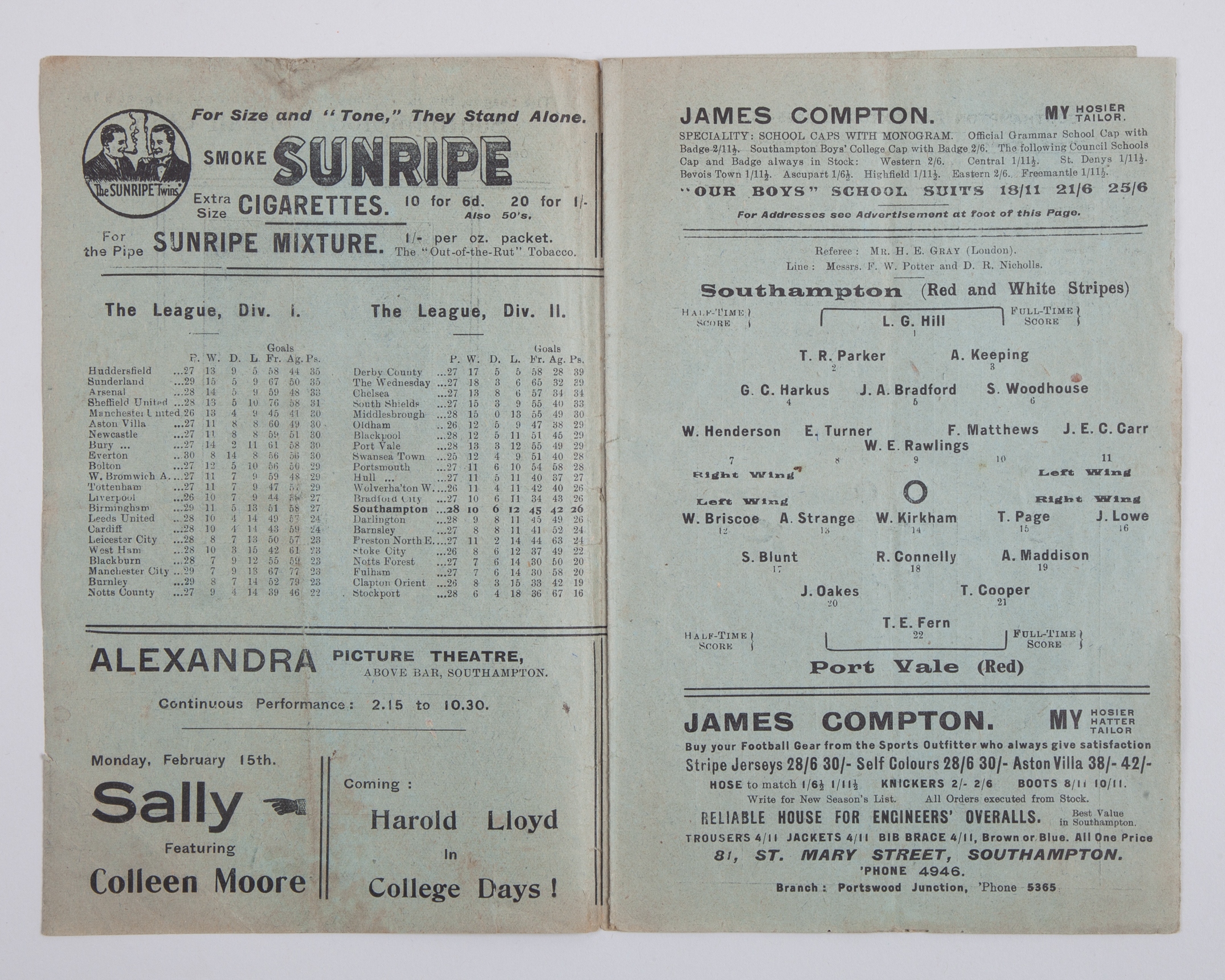 Southampton v. Port Vale match programme, 13th February 1926, with fold creases and discolouration