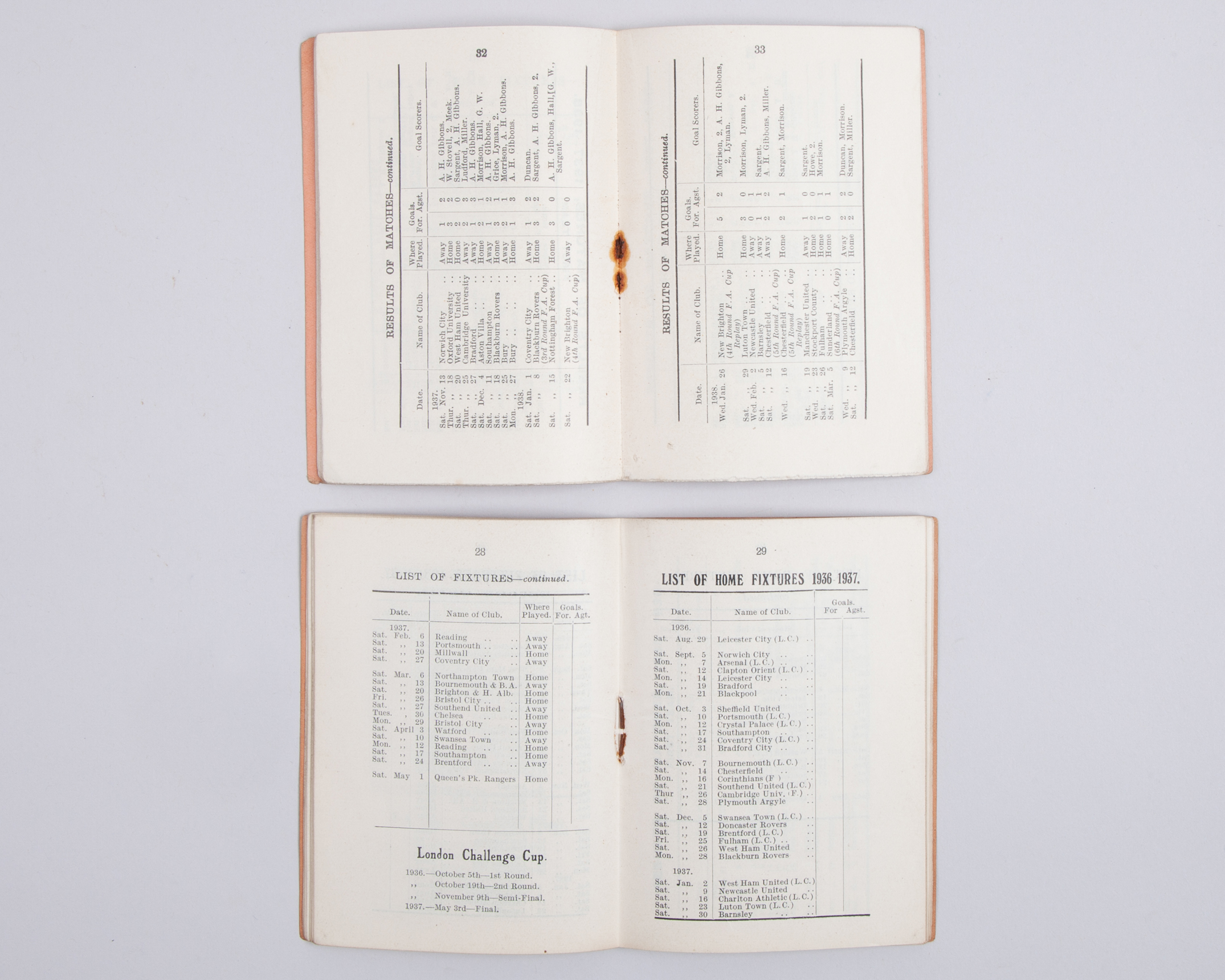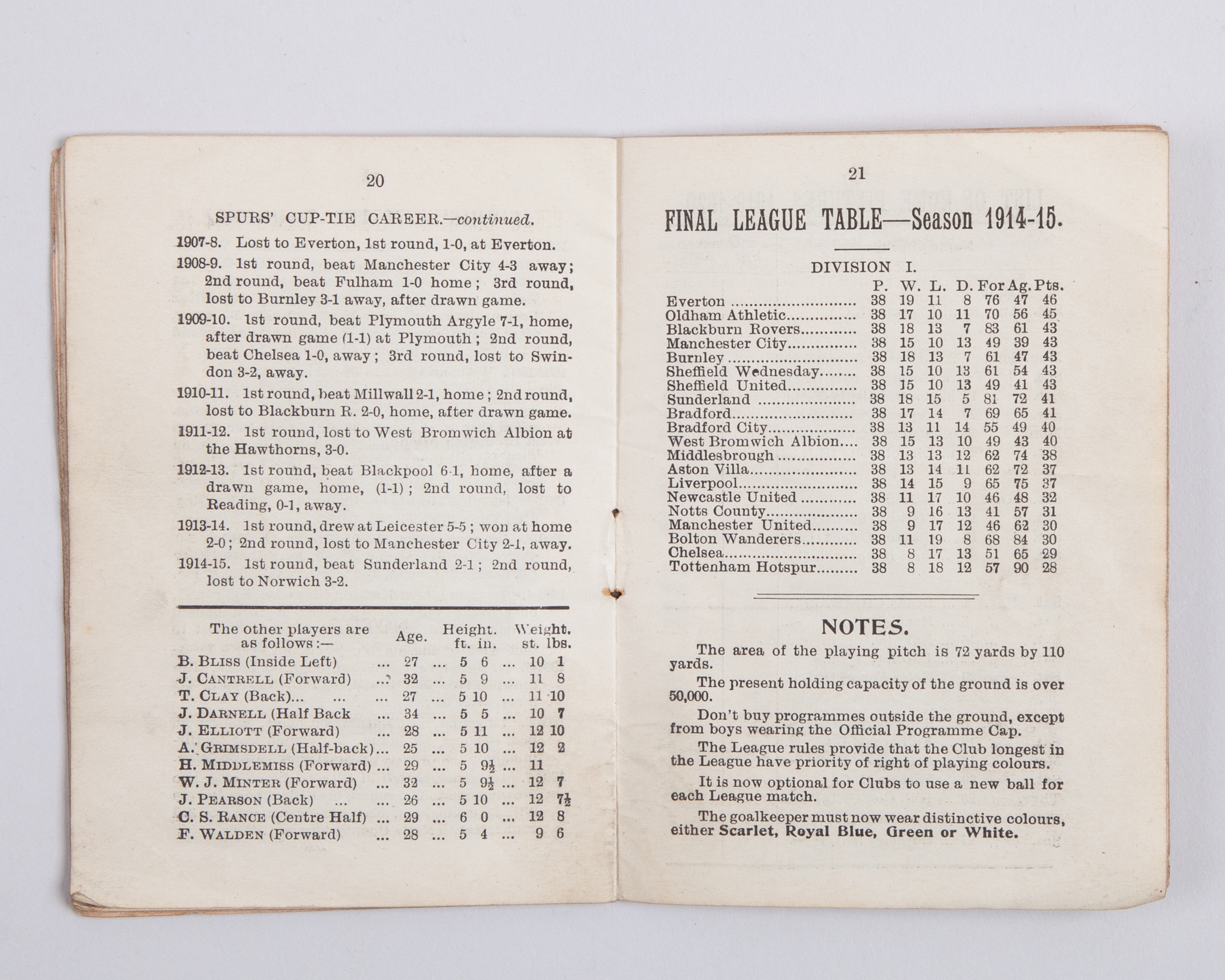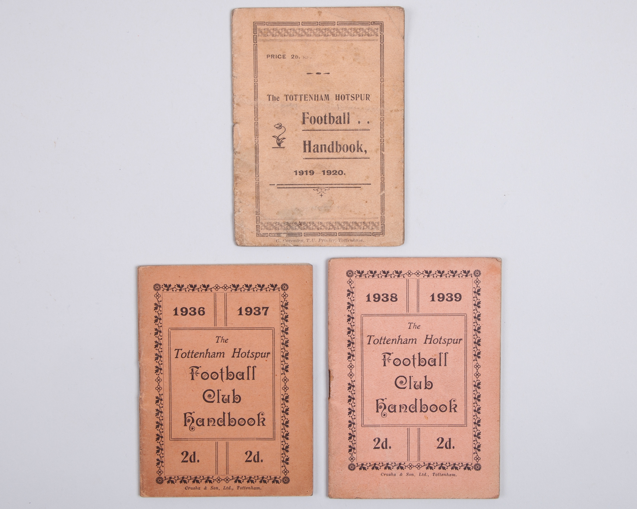 Three Tottenham Hotspur handbooks, 1919-20, 1936-37 and 1938-39, cover stained and slightly faded (3)