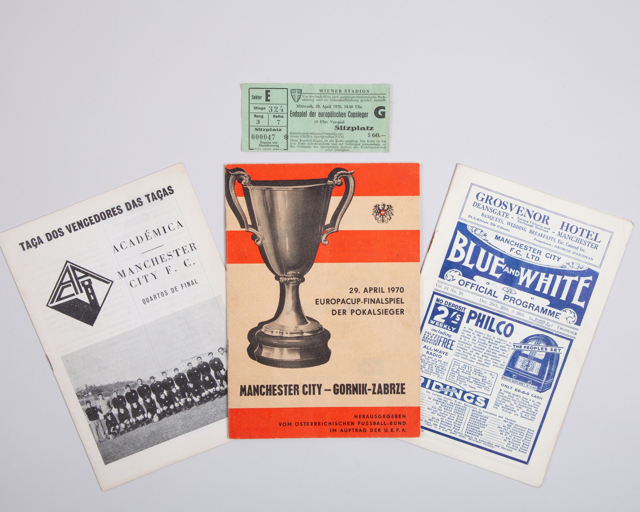 Academica v. Manchester City, Cup Winners Cup quarter-final match programme, 1970, Manchester City v. Middlesbrough, Bury Reserves and Grimsby Town combined match programme, 25, 26 and 27th December 1936 and Gornik Zabrze v. Manchester City match programme and ticket, 29th April 1970 (4)